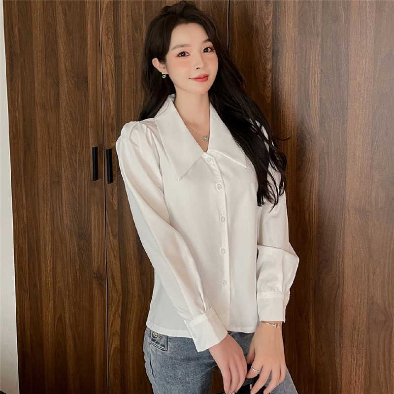 봄 가을 긴 소매 플러스 사이즈 홍콩 스타일 바닥 셔츠, 옷깃 퍼프 소매 셔츠 겨울을위한 간단한 흰색 셔츠스토어 가기