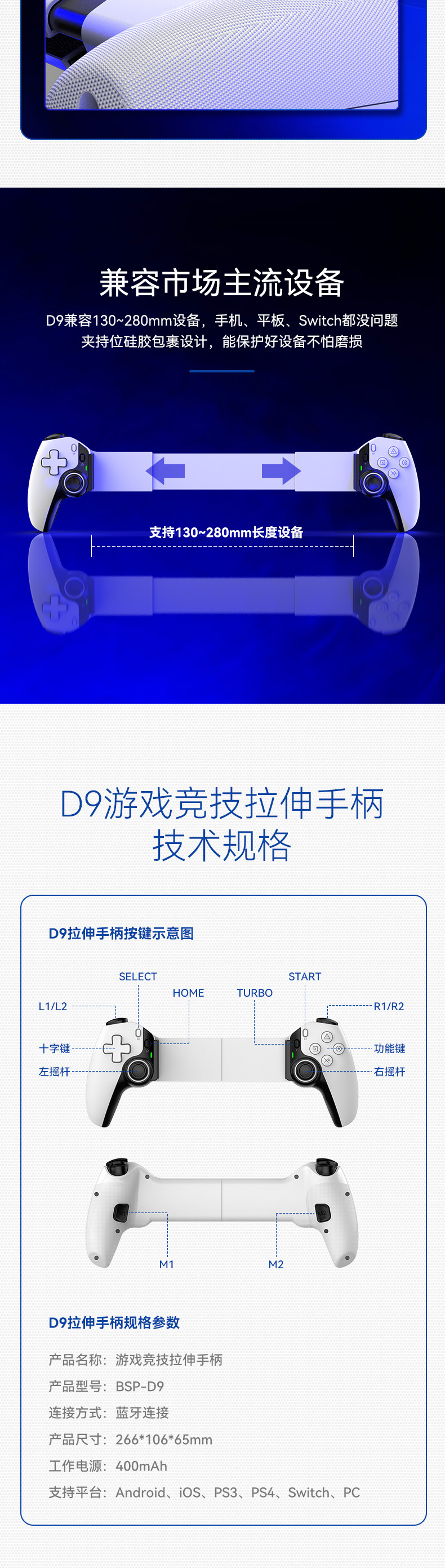 8.可拉伸支持手机、平板、Switch设备,支持拉伸到130~280mm长度。