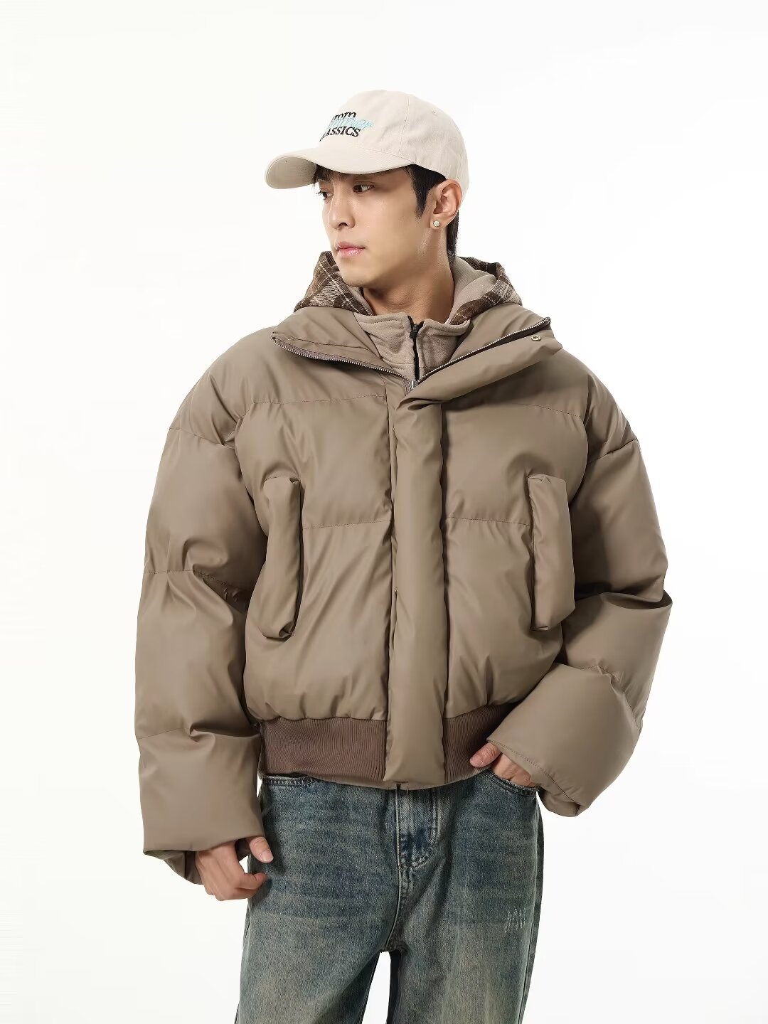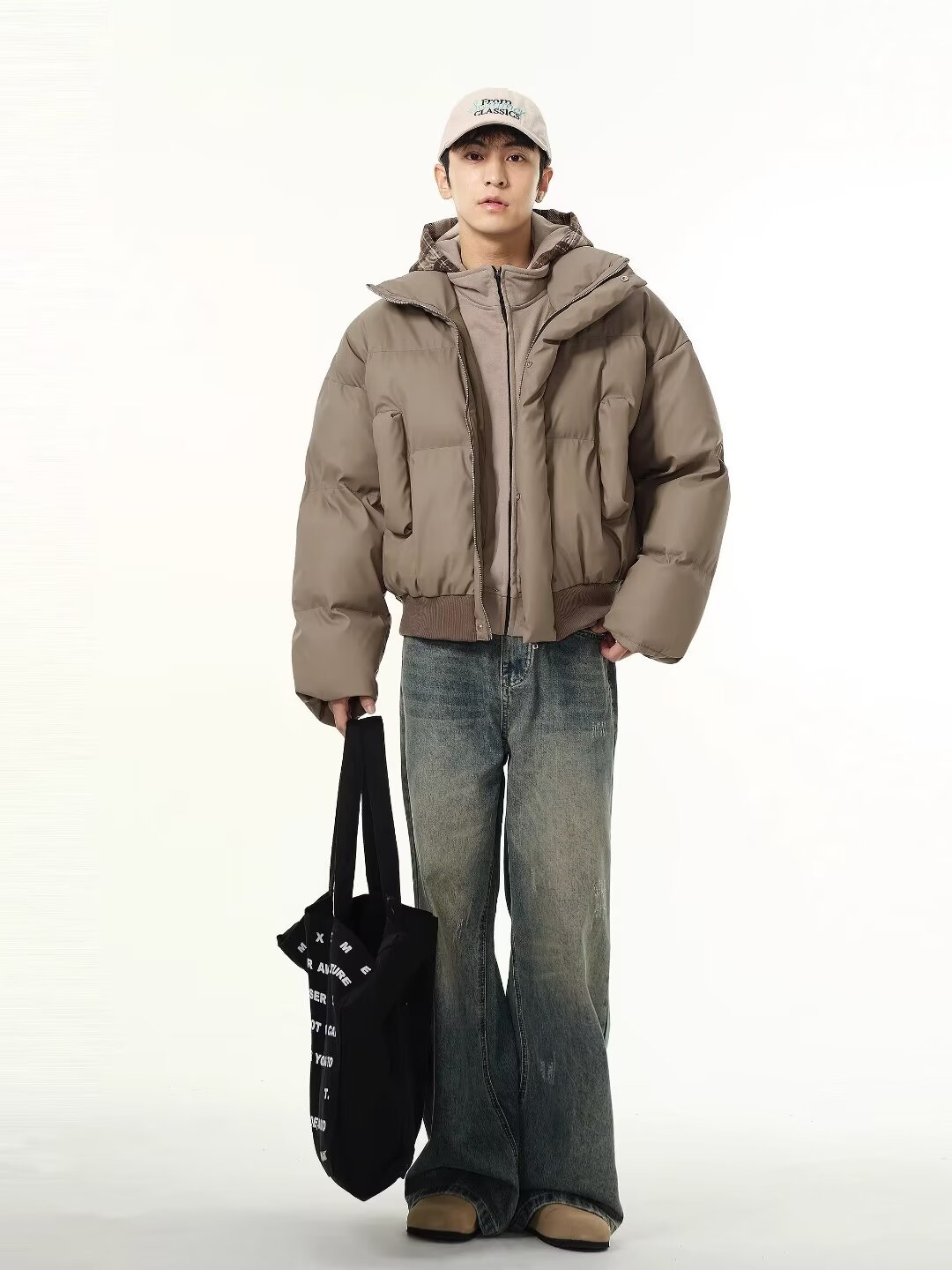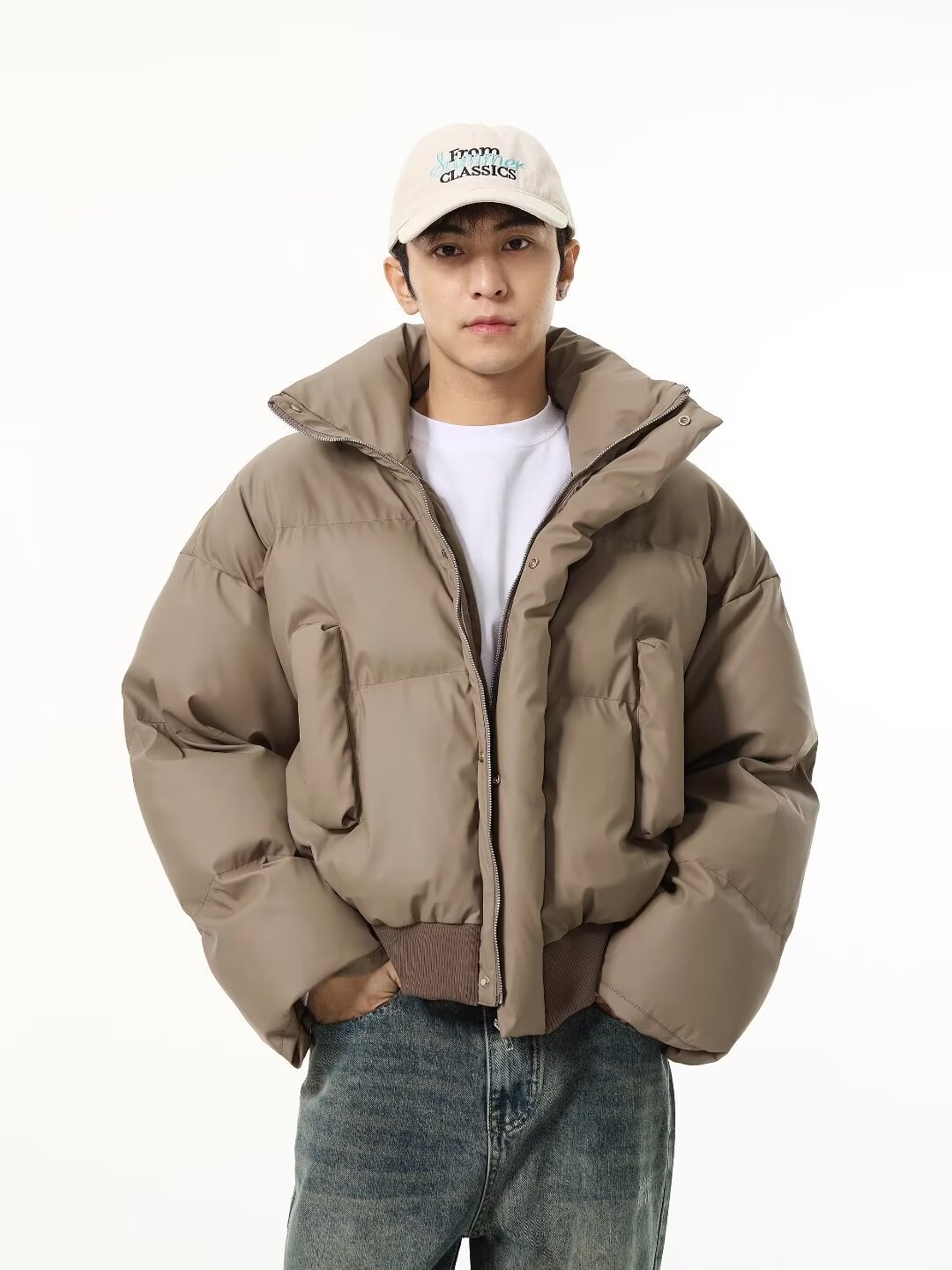 2024 새로운 미국 겨울 복고풍 짧은면 패딩 코트 남성의 세련된 고급 디자인은 연인을위한 두꺼운 다크 브라운 코트스토어 가기