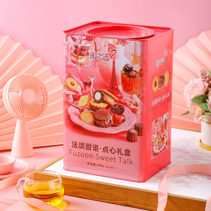 Mingzhixuan fassong 달콤한 디저트 600g 선물 상자 철 통조림 새해 걷는 친척 핸드백과 비스킷