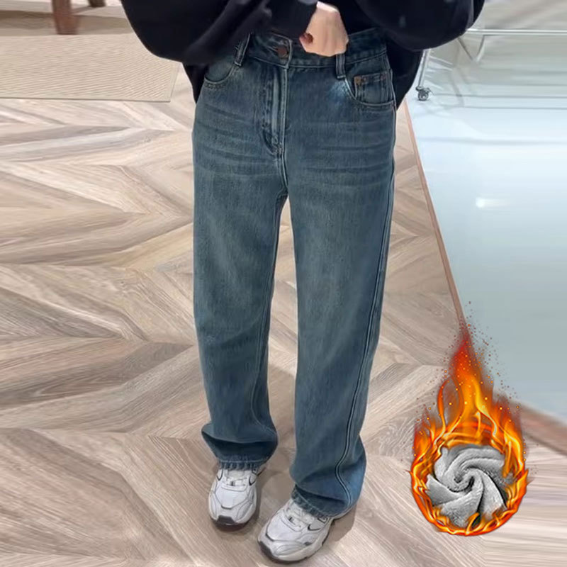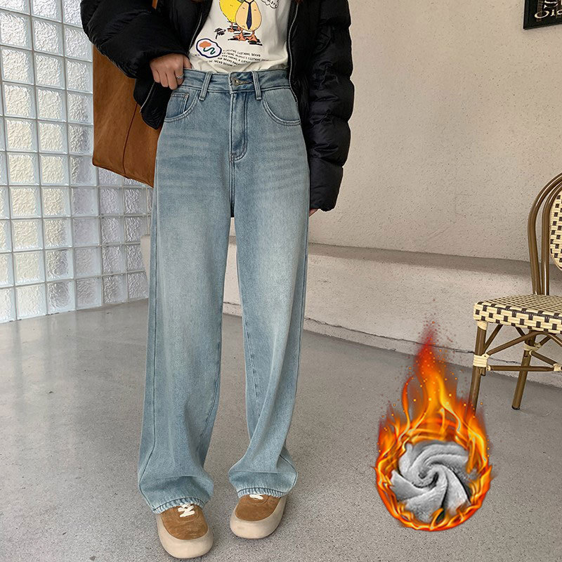 기모 따뜻한 스트레이트 청바지 여성용 겉옷 고기-좁은 배 모양의 높은 허리 걸레 두껍게 된 넓은 다리 바지