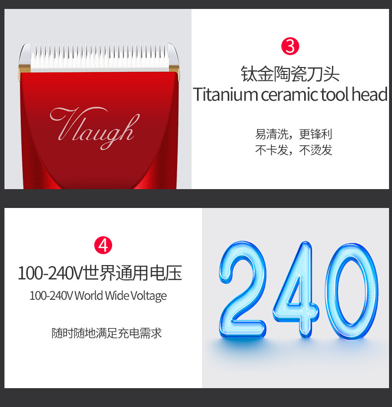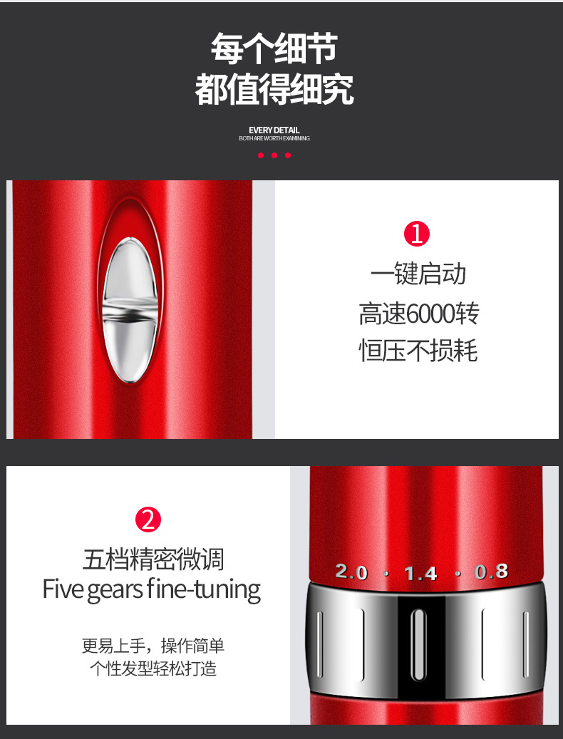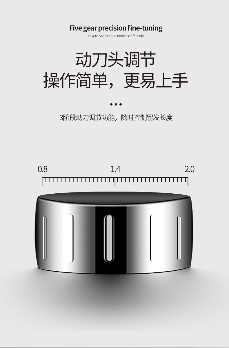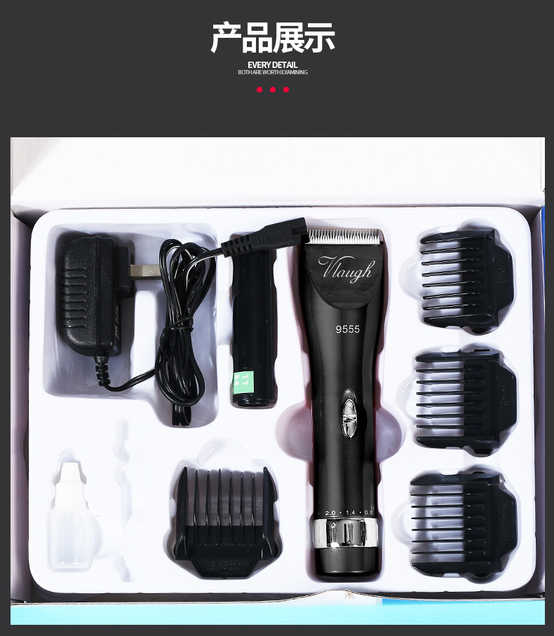 产品配件:包装盒,说明书,4个定位梳,一个充电器, 一瓶润滑油,一只清洁刷。