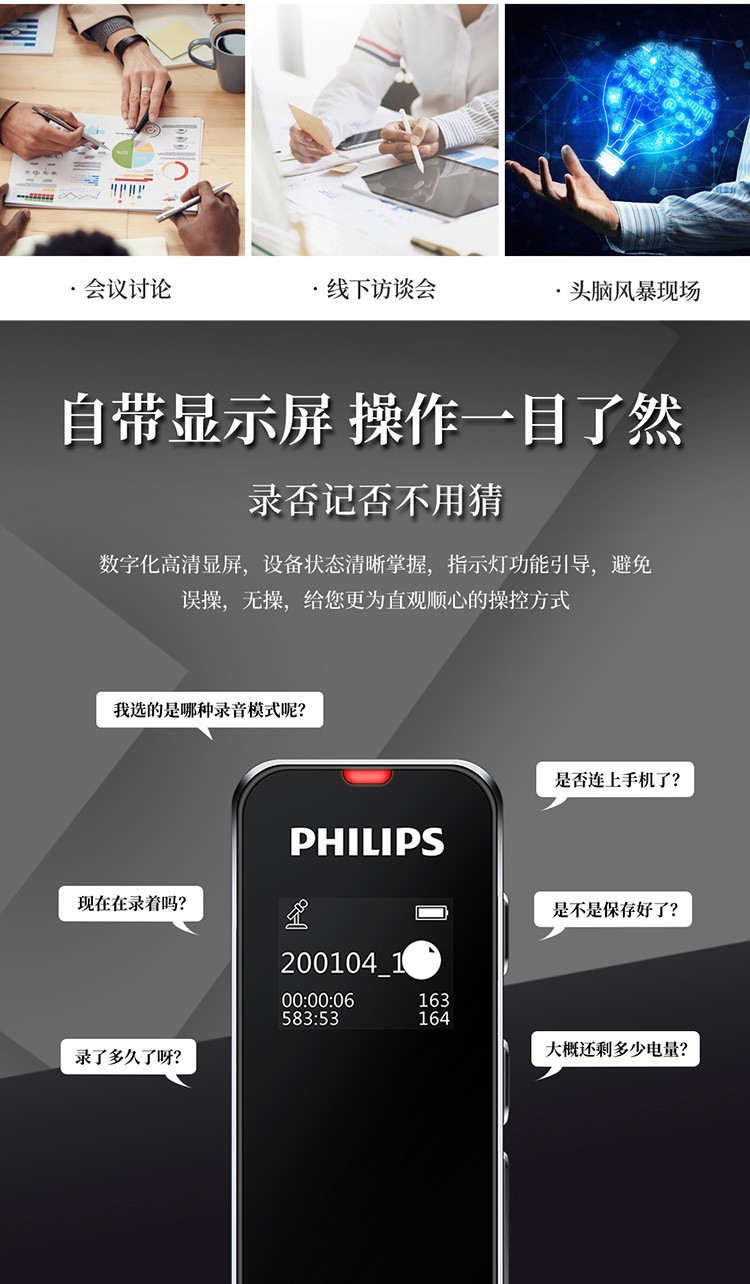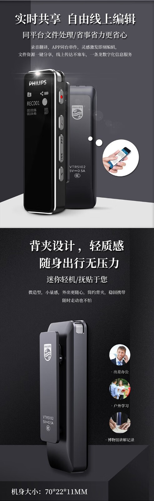 필립스 VTR5102 컨퍼런스 레코더 음성 텍스트 지능형 APP 음성 패턴 HD 소음 감소 울트라 롱 대기스토어 가기