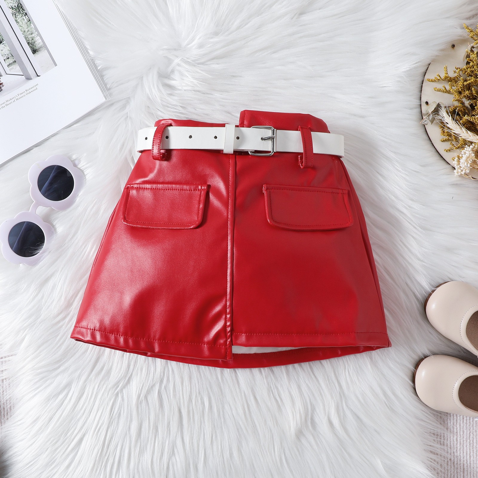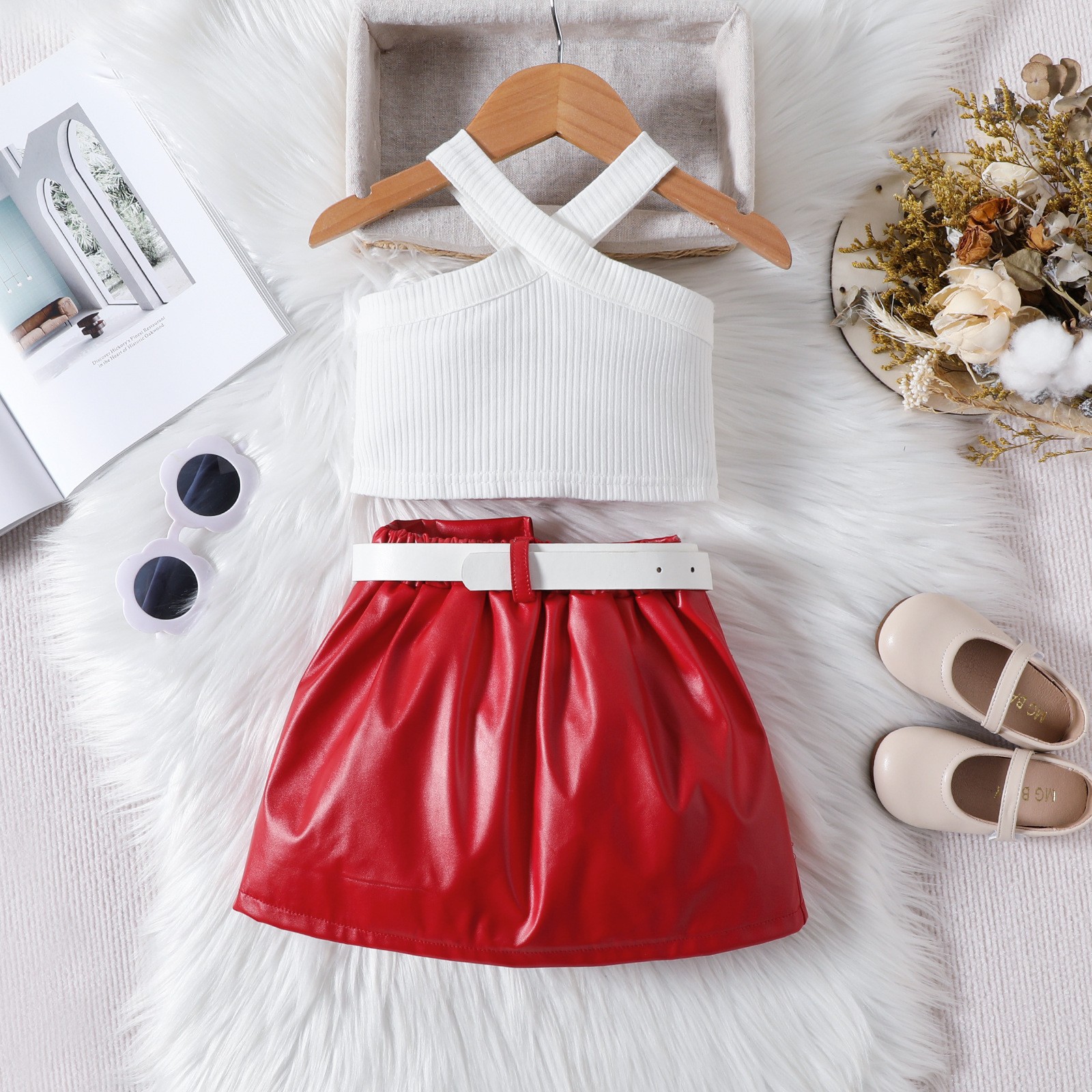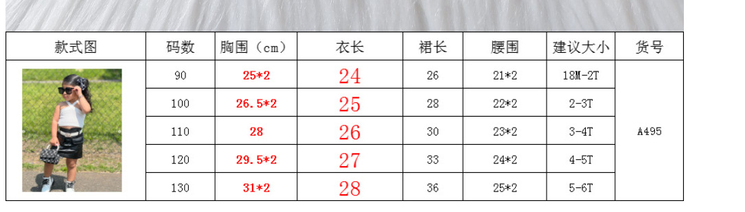 Baopin 아동복 유럽과 미국 어린이 여름 크로스 스트랩 어깨 조끼 탑 PU 가죽 짧은 스커트 벨트 3 피스 세트