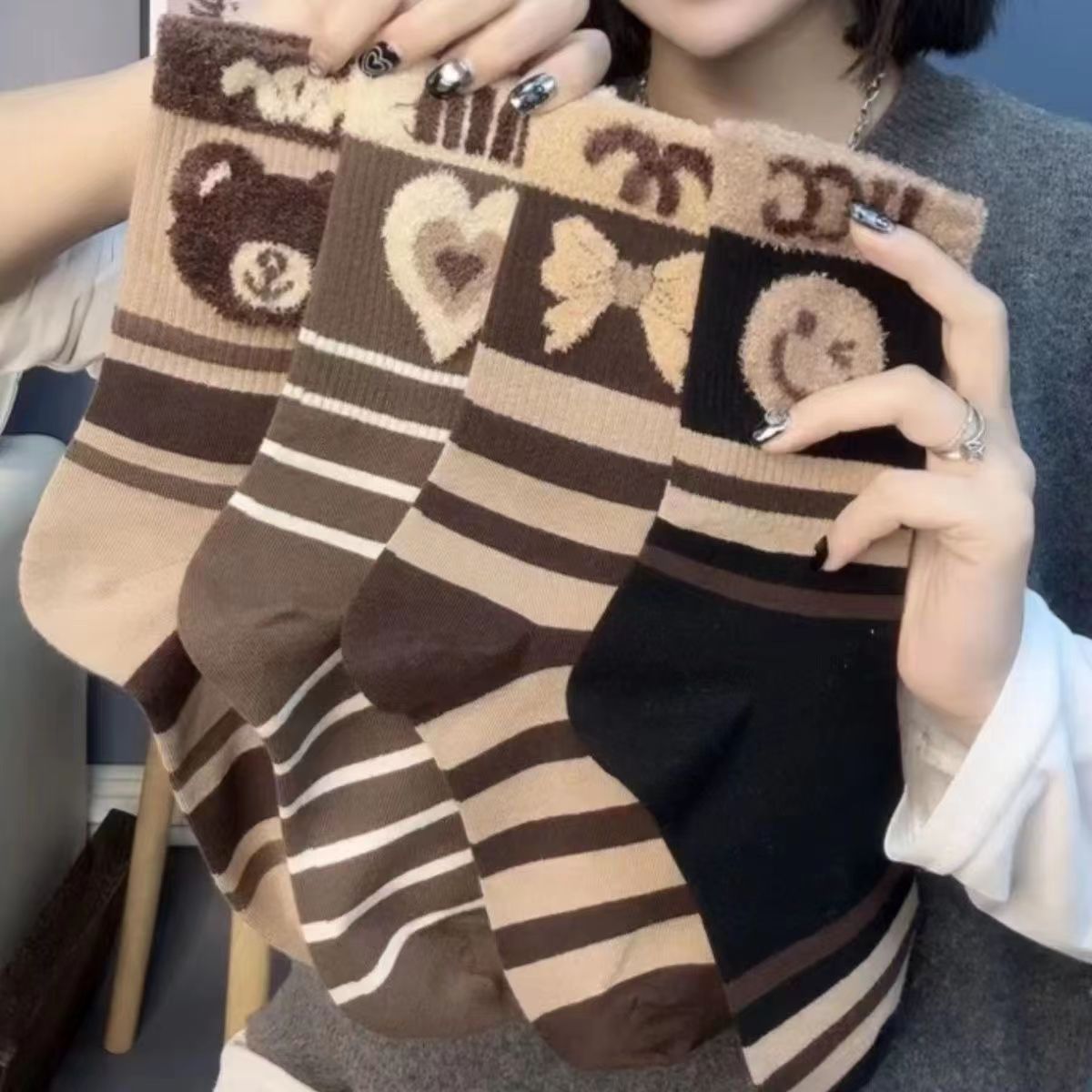 秋冬季袜子女中筒袜女咖系条纹休闲袜堆堆袜女女士袜子批发诸暨市