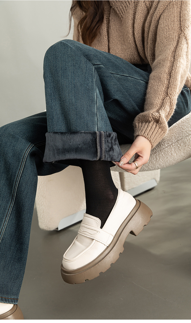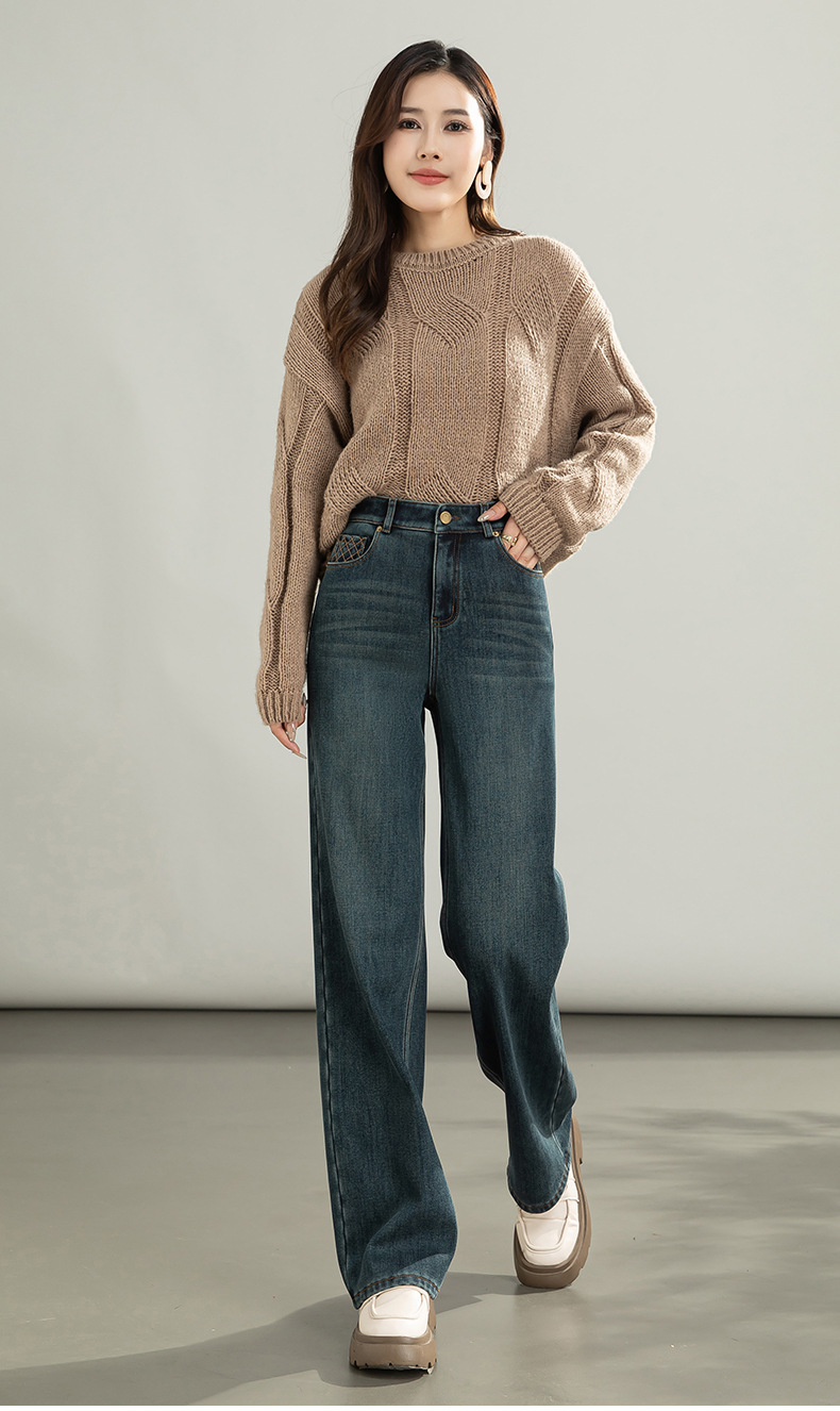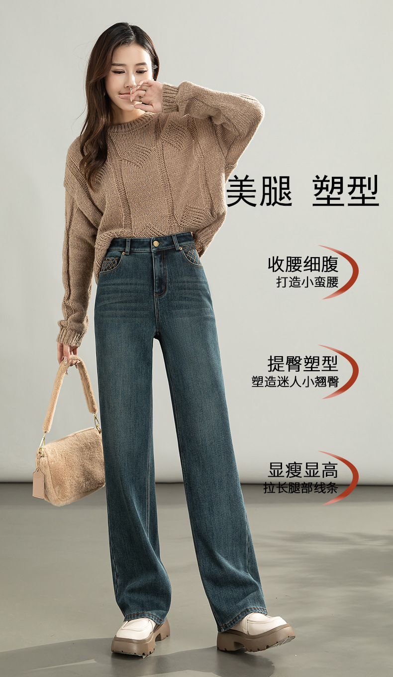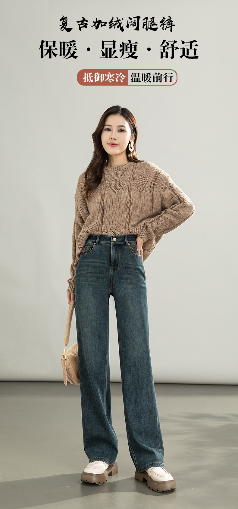 2023 겨울 새로운 자수 복고풍 청바지 여성의 한국식 하이 허리 복합 벨벳은 향수를 불러 일으키는 넓은 다리 바지 8061