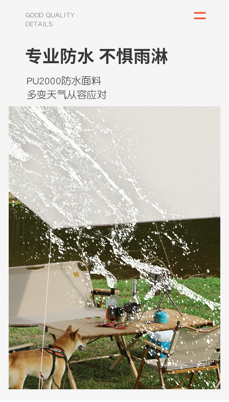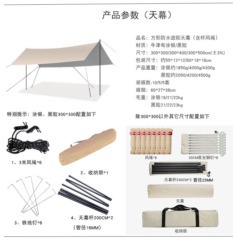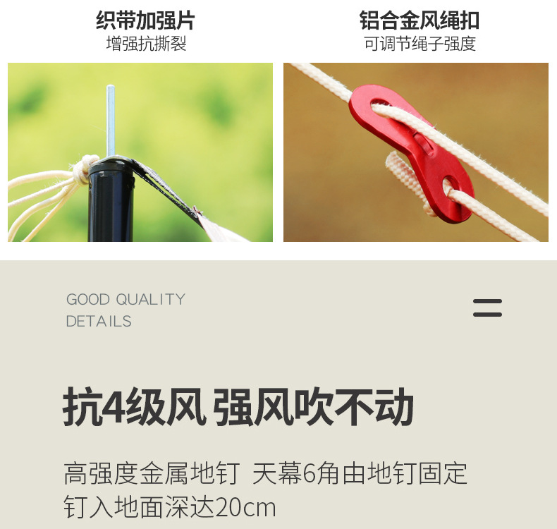 配件:收纳袋1只,铝地钉6枚,黑白风绳加风绳6根