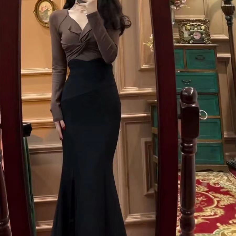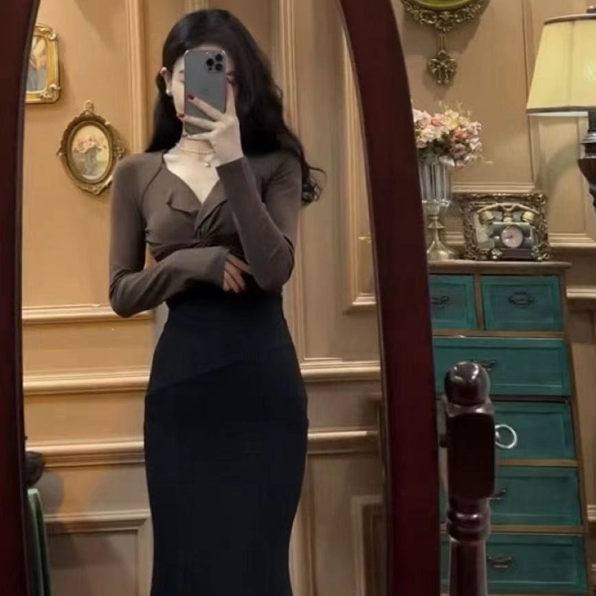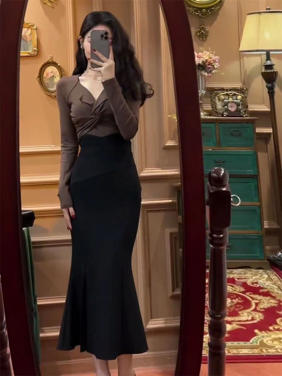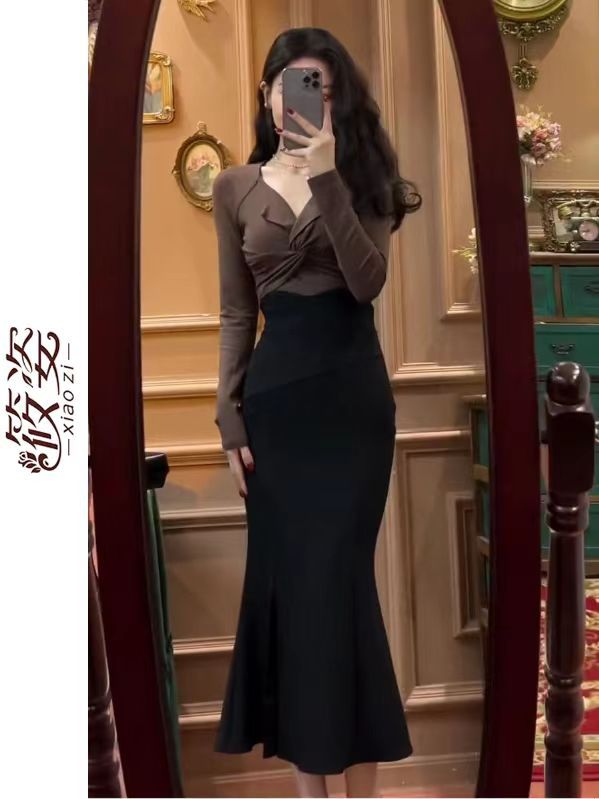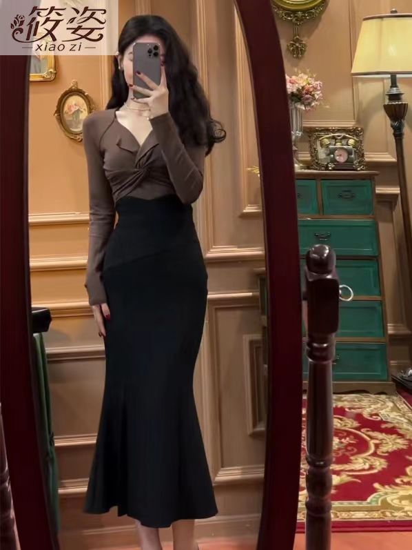 한국 정장 여성 2025 새로운 트위스트 긴팔 탑 + 슬릿 피쉬테일 스커트 서양식 투피스 세트스토어 가기
