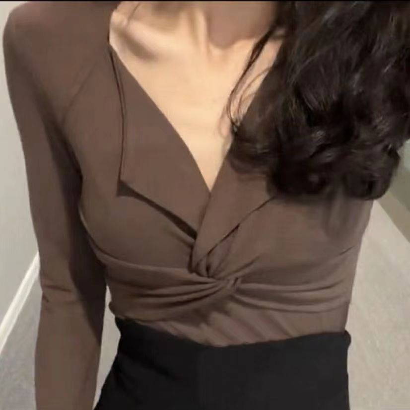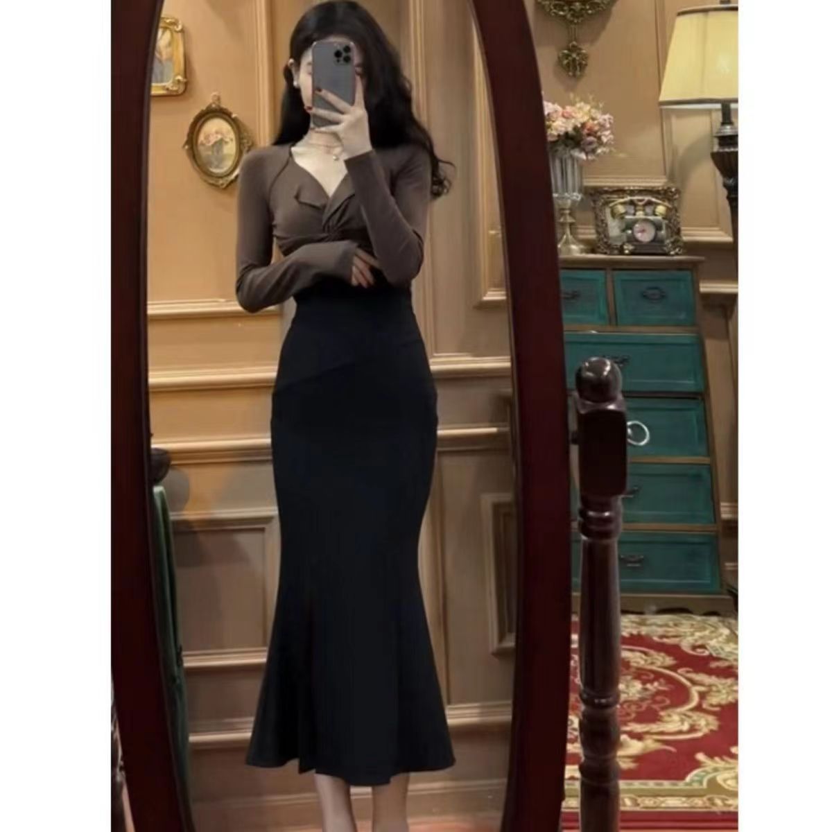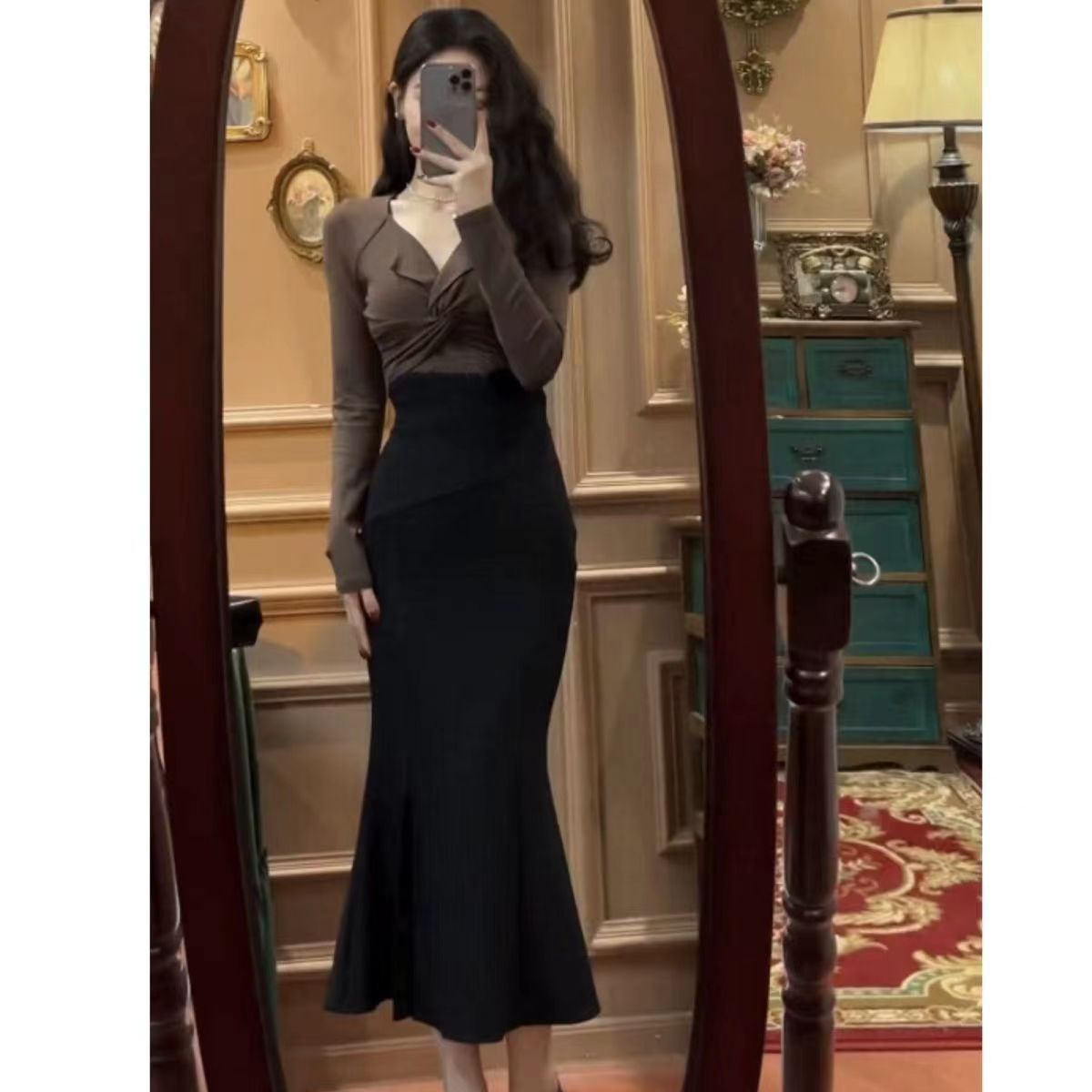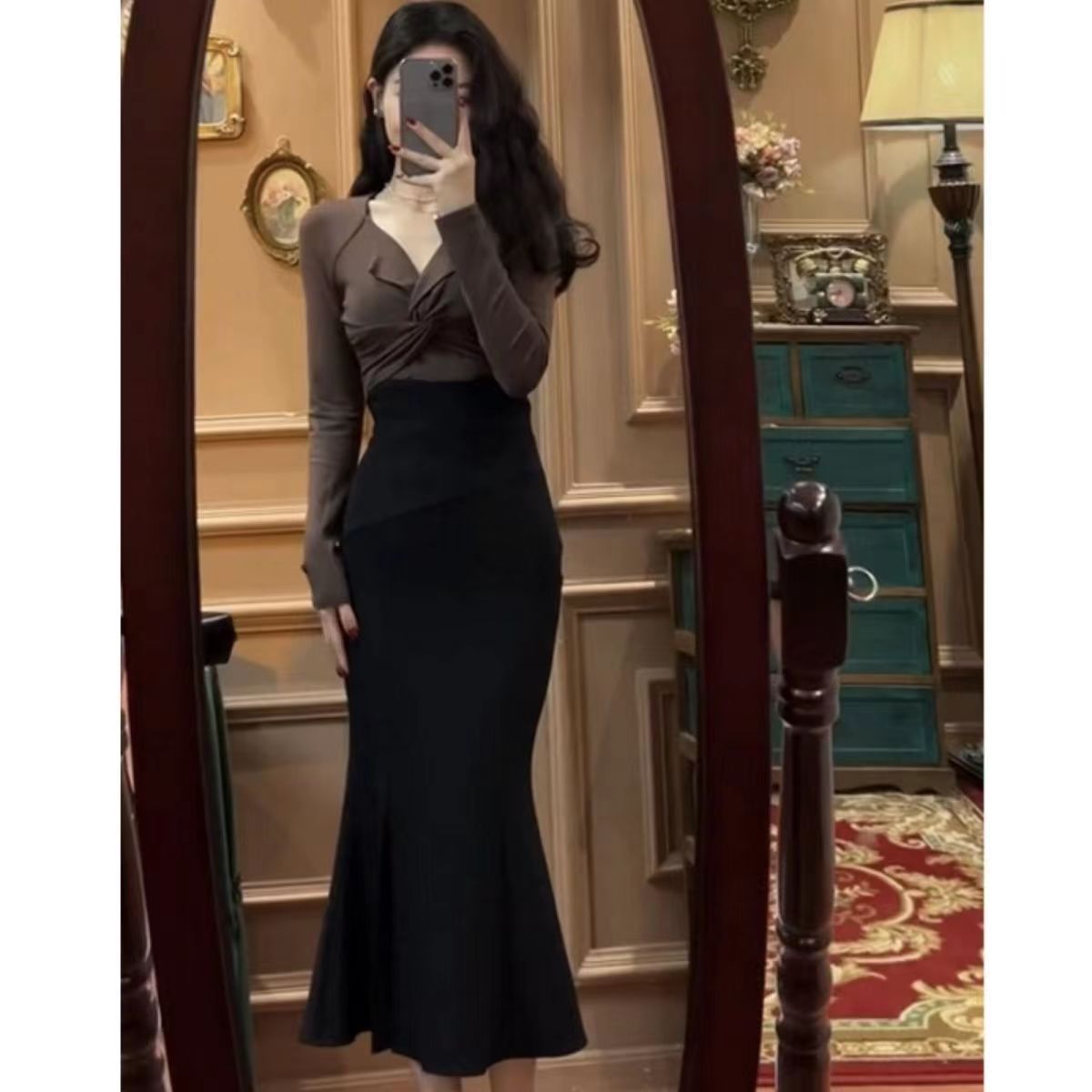 한국 정장 여성 2025 새로운 트위스트 긴팔 탑 + 슬릿 피쉬테일 스커트 서양식 투피스 세트스토어 가기
