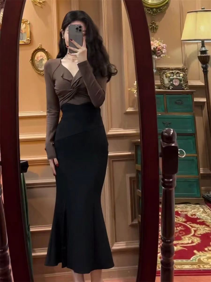 한국 정장 여성 2025 새로운 트위스트 긴팔 탑 + 슬릿 피쉬테일 스커트 서양식 투피스 세트