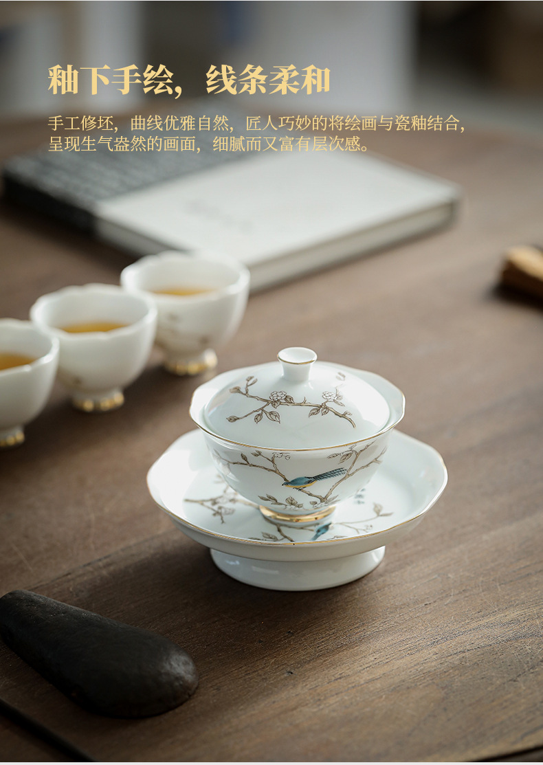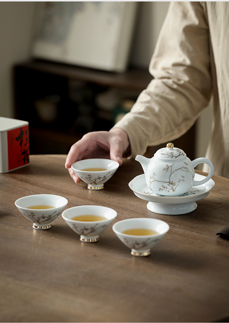 수트 화이트 제이드 도자기 골드 추적 가정용 커버 볼 쿵푸 티 세트 작은 세트 주전자 찻잔 Jingdezhen 하이 엔드 선물 상자스토어 가기
