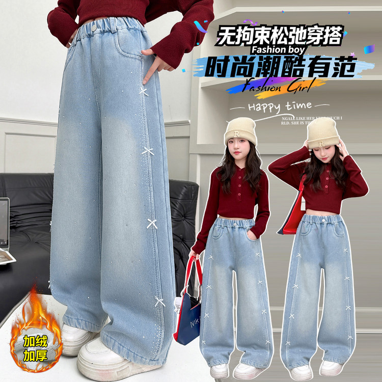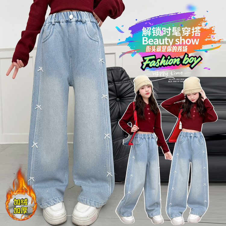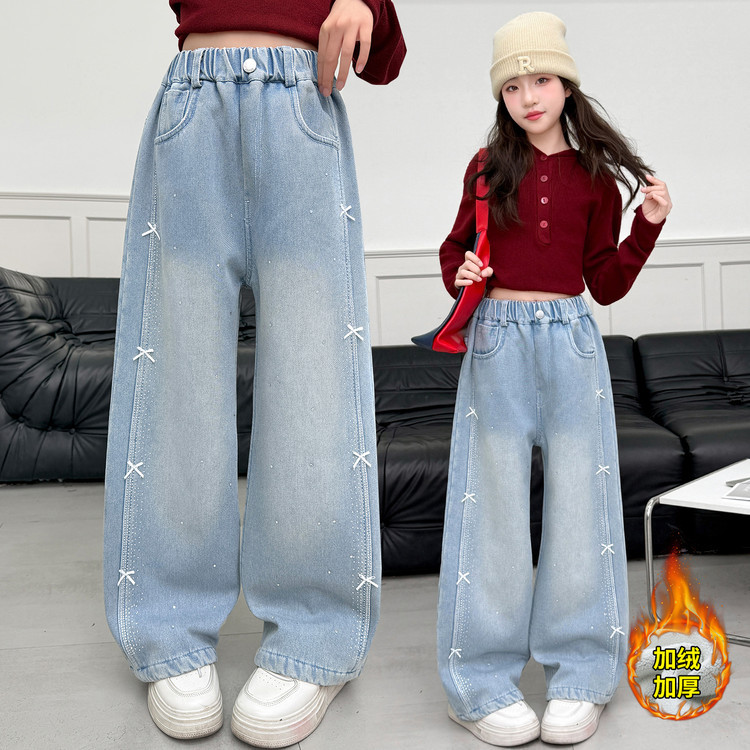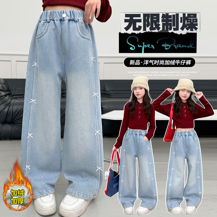 여아용 새해 겨울 고급 아동용 수출용 수건 자수 만화 캐릭터 반짝이 다이아몬드 리본 장식 기모 데님 팬츠