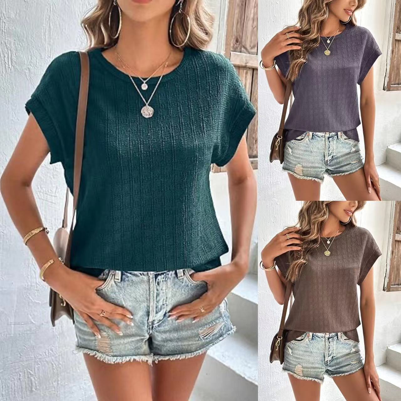 아마존 해외직구 2024 유럽 및 미국 여성복 여름 신상 인기 자카드 체크 라운드넥 루즈핏 반팔 티셔츠