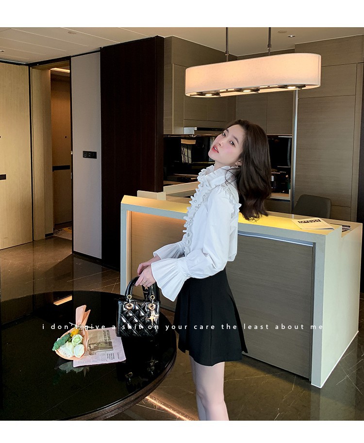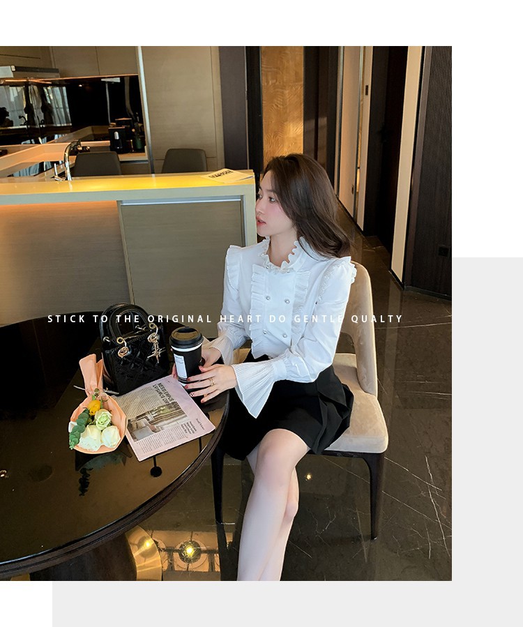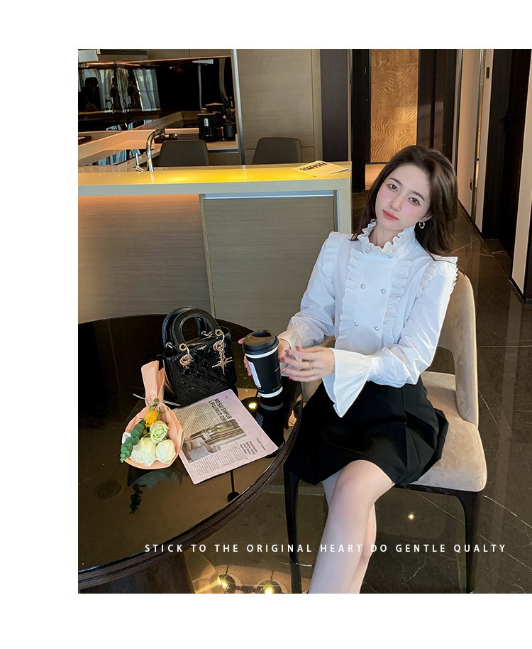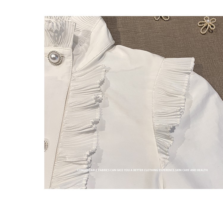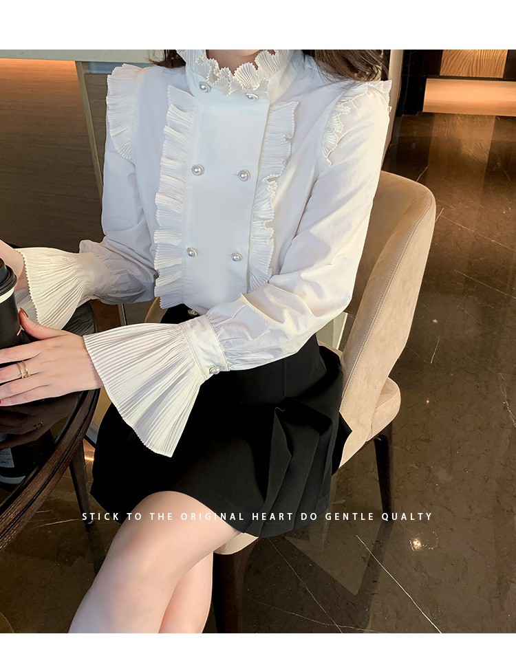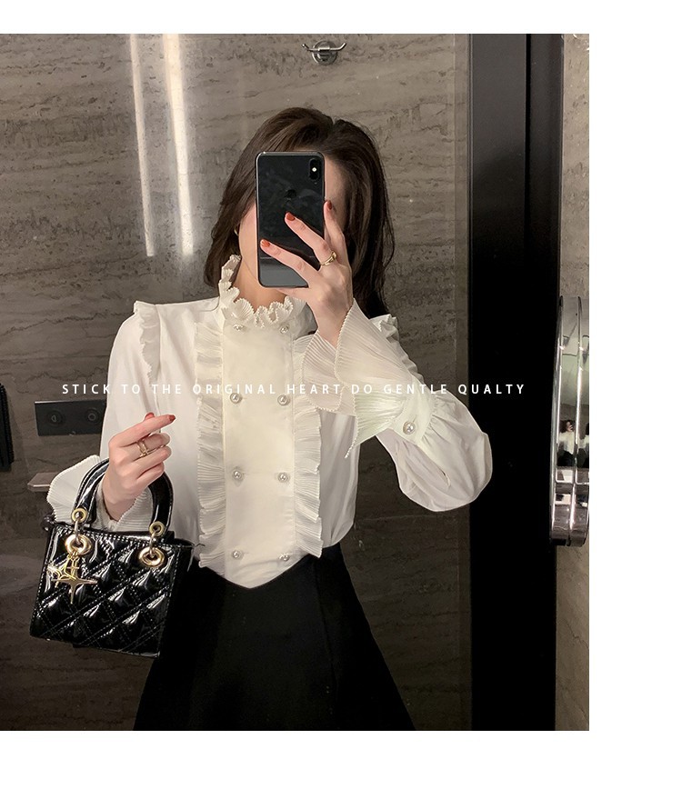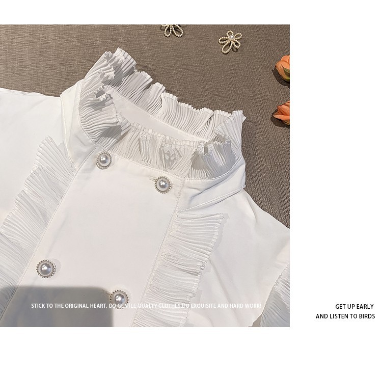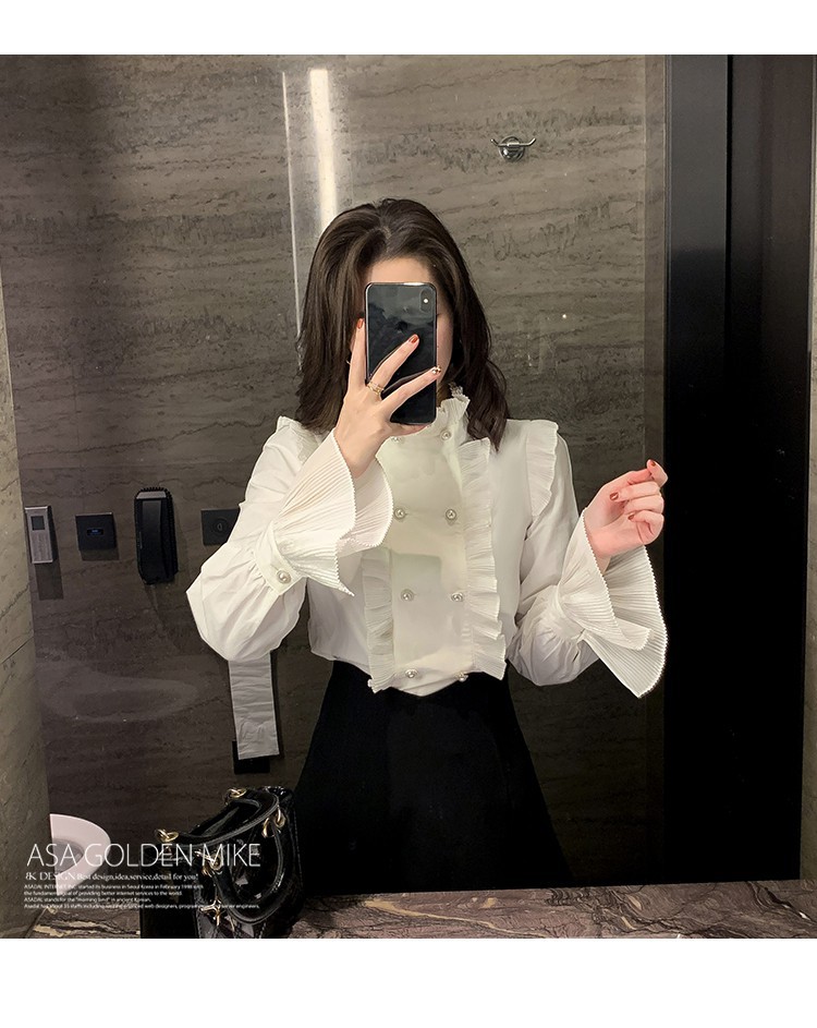 서양식 나이를 줄이는 나무 귀 우아한 스탠드 칼라 쉬폰 셔츠 국경 여성 의류 봄과 가을 새로운 패션 주름진 작은 셔츠