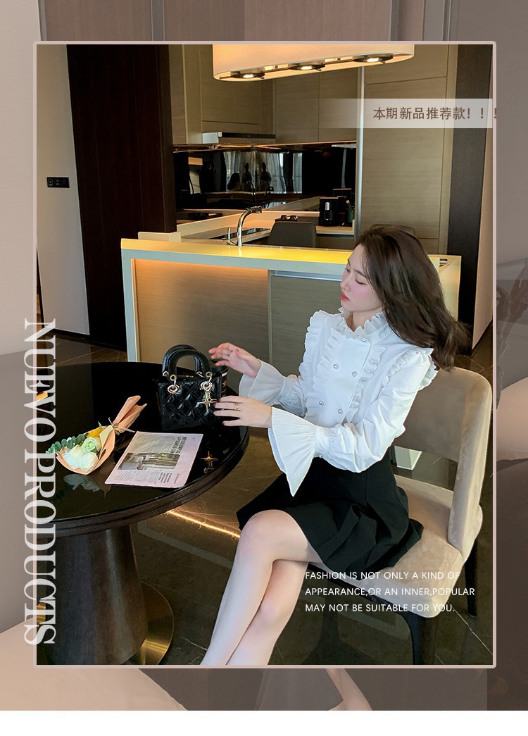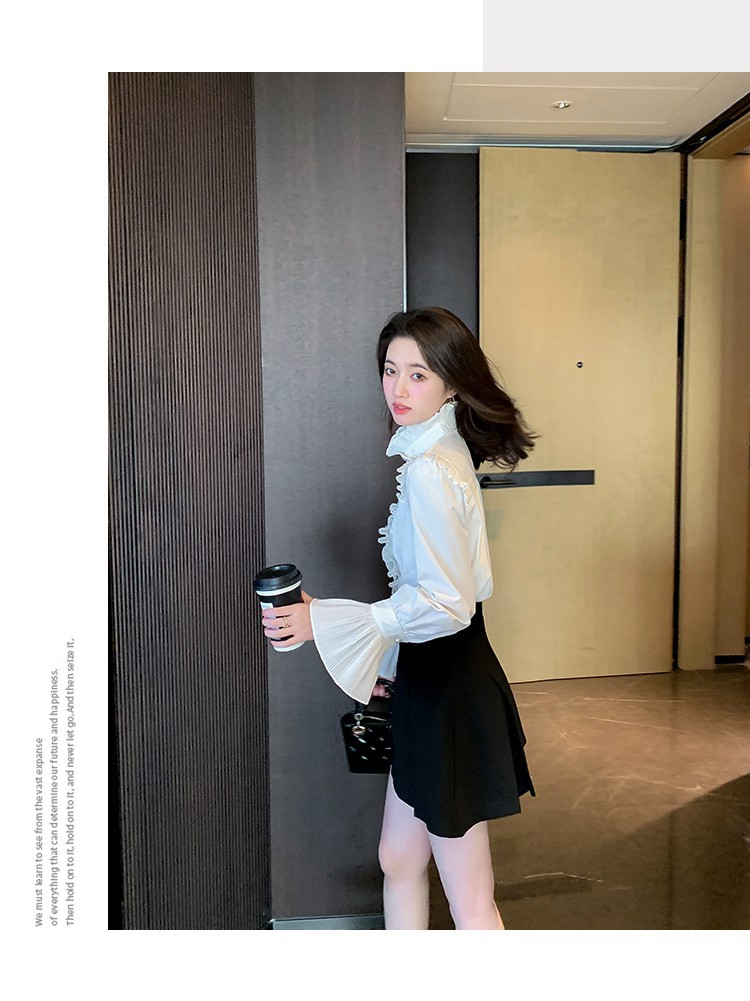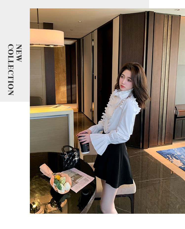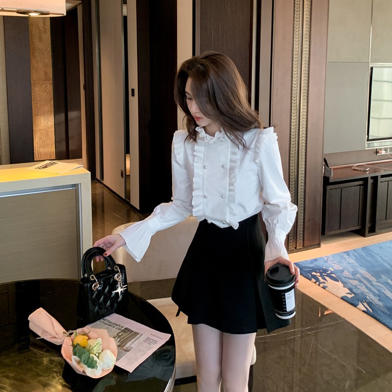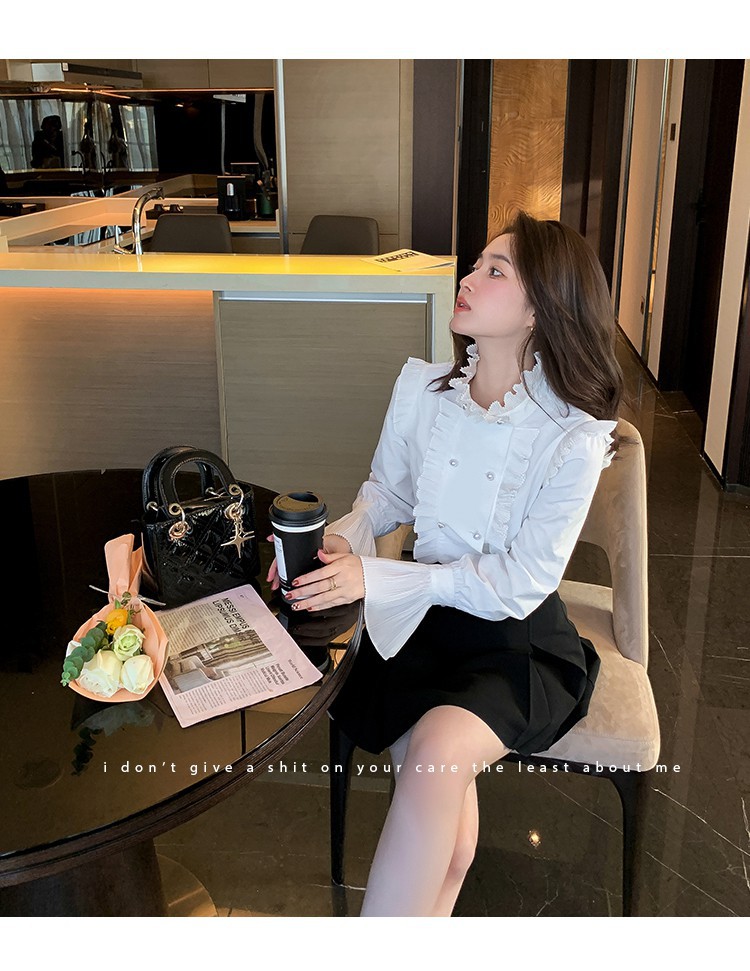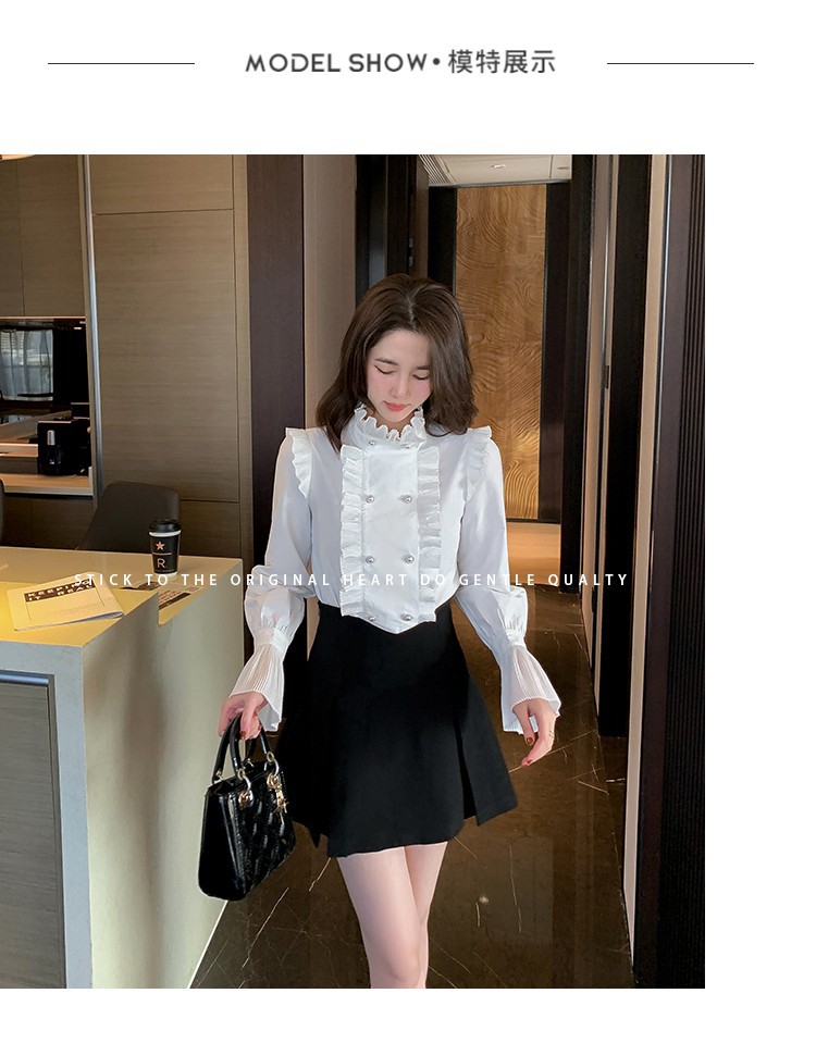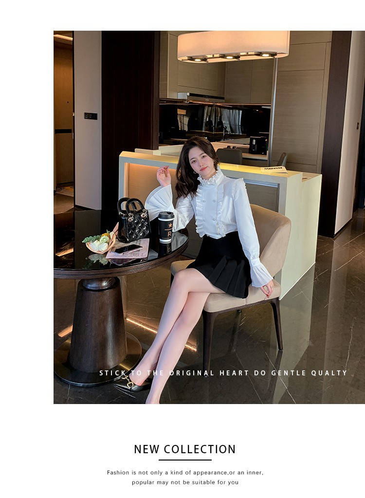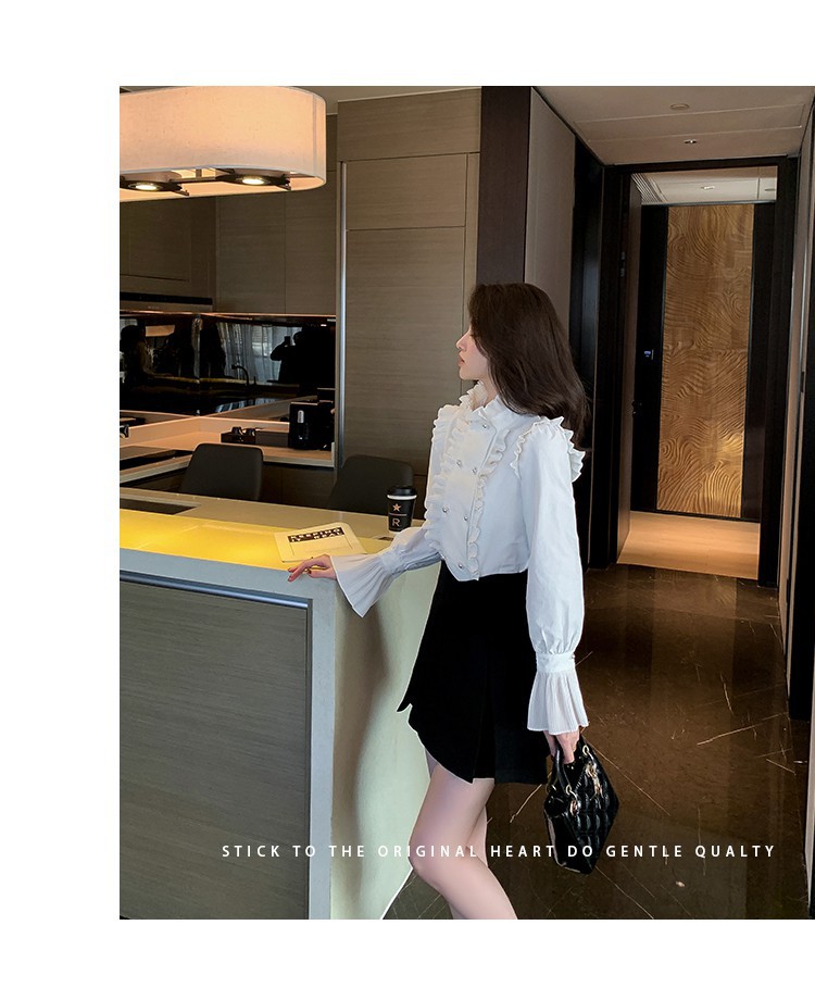 서양식 나이를 줄이는 나무 귀 우아한 스탠드 칼라 쉬폰 셔츠 국경 여성 의류 봄과 가을 새로운 패션 주름진 작은 셔츠