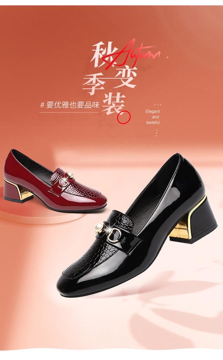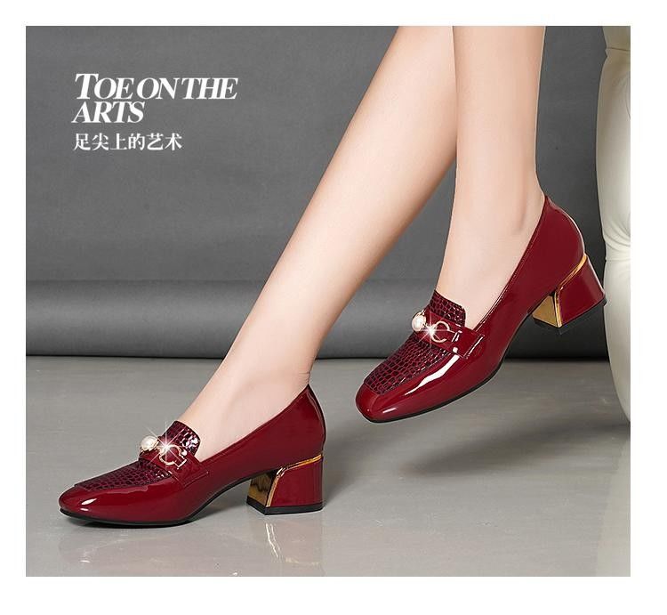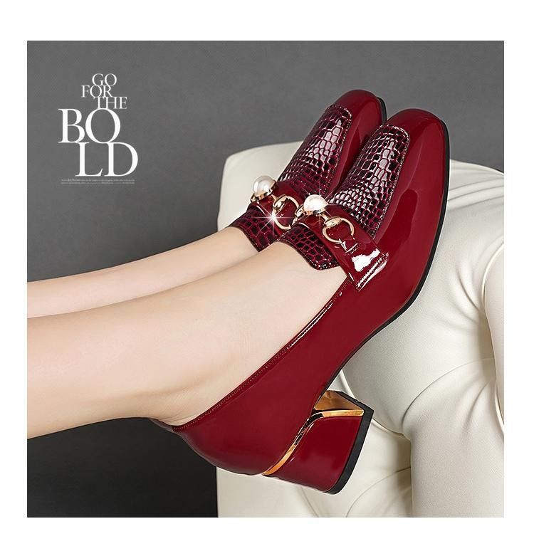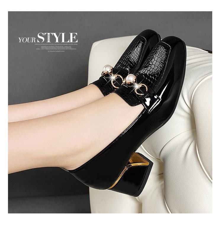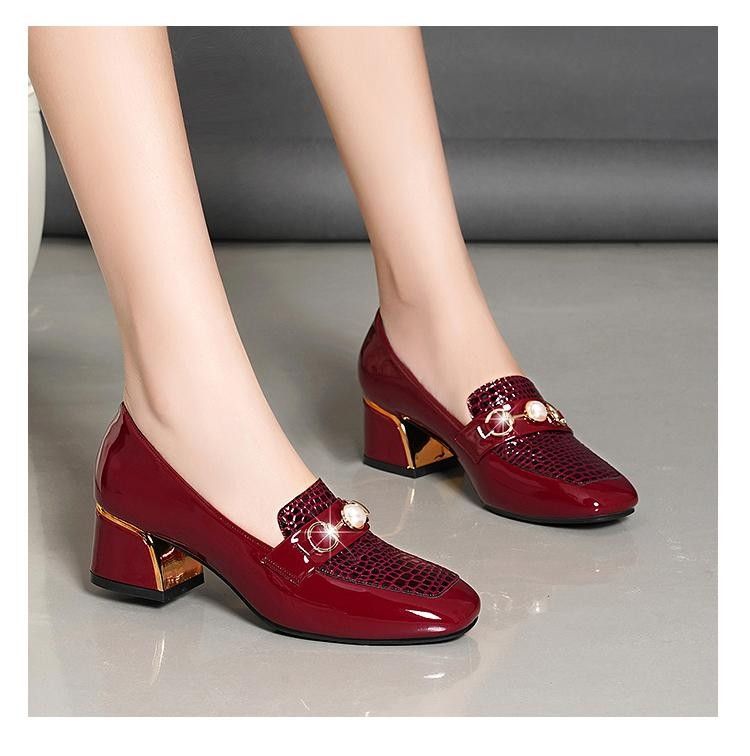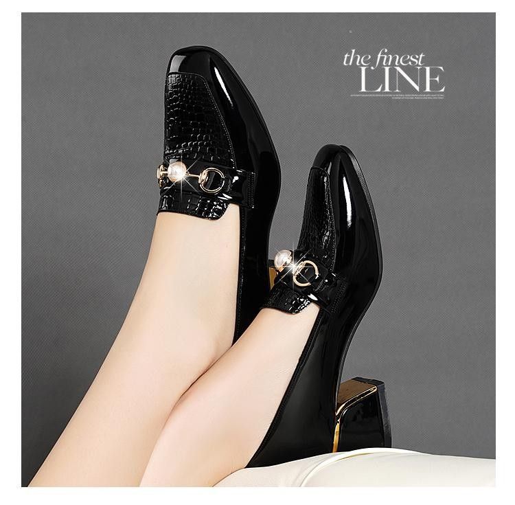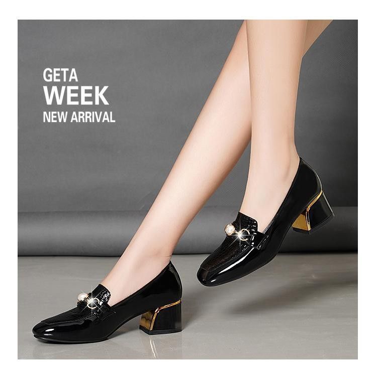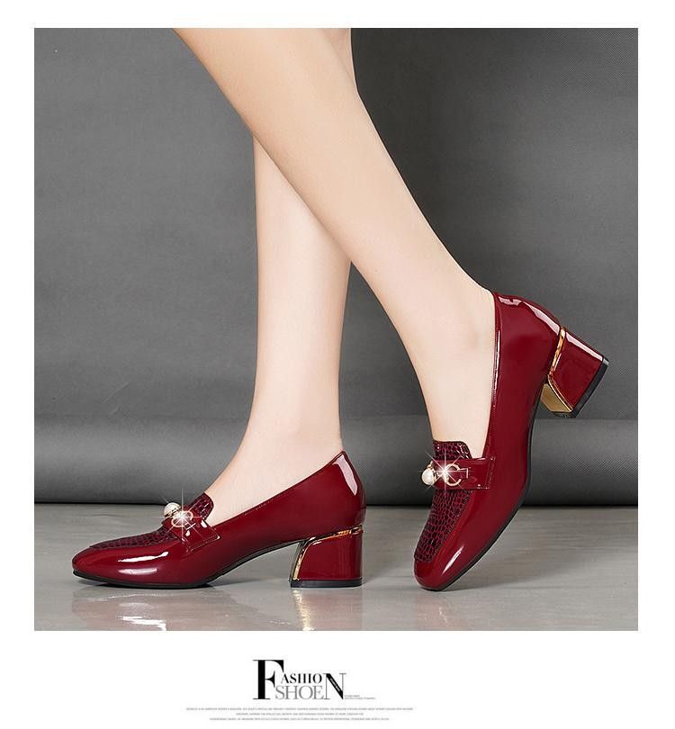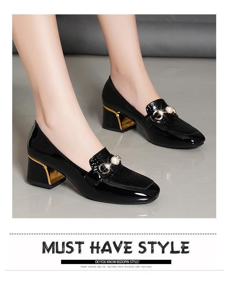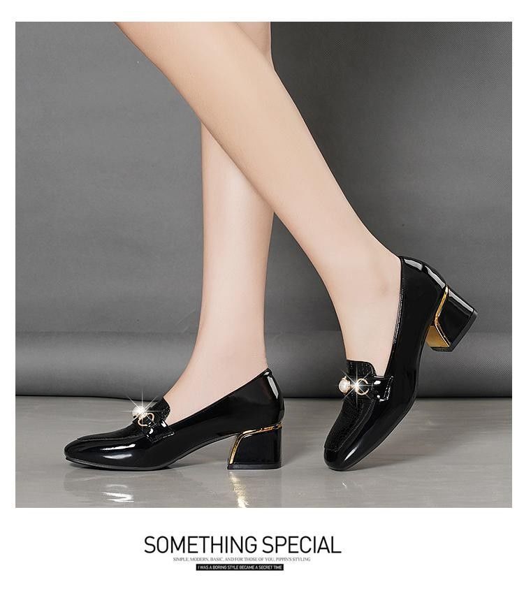 새로운 미드 힐 청키 힐 여성 신발 특허 가죽 올 매치 부드러운 바닥 패션 가죽 신발 진주 얕은 입 미끄럼 방지 편안한 플러스 사이즈 단층 신발스토어 가기