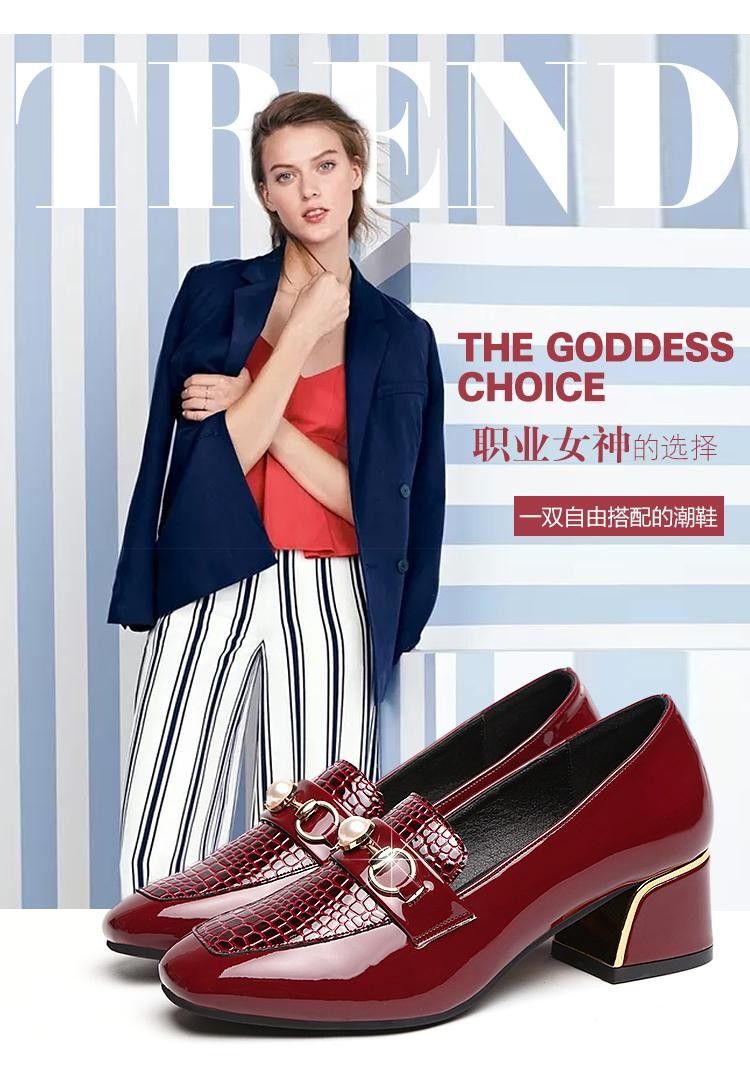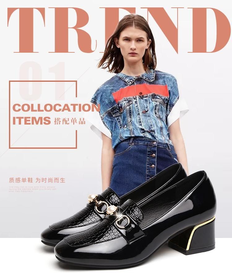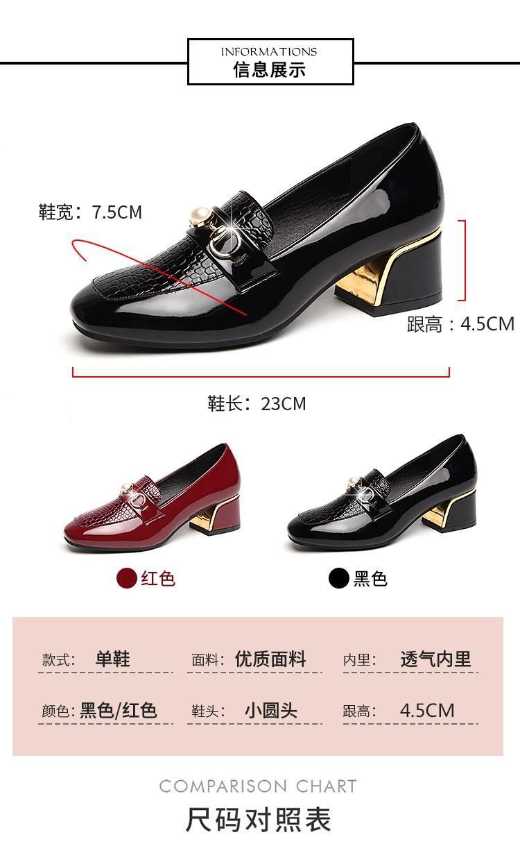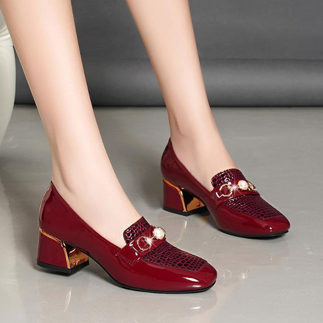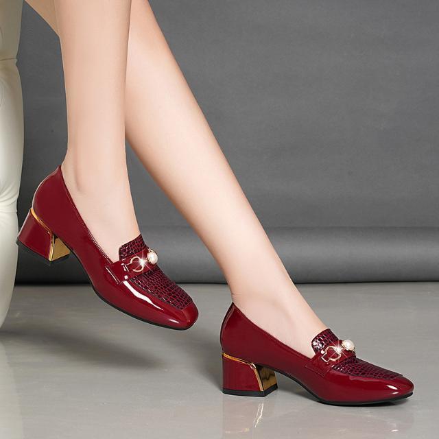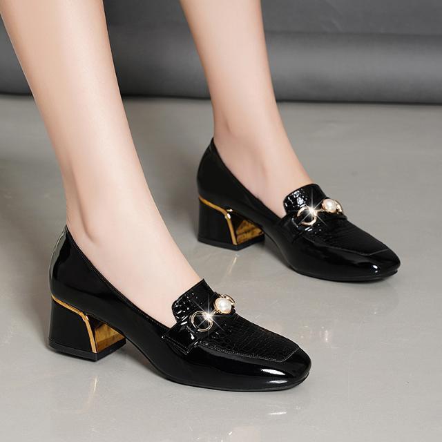 새로운 미드 힐 청키 힐 여성 신발 특허 가죽 올 매치 부드러운 바닥 패션 가죽 신발 진주 얕은 입 미끄럼 방지 편안한 플러스 사이즈 단층 신발