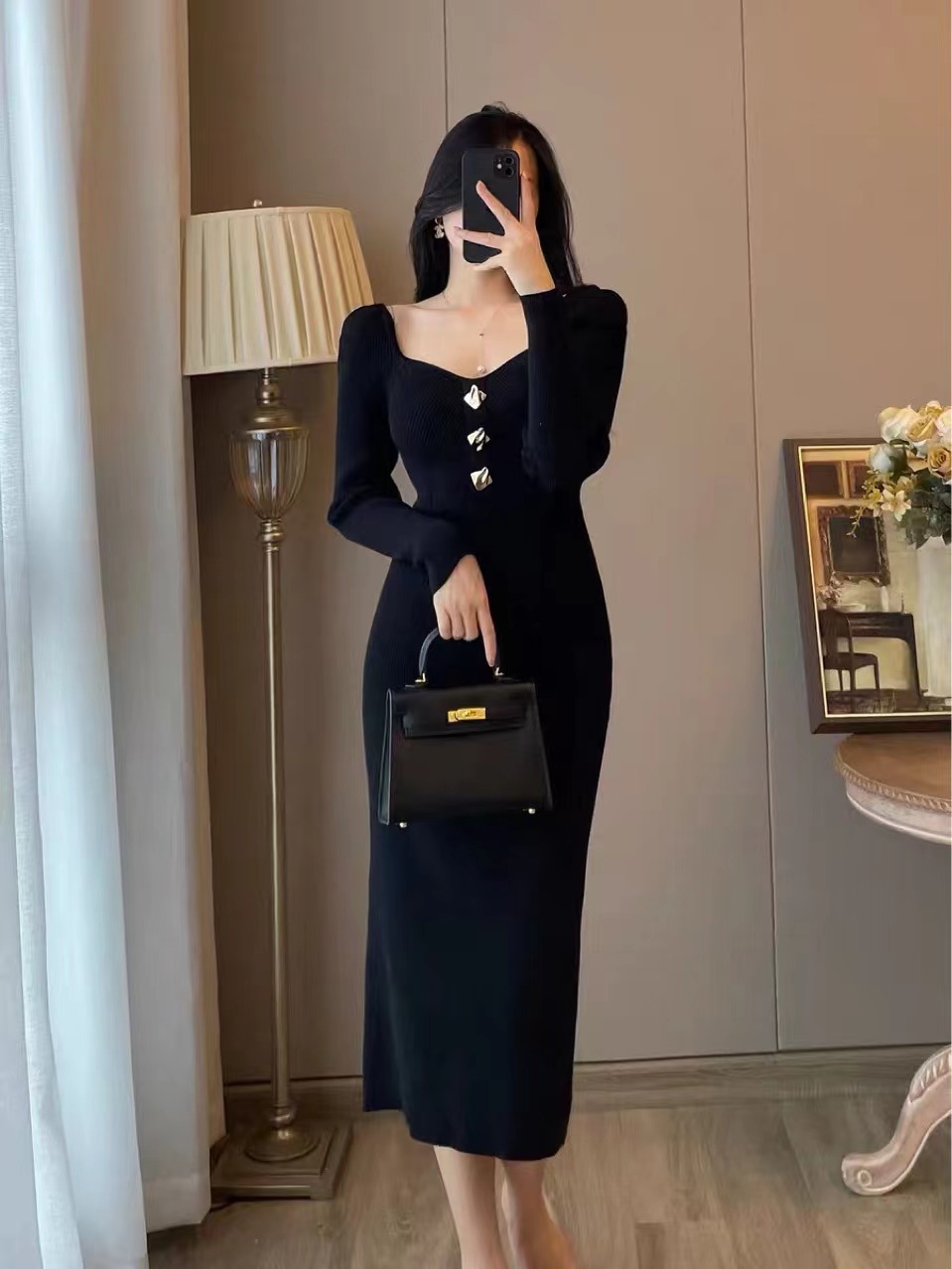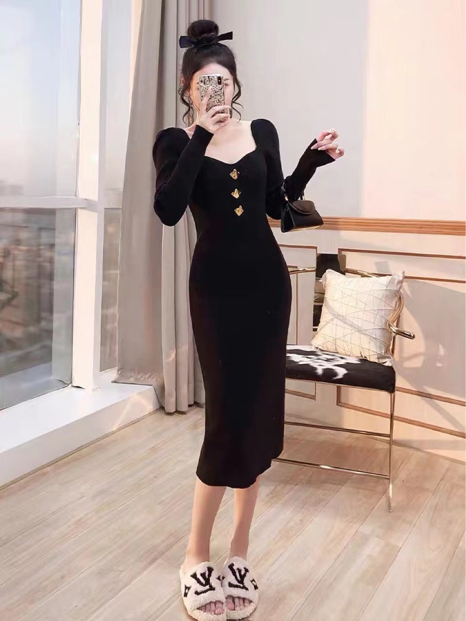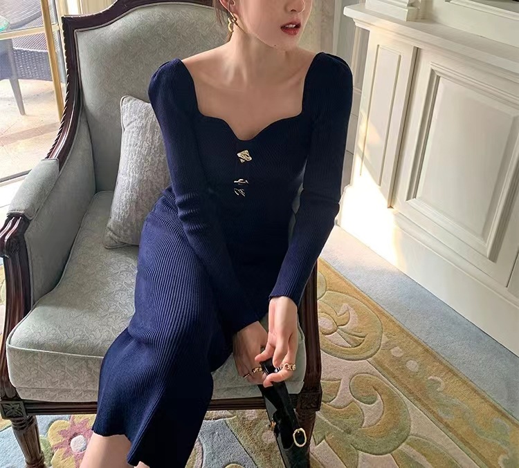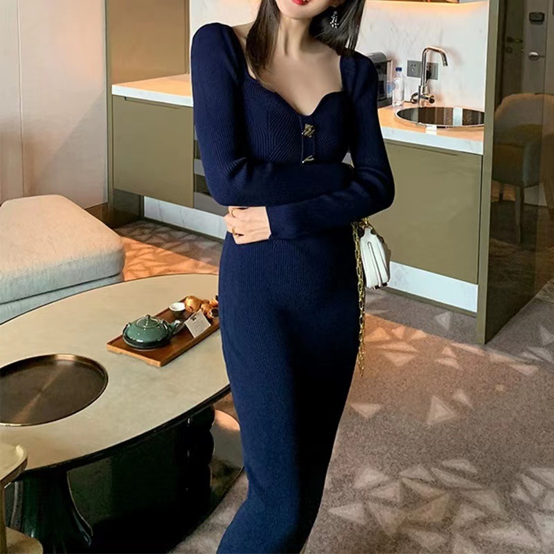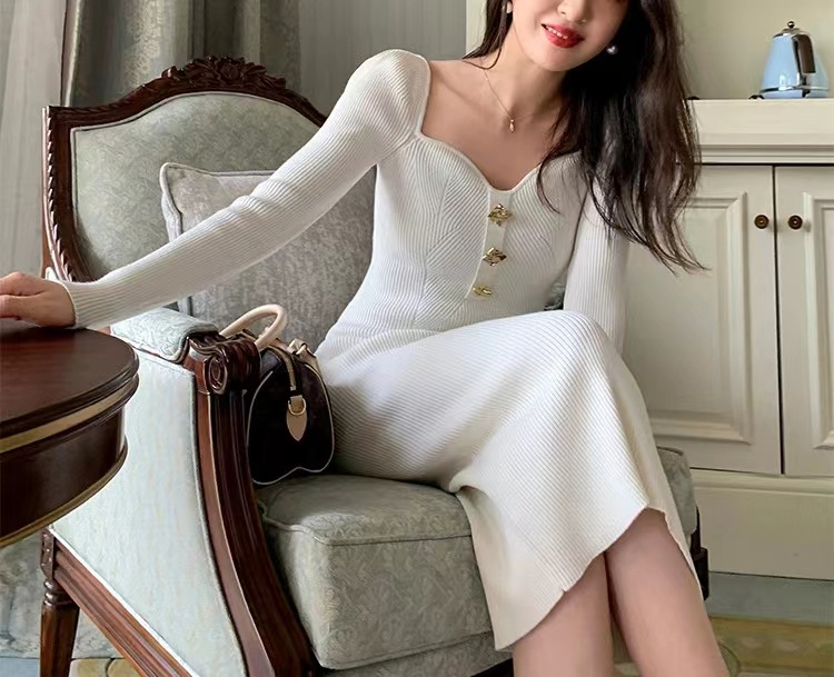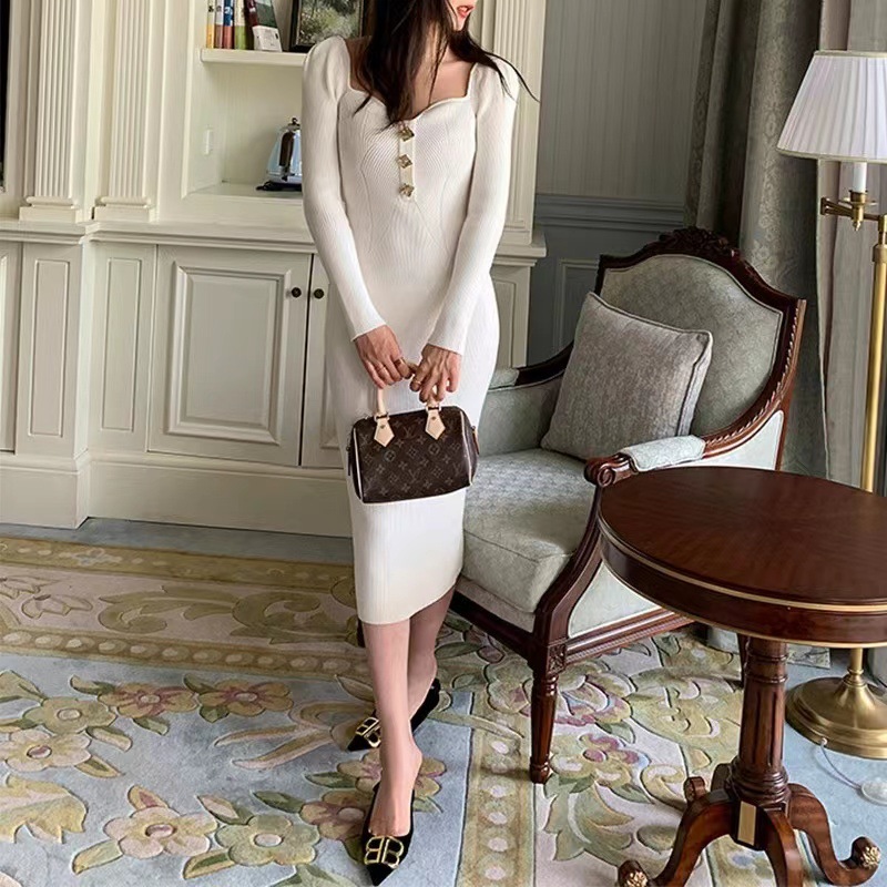 2025 가을 겨울 신상 프렌치 스타일 우아한 여성용 솔리드 컬러 스퀘어 넥 비즈 장식 슬림핏 니트 힙허깅 원피스스토어 가기