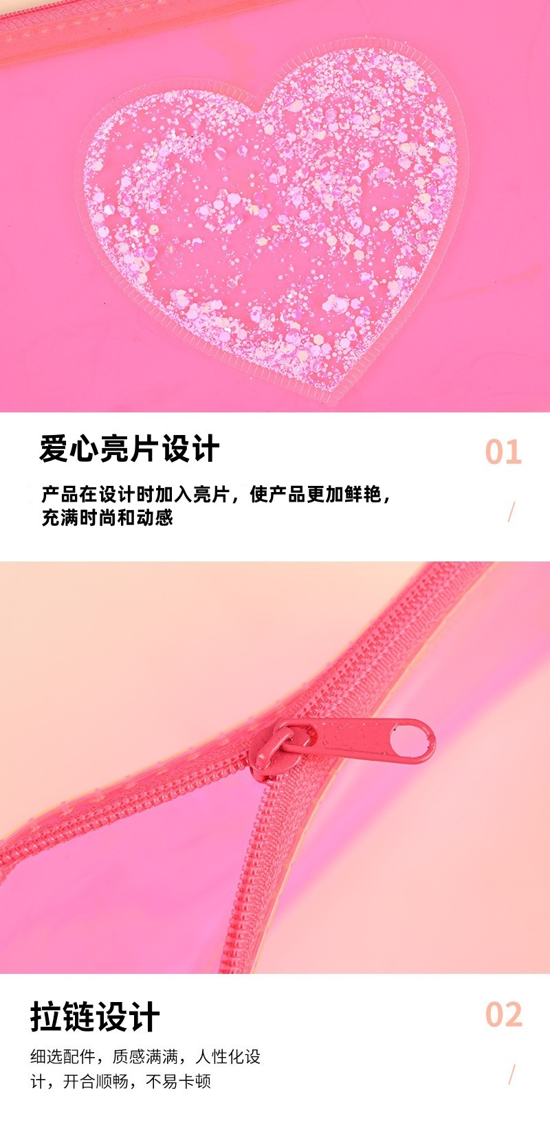 제조업체 컬러 투명 필통 문구 가방 하트 스팽글 인기 PVC 가방 화장품 가방 지퍼 가방 수납 가방
