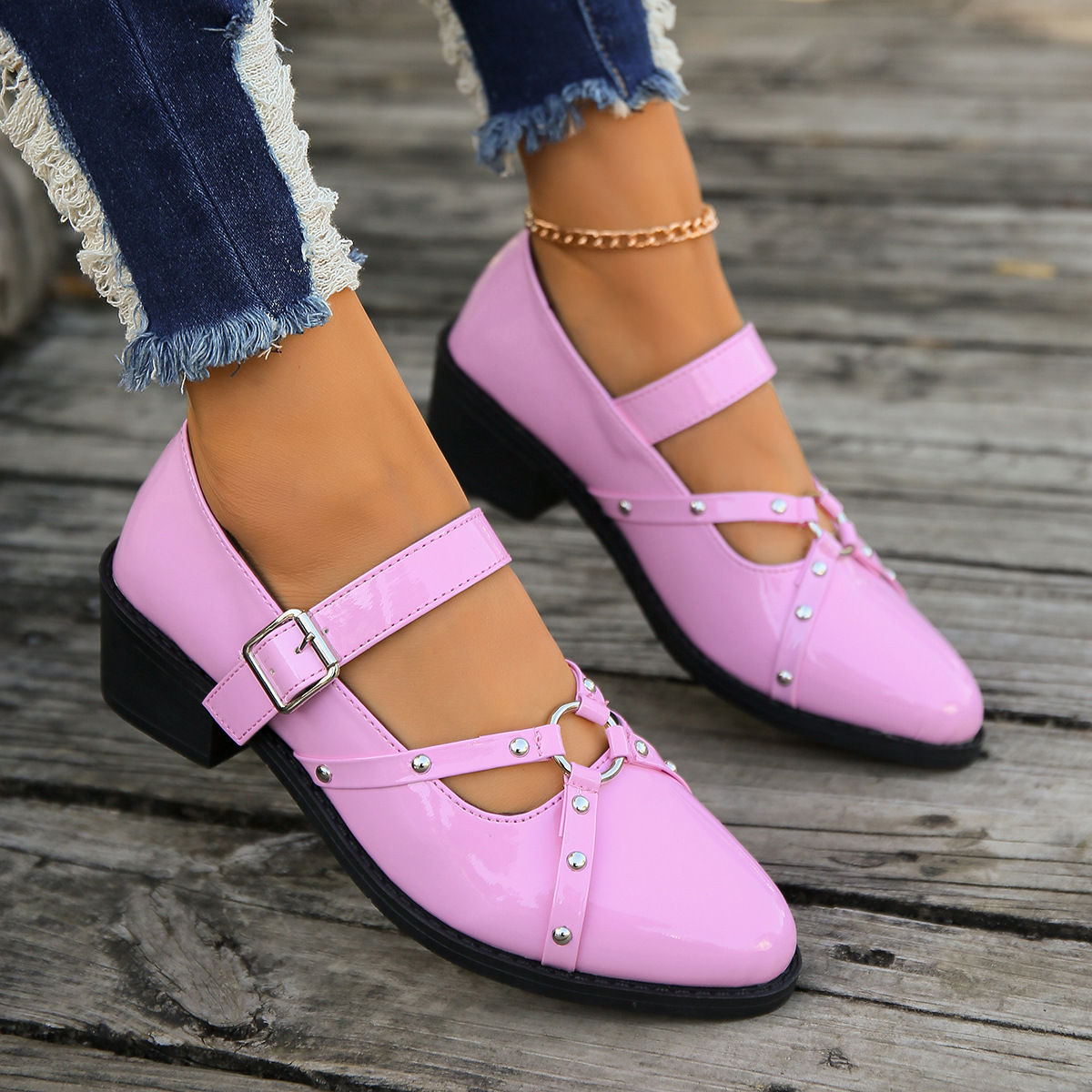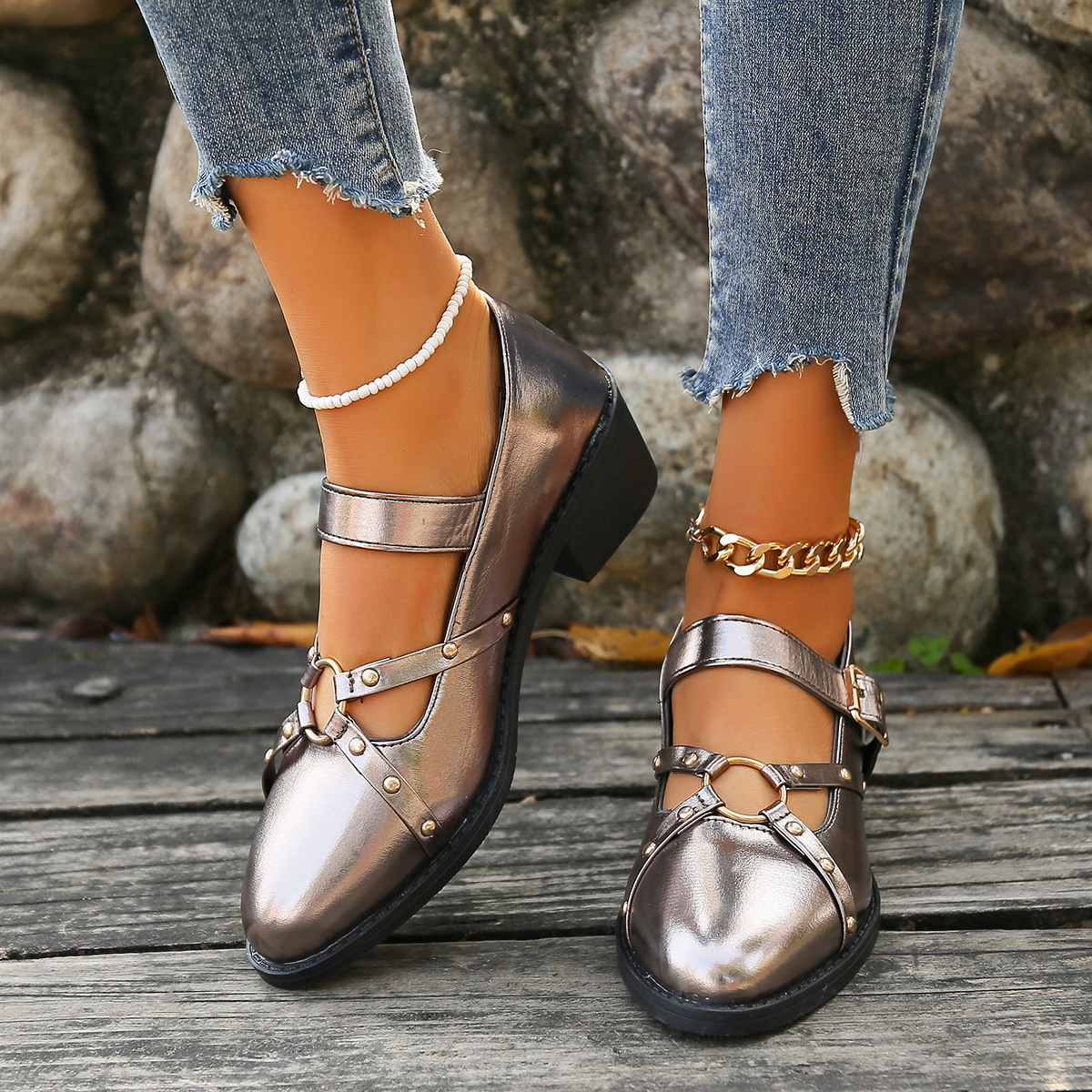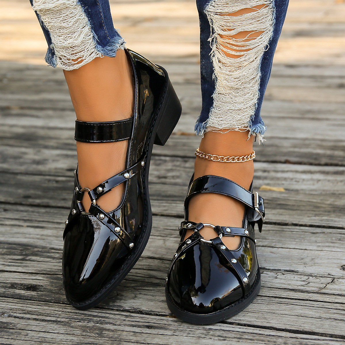 여성을위한 새로운 봄과 여름 청키 한 뒤꿈치 뾰족한 로퍼를 2024 여성을위한 대외 무역 플러스 사이즈 작은 가죽 신발 검은 복고풍 리벳 싱글 레이어 신발스토어 가기