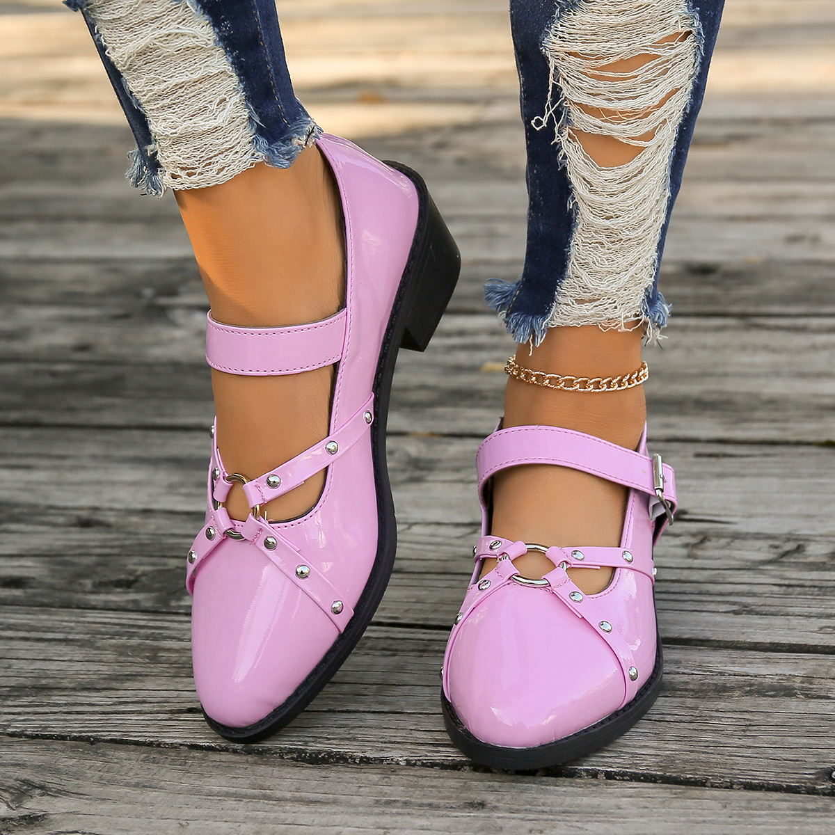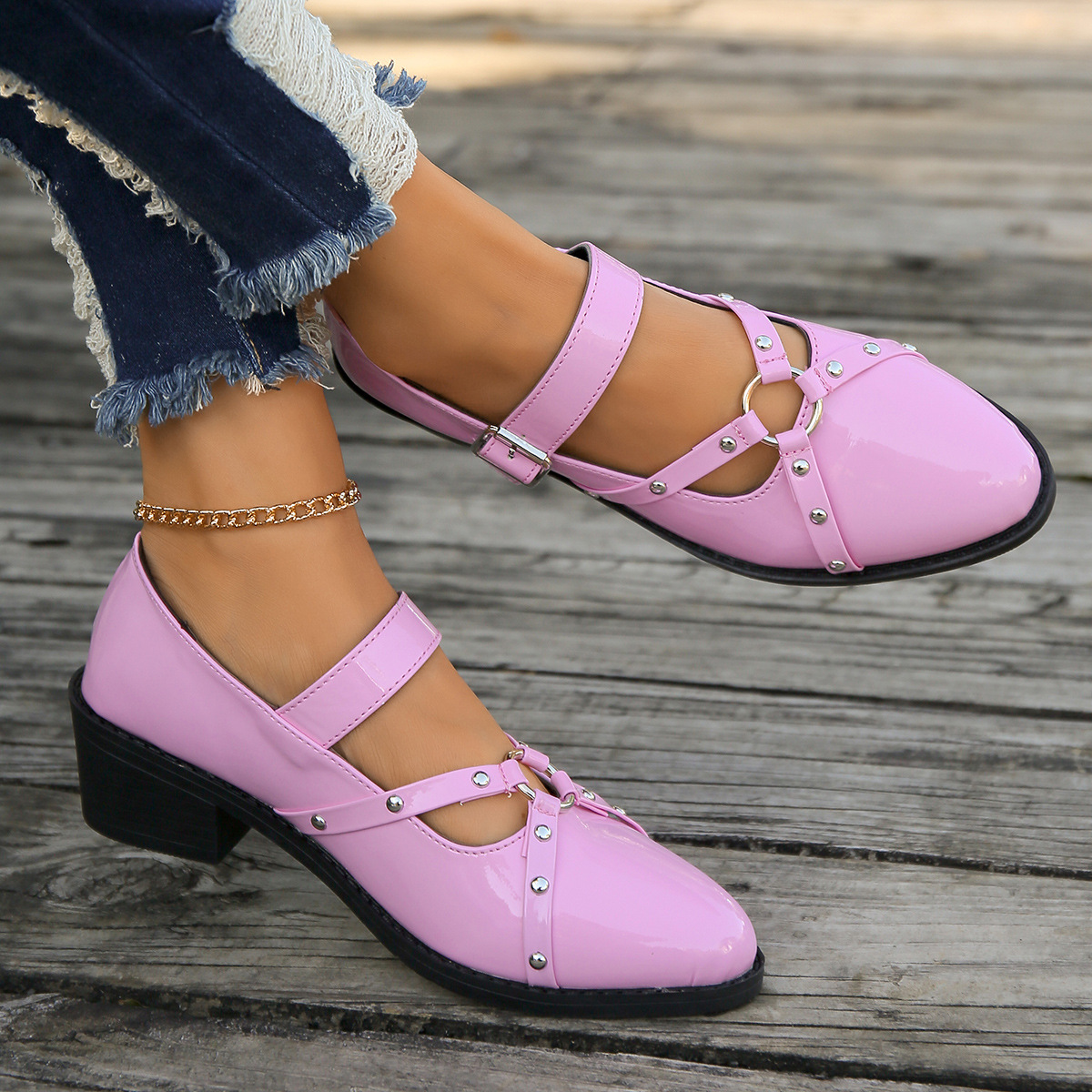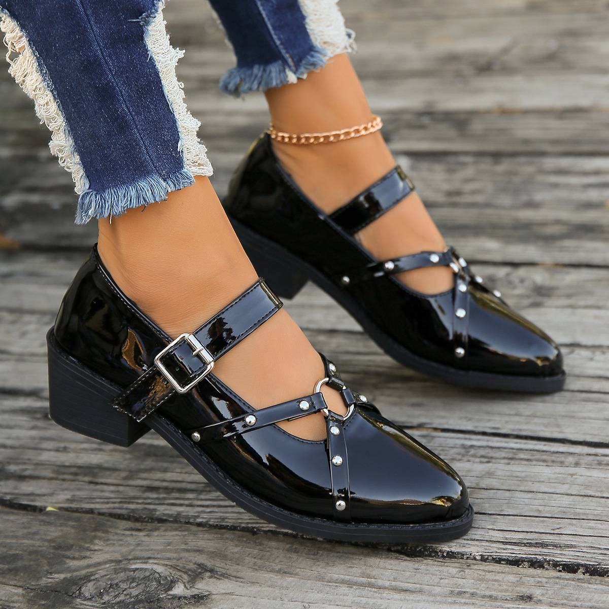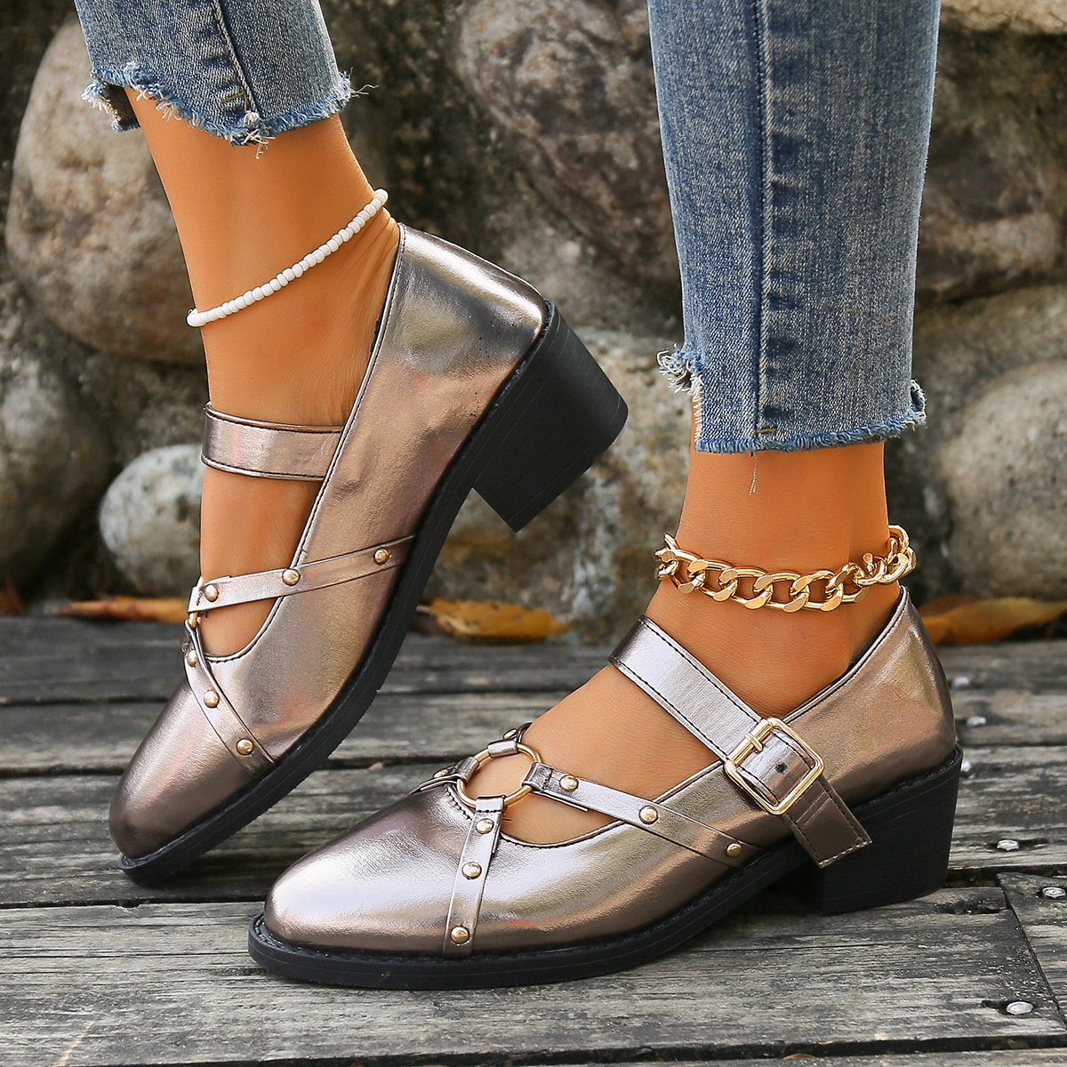 여성을위한 새로운 봄과 여름 청키 한 뒤꿈치 뾰족한 로퍼를 2024 여성을위한 대외 무역 플러스 사이즈 작은 가죽 신발 검은 복고풍 리벳 싱글 레이어 신발스토어 가기