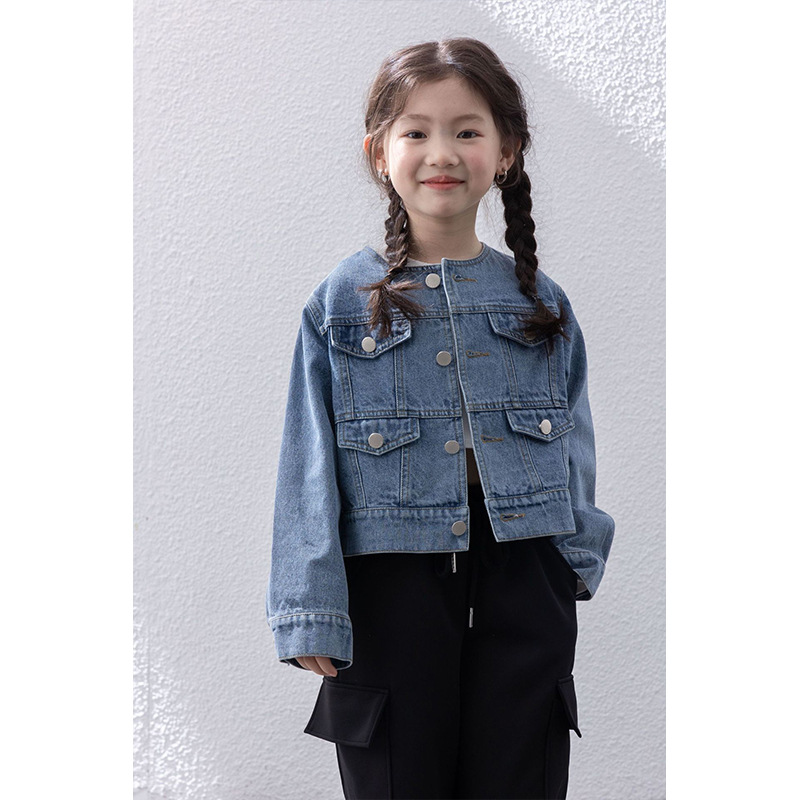 여아용 짧은 데님 재킷 2025 봄 한국 스타일 어린이 레트로 라운드 넥 데님 재킷 중대형 어린이 다용도 상의
