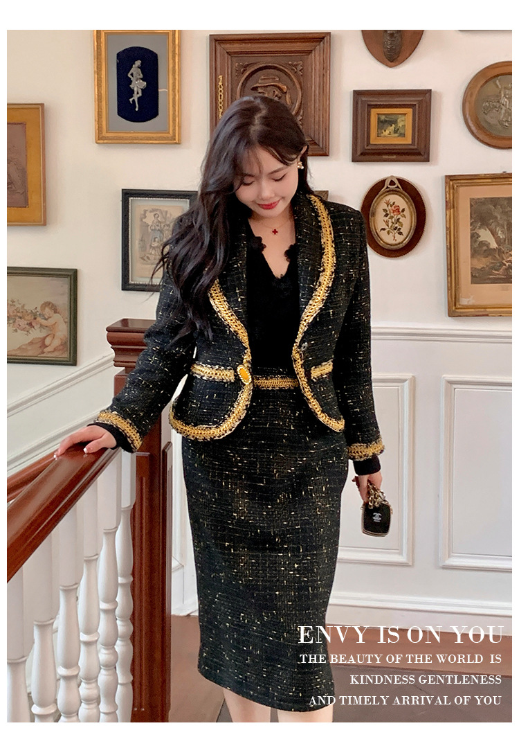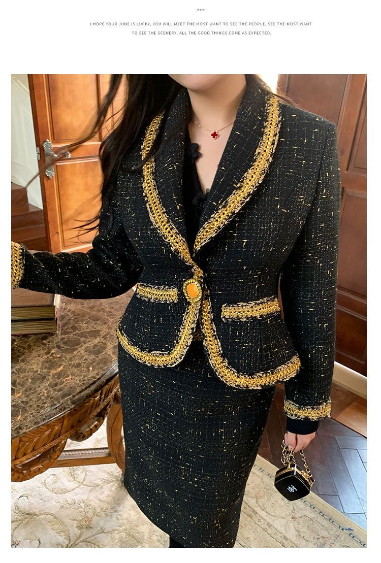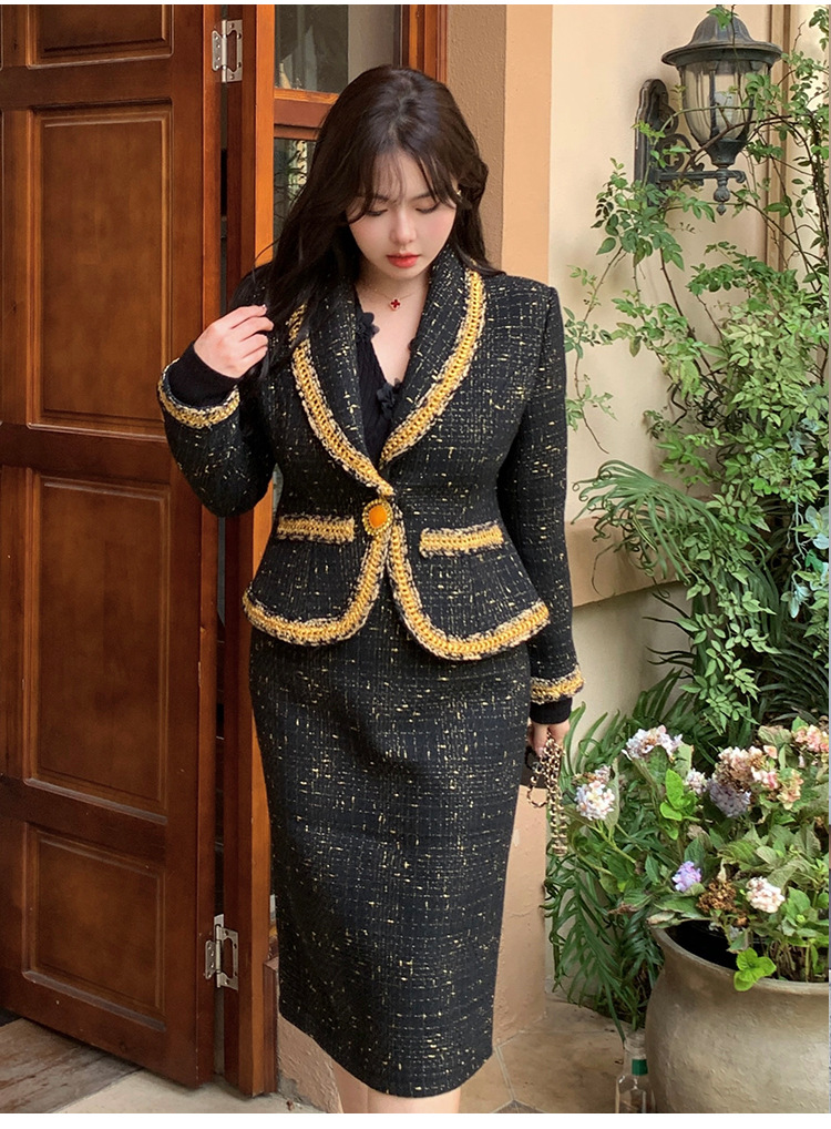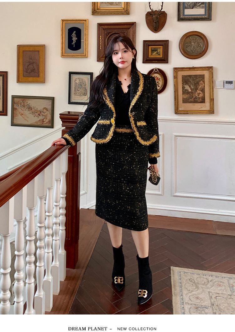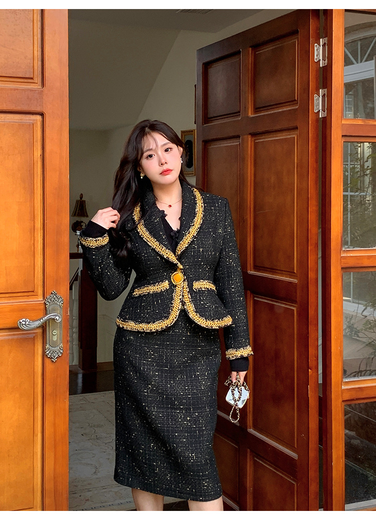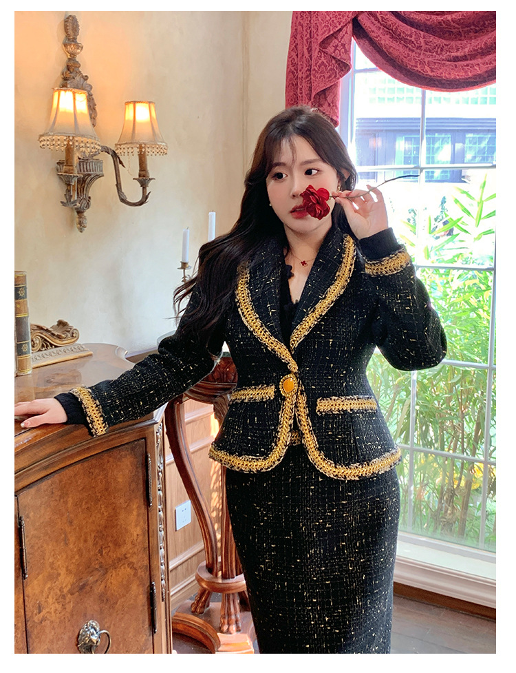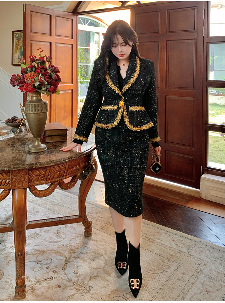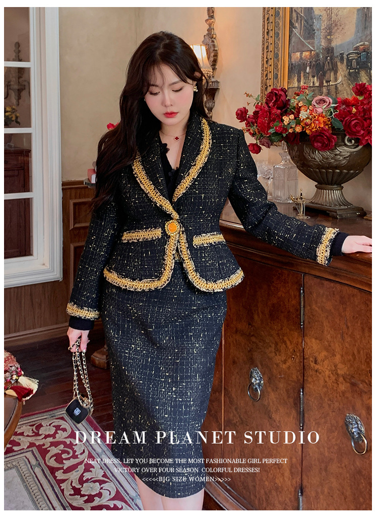 플러스 사이즈 여성 의류 고급 샤넬 스타일 트위드 세트 통통녀 슬리밍 겨울 새로운 프랑스 투피스 세트 1771스토어 가기