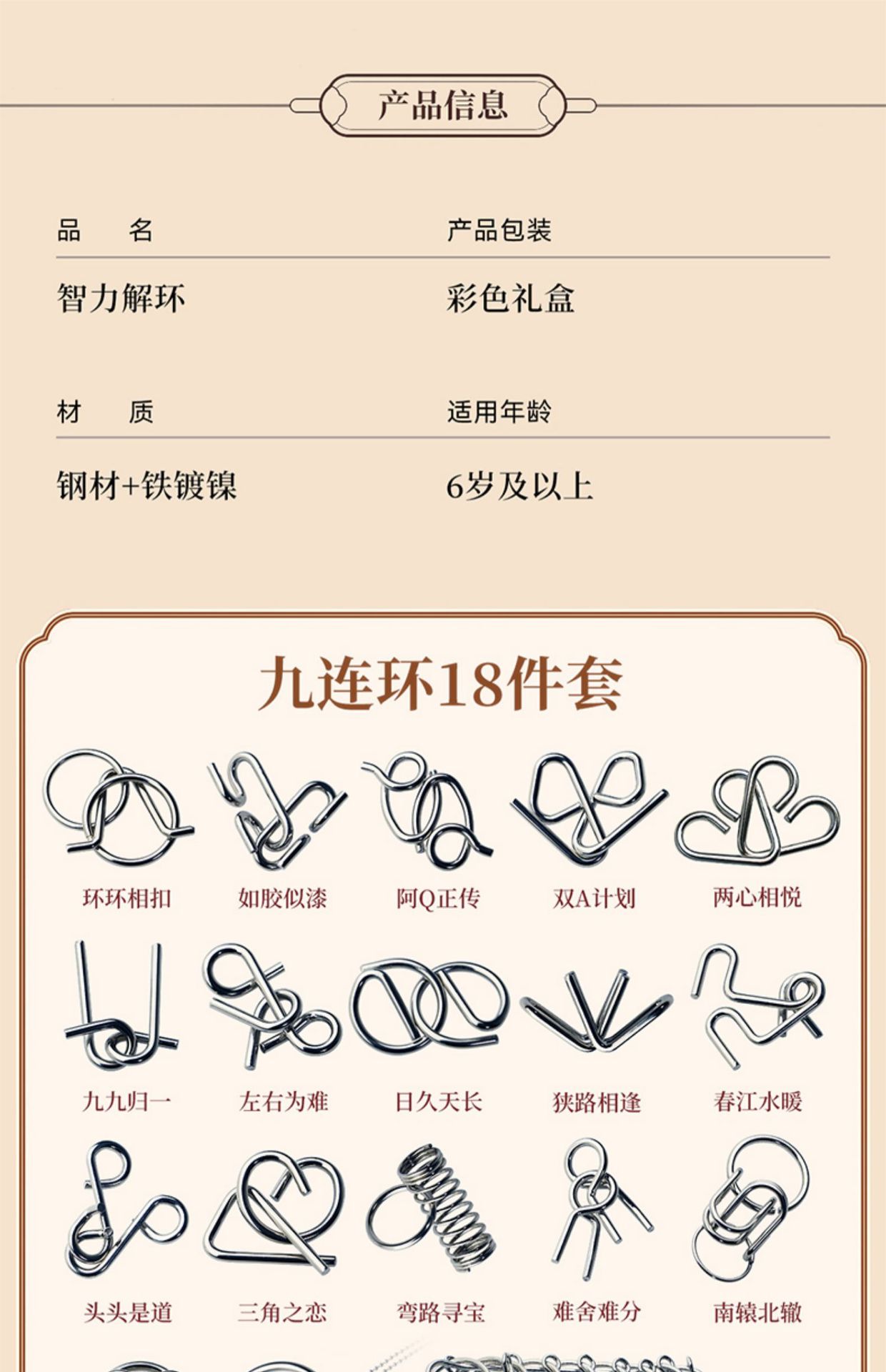解环18件套:彩盒 单盒尺寸:21.5*31.5*2.5cm 装箱数:40盒/箱