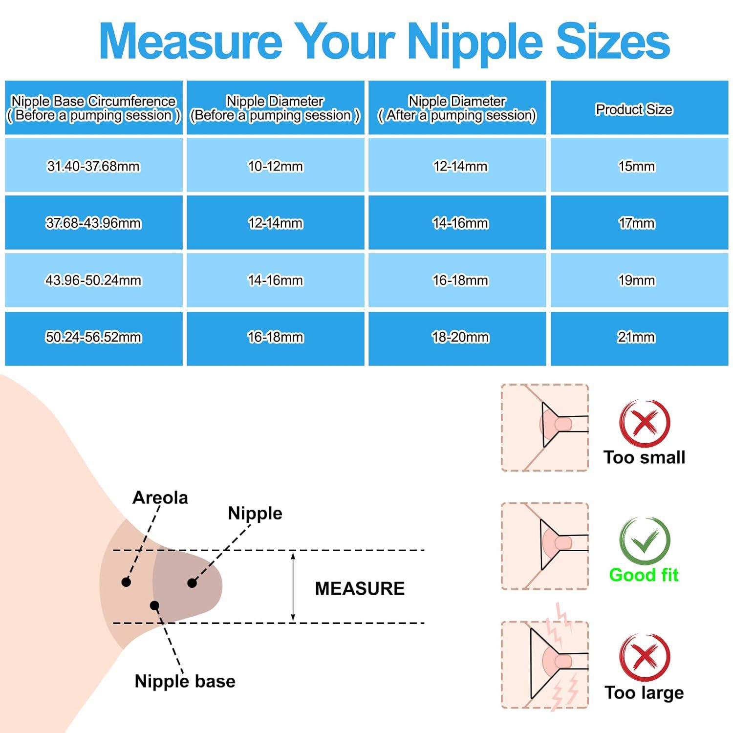 • 多种尺寸选择:我们的法兰尺寸有多种组合,件:13/15/17/19/21/24。 不同的周期提供更舒适的体验,选择合适的法兰尺寸可以帮助母乳顺利排出。