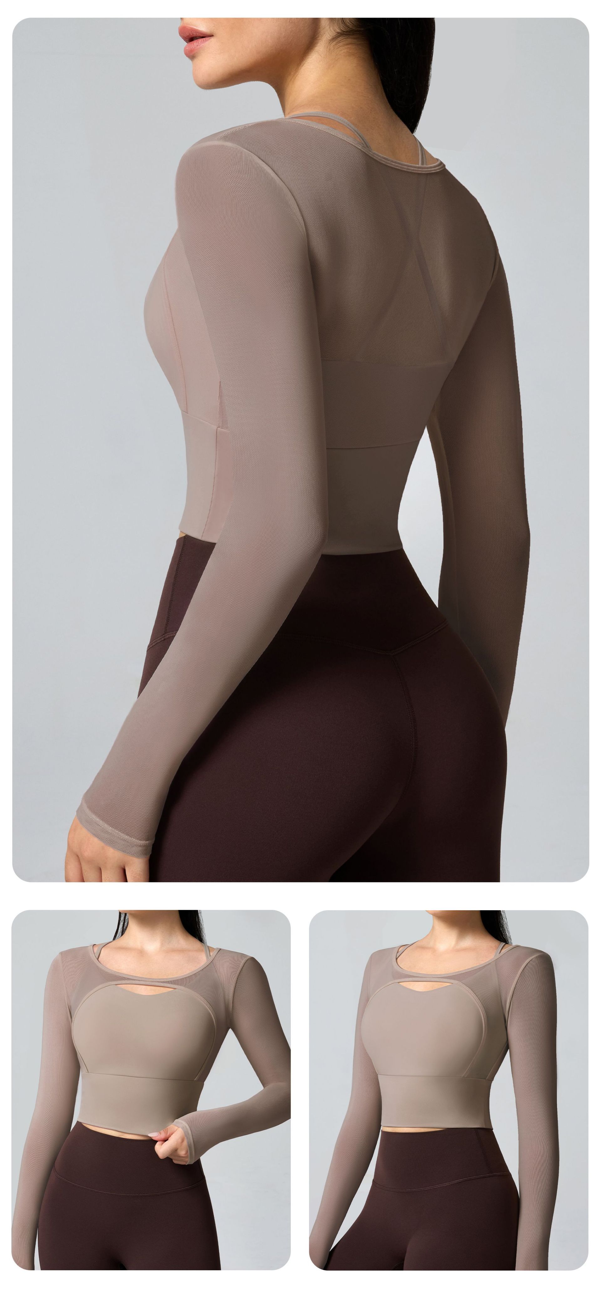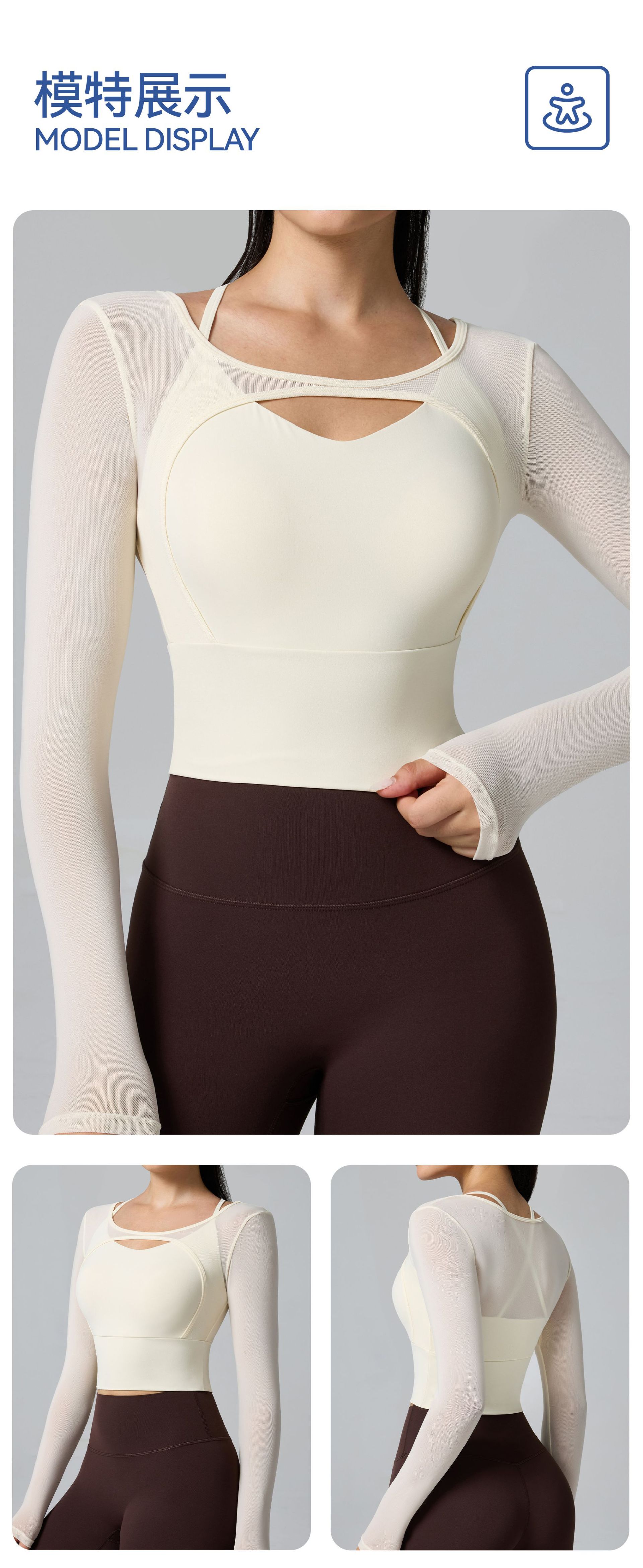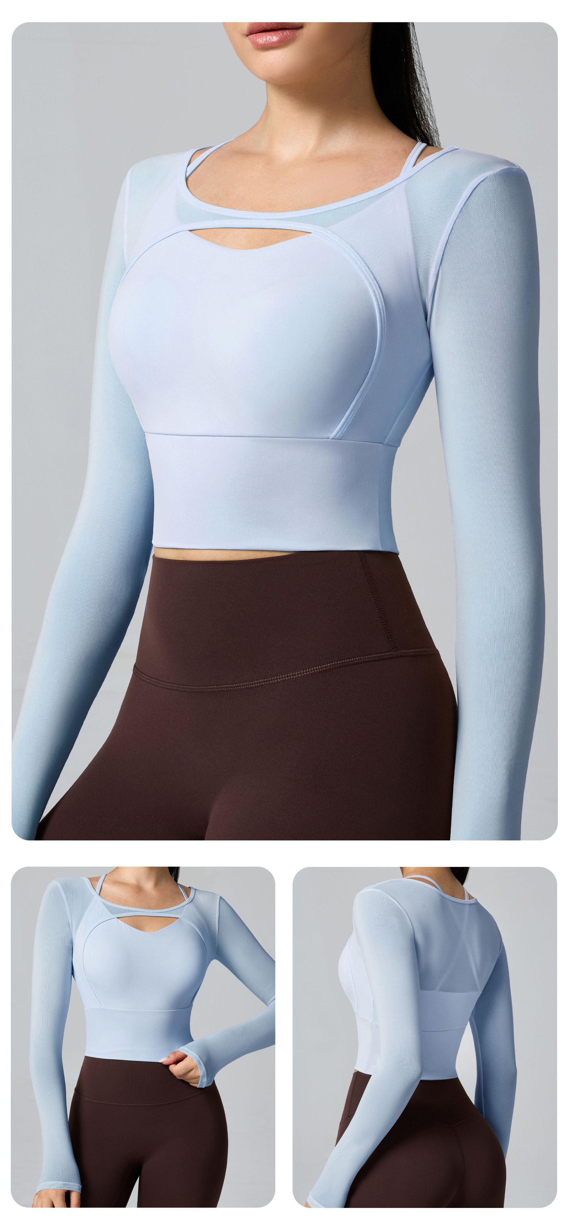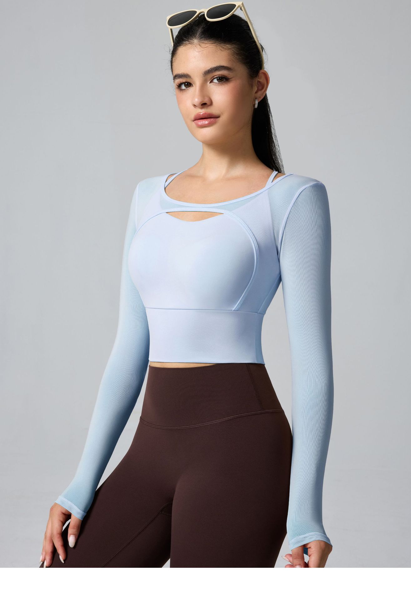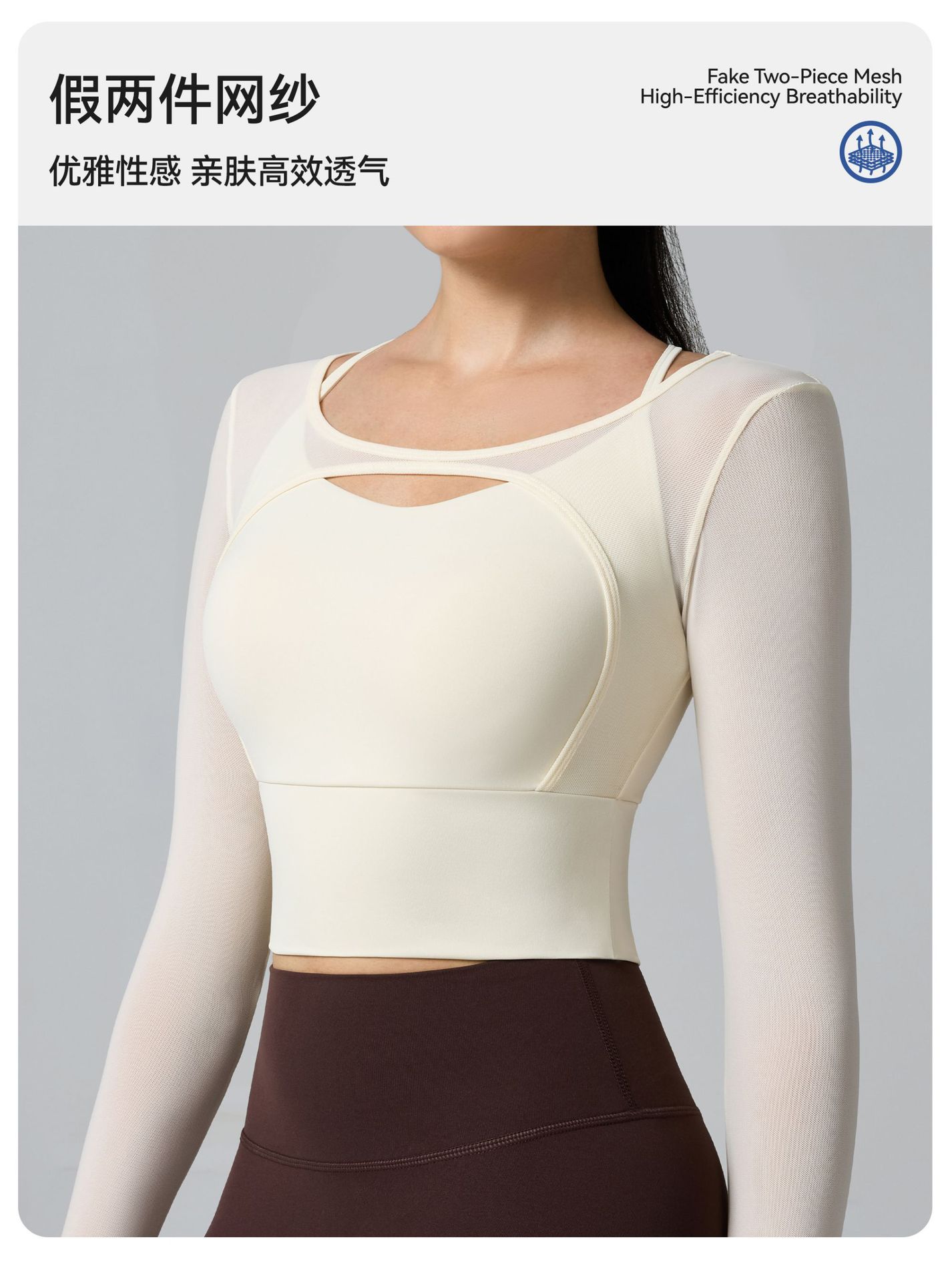 새로운 섹시한 가짜 투피스 메쉬 요가 옷 긴 소매 타이트한 통기성 스포츠 달리기 피트니스 빠른 건조 탑 티셔츠