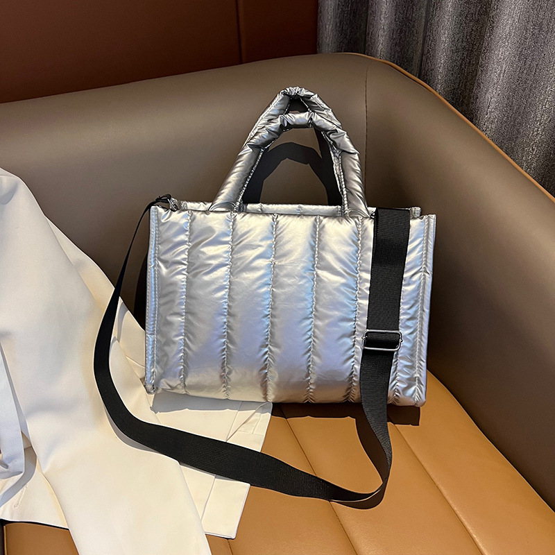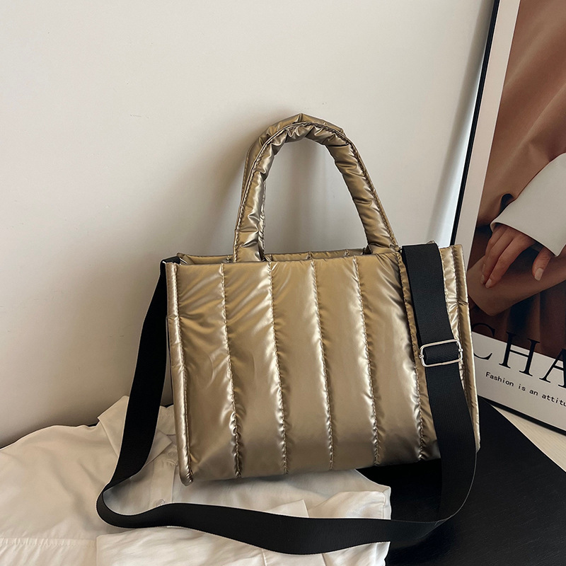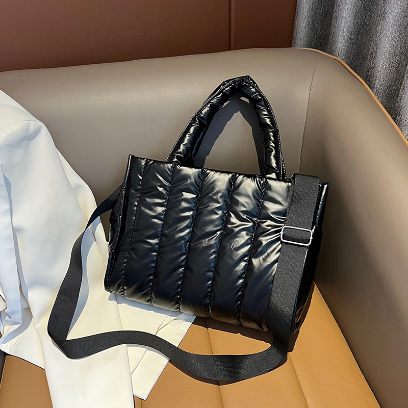 여성용 가방 2023 겨울 새로운 광택 캐주얼 코튼 패딩 핸드백 간단한 대용량 와이드 숄더스트랩 숄더 메신저 백