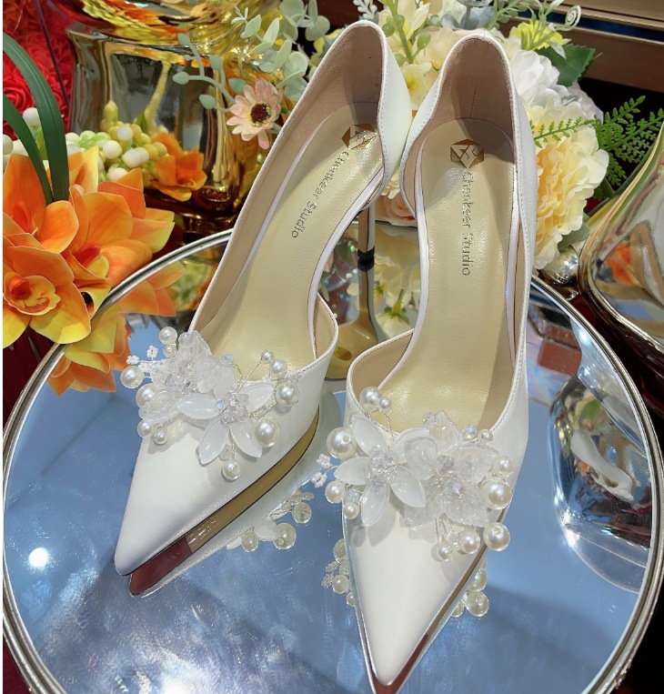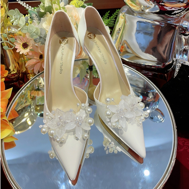 프랑스 웨딩 신발 Xiuhe 메인 웨딩 원피스 사이드 빈 신부 신발 피곤하지 않은 발 2023 새로운 흰색 하이힐 스틸레토 힐