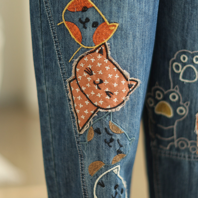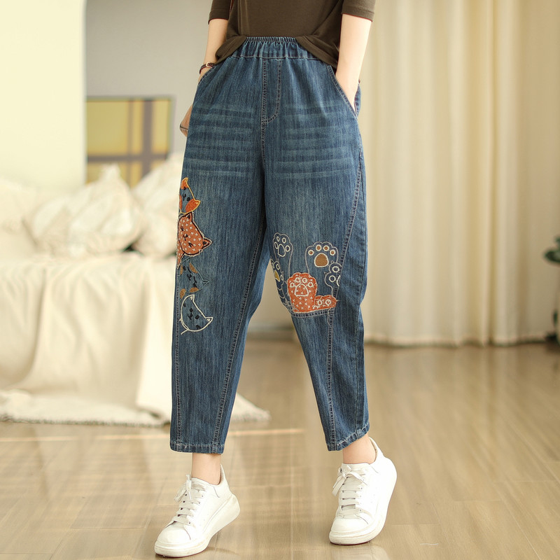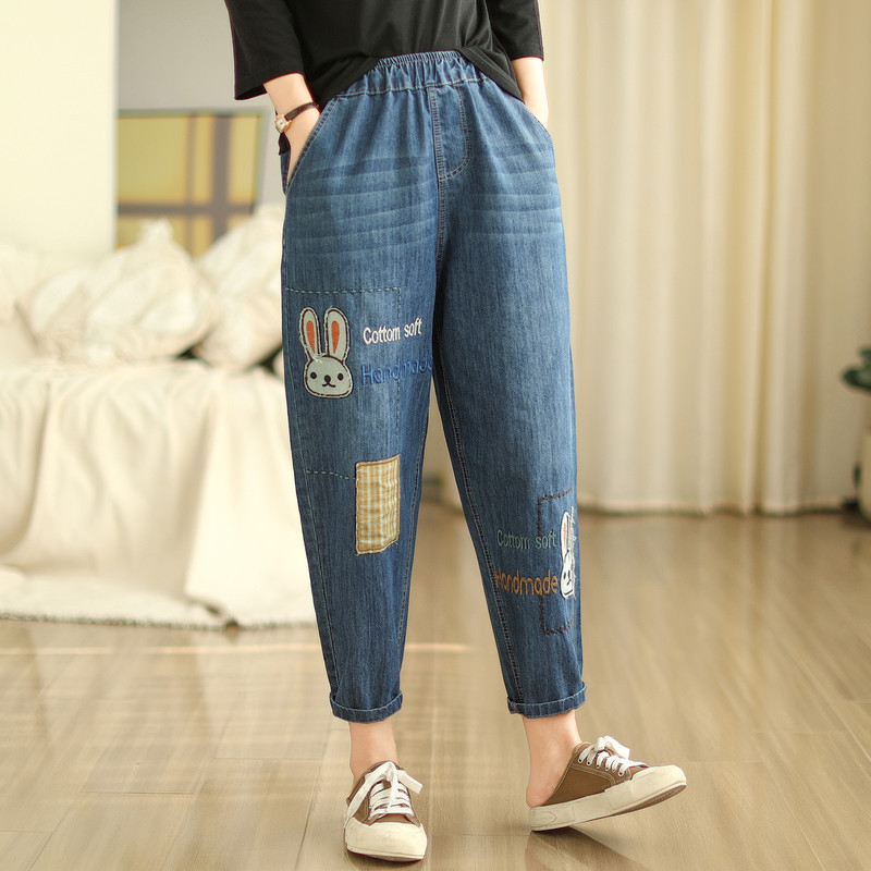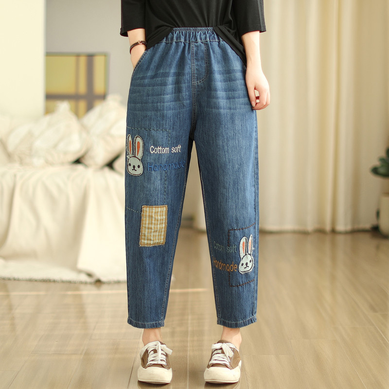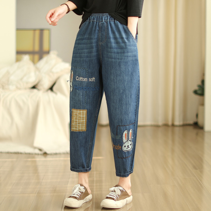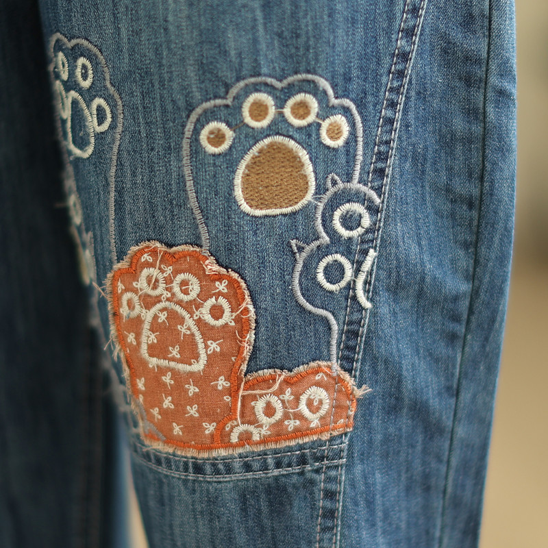 일본의 새로운 패치 자수 만화 탄성 허리 청바지 자른 바지 넓은 다리 바지 도매