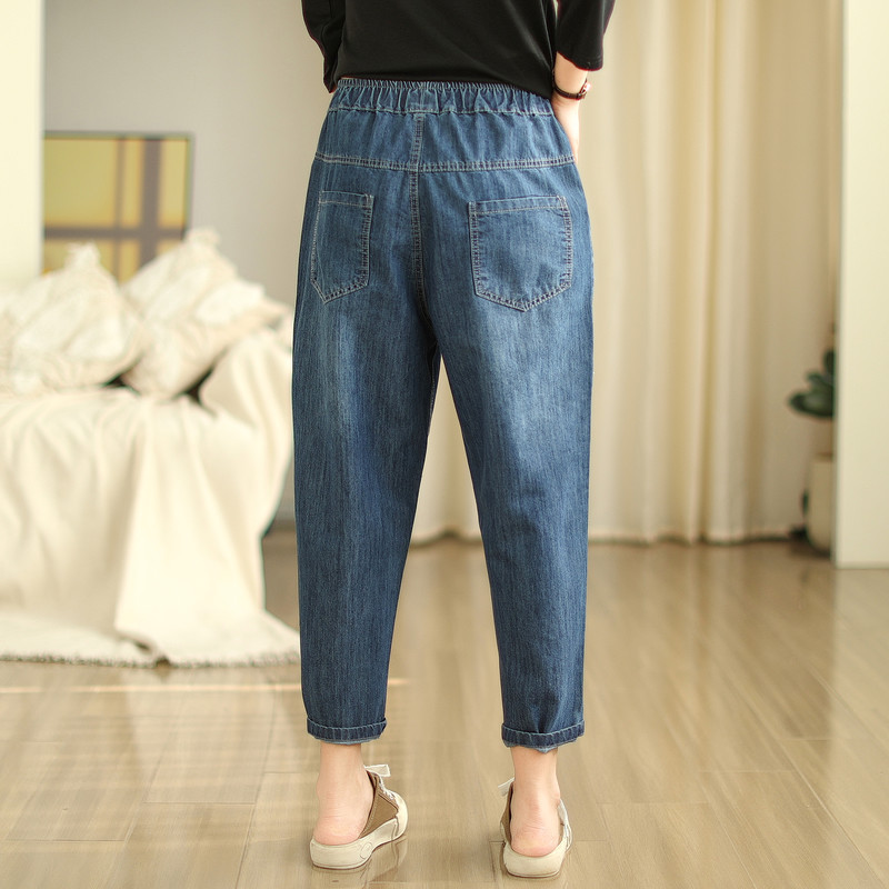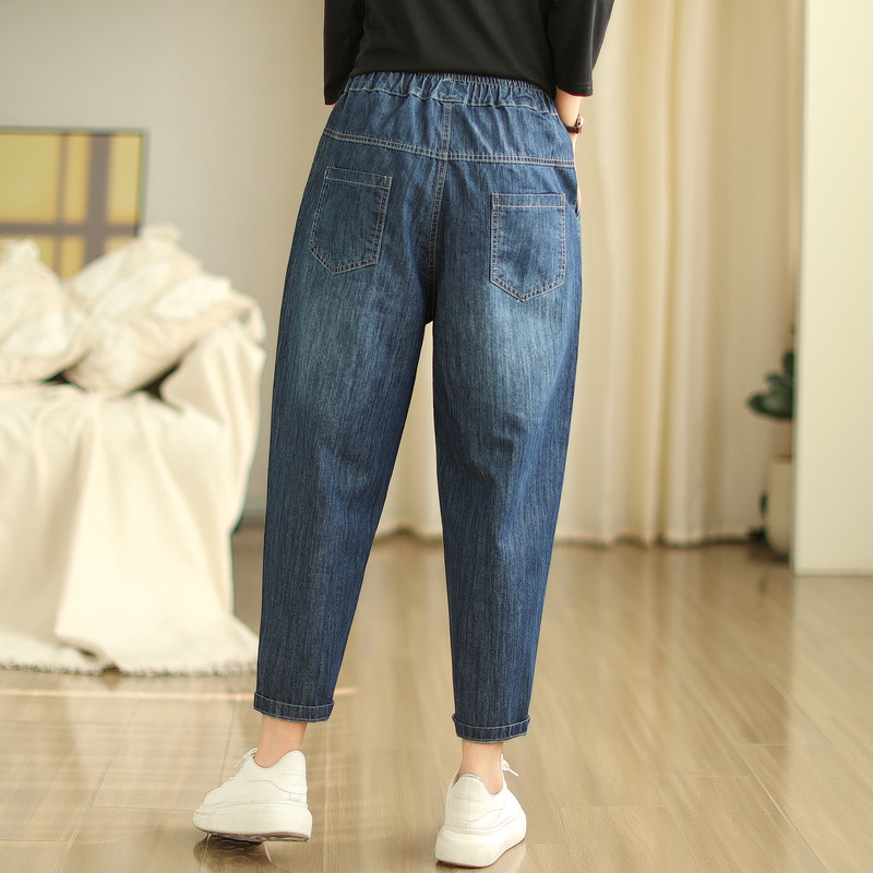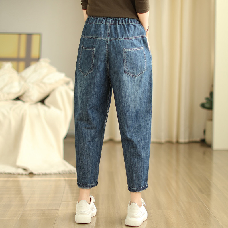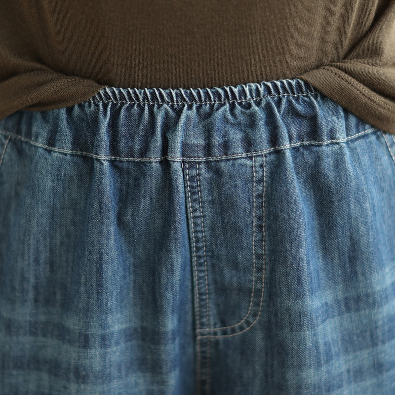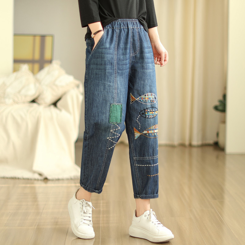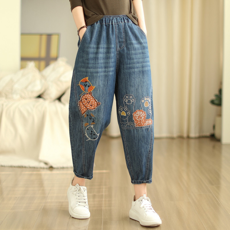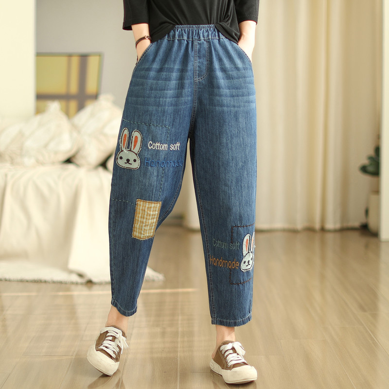일본의 새로운 패치 자수 만화 탄성 허리 청바지 자른 바지 넓은 다리 바지 도매