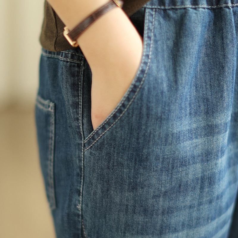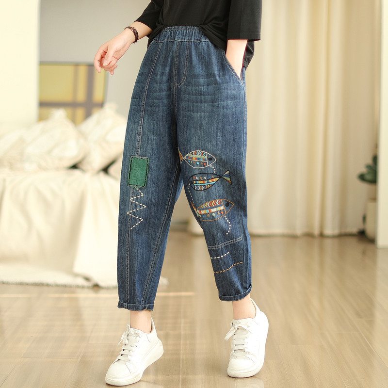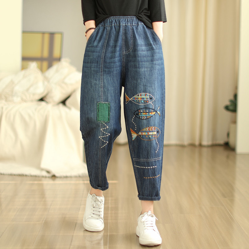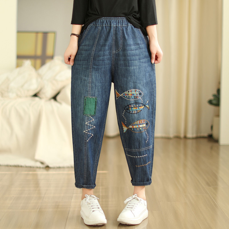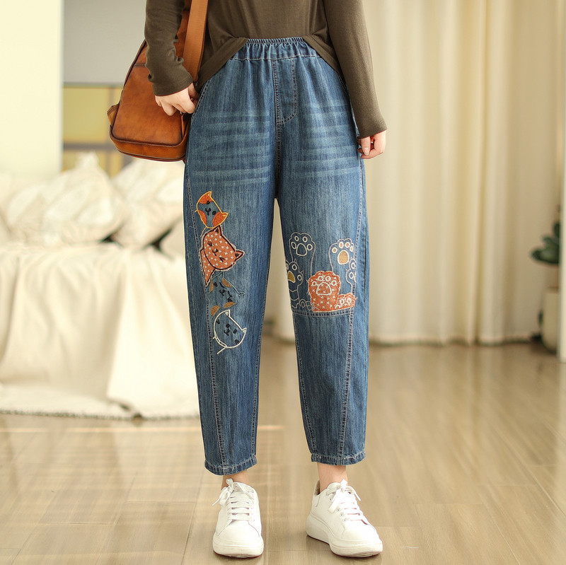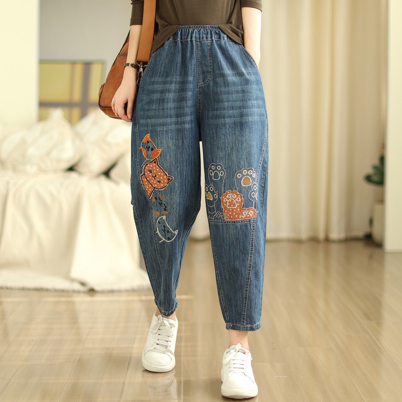 일본의 새로운 패치 자수 만화 탄성 허리 청바지 자른 바지 넓은 다리 바지 도매스토어 가기