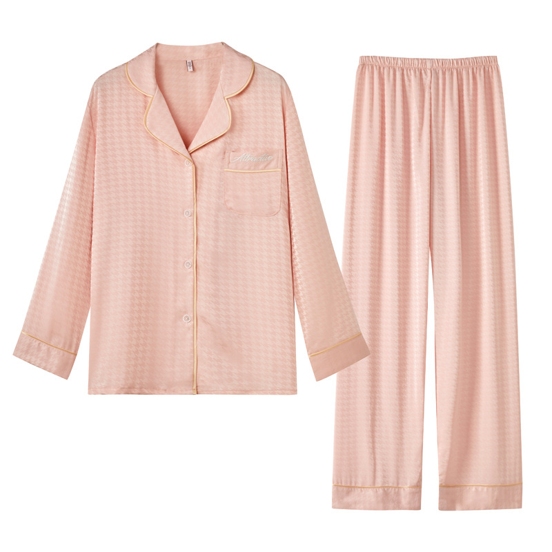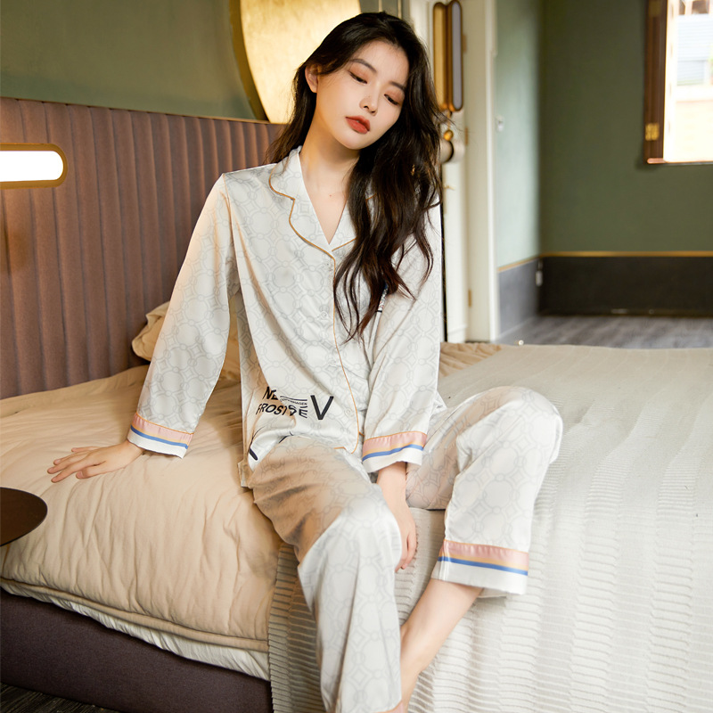 봄과 여름 아이스 실크 잠옷 여성 홈웨어 지원 샘플 카디건 긴팔 바지 홈웨어