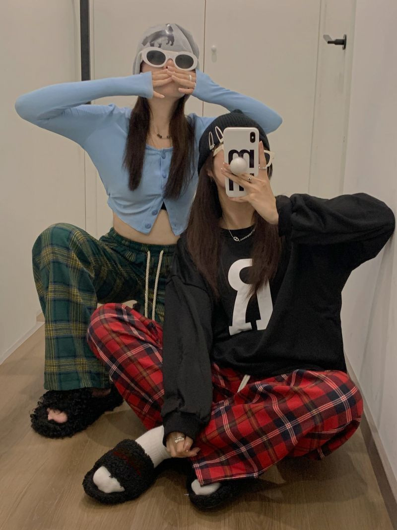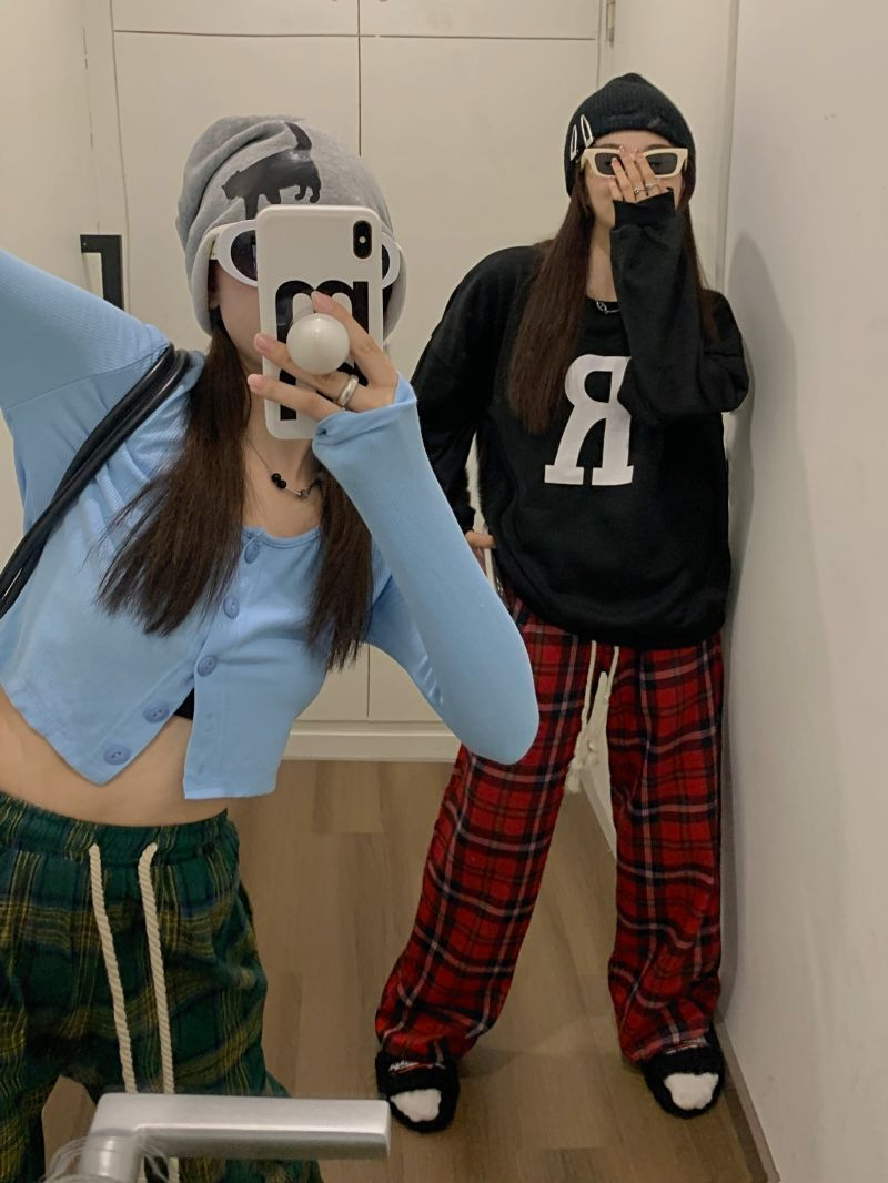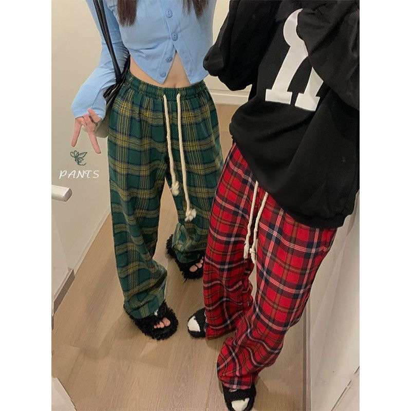 서랍 빨간 격자 무늬 캐주얼 바지 여성의 봄과 가을 새로운 복고풍 느슨한 스트레이트 와이드 다리 바지스토어 가기