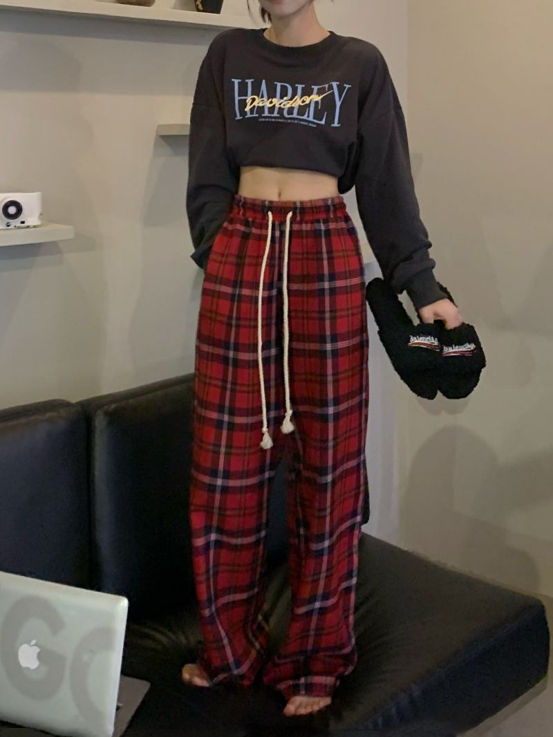 서랍 빨간 격자 무늬 캐주얼 바지 여성의 봄과 가을 새로운 복고풍 느슨한 스트레이트 와이드 다리 바지