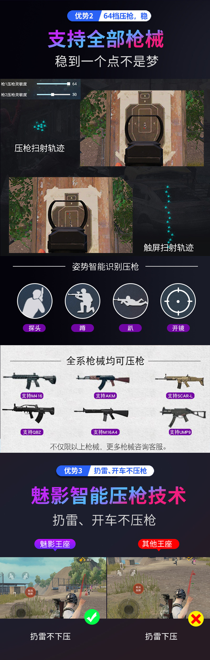 智能姿态压枪、一键报点、一键换倍镜、滚轮选物资缩倍镜。支持云电脑、王者荣耀、香肠派对、穿越火线、我的世界、和平精英、PUBG、第五人格、明日之后等游戏。