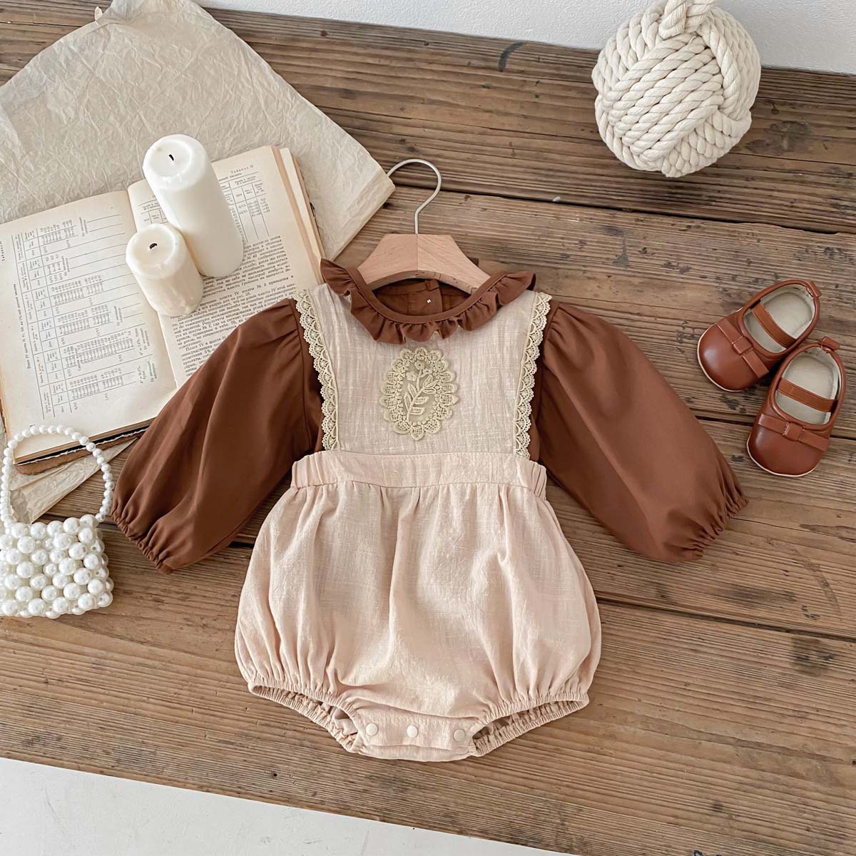 한국 스타일 아기 가을 원피스 세트 여자 아기 자수 레이스 스트랩 롬퍼 신생아 긴팔 바디수트