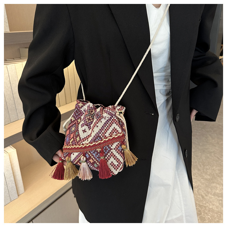 민족 스타일 개인화 된 여성 메신저 백 2023 새로운 패션 술 버킷 백 프린트 숄더백
