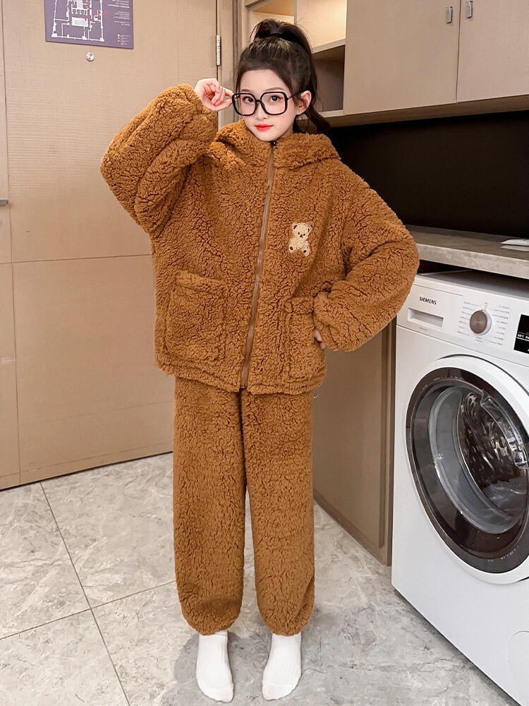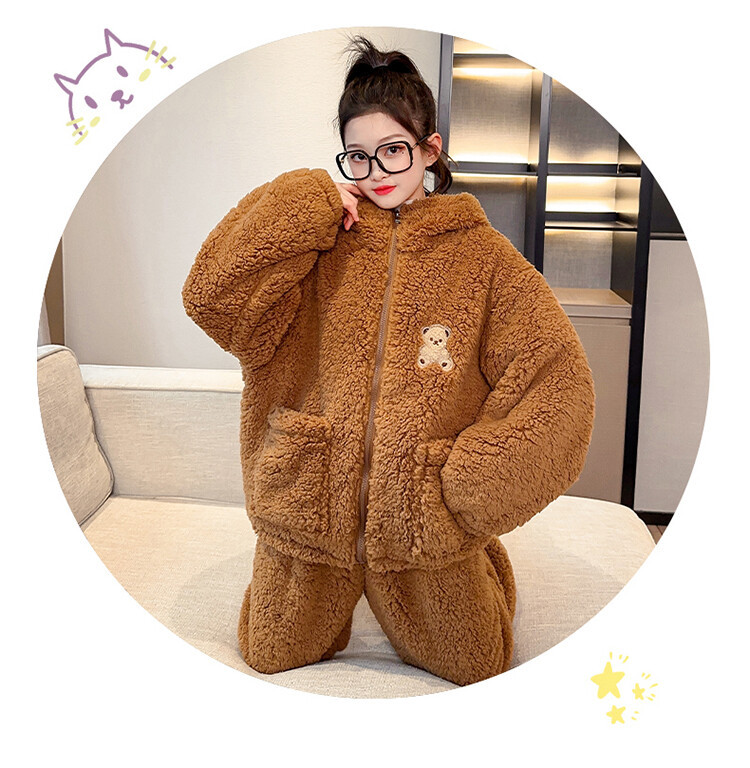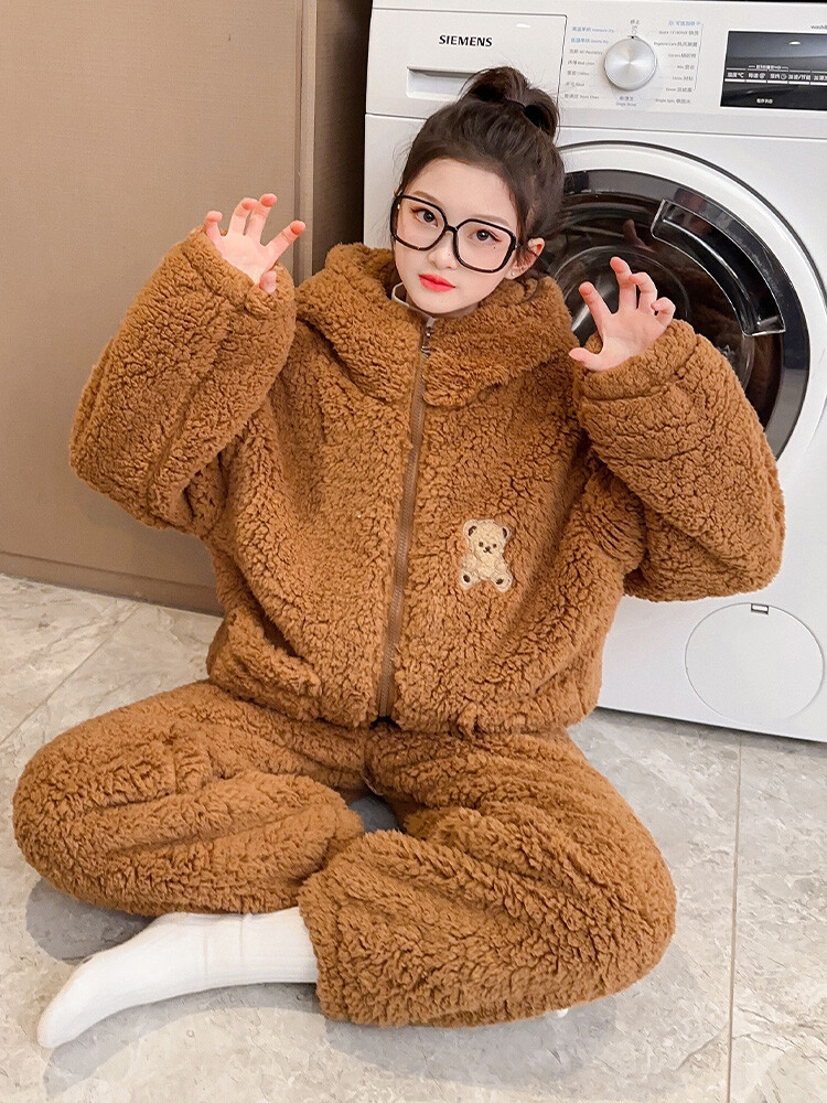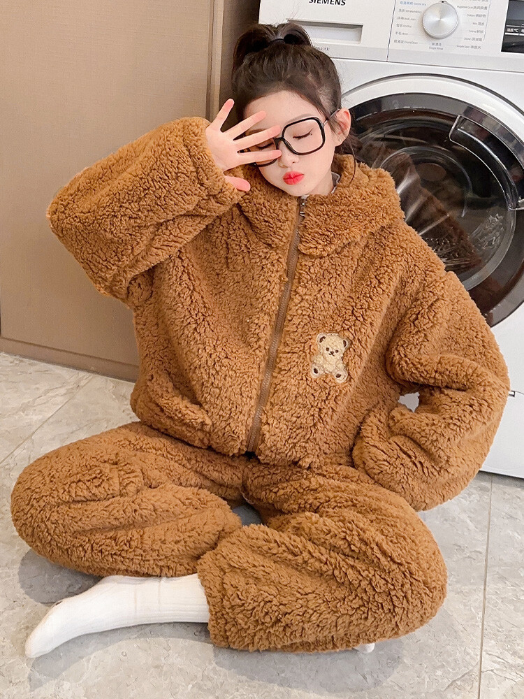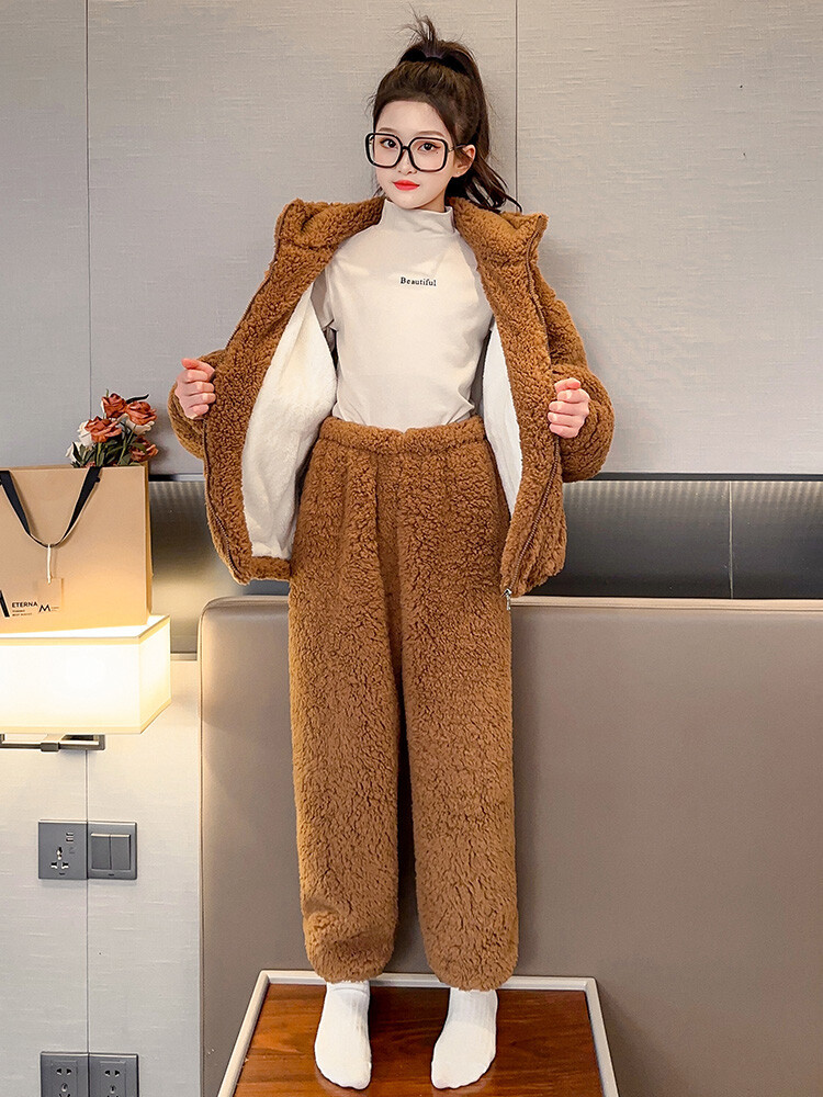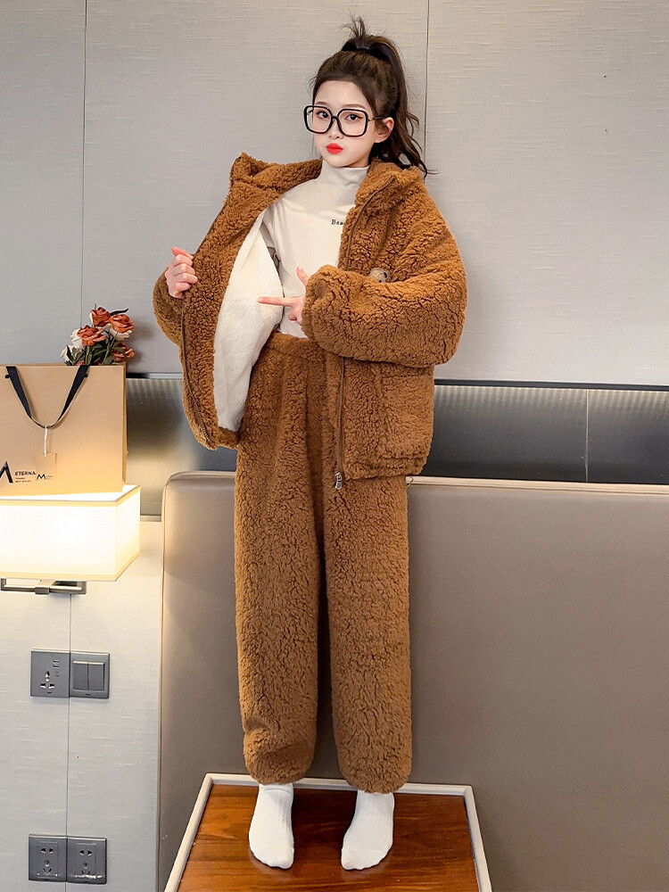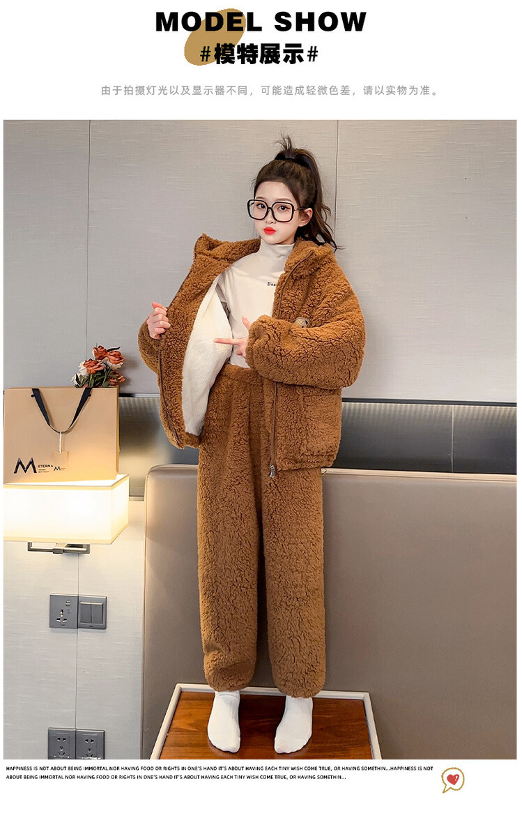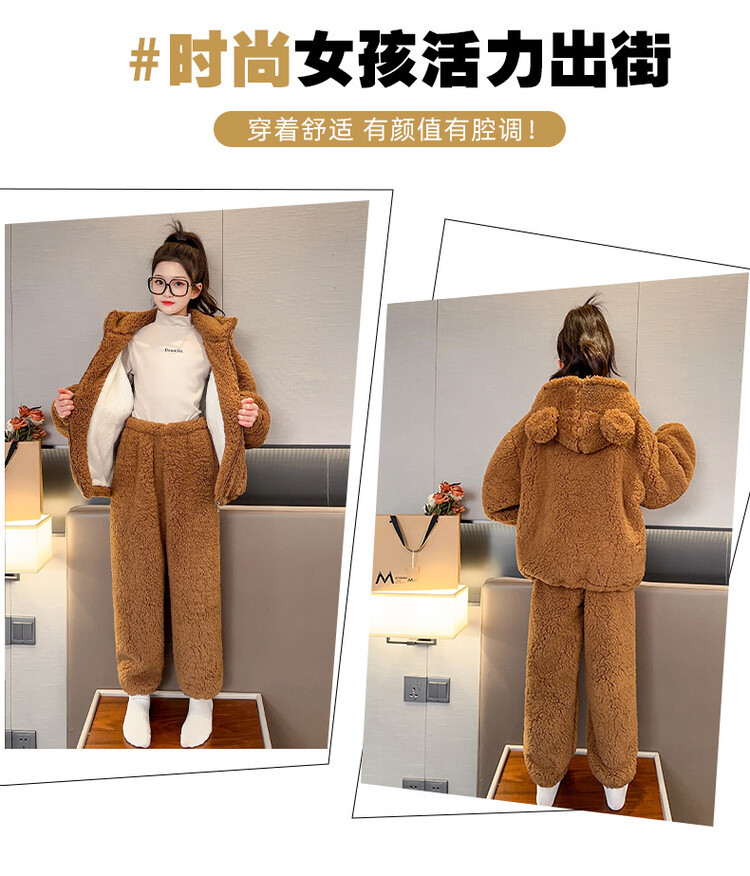 걸스 벨벳 라인드 두꺼운 후드 홈 옷 가을과 겨울 어린이 따뜻한 세트 2023 새로운 큰 어린이 잠옷스토어 가기