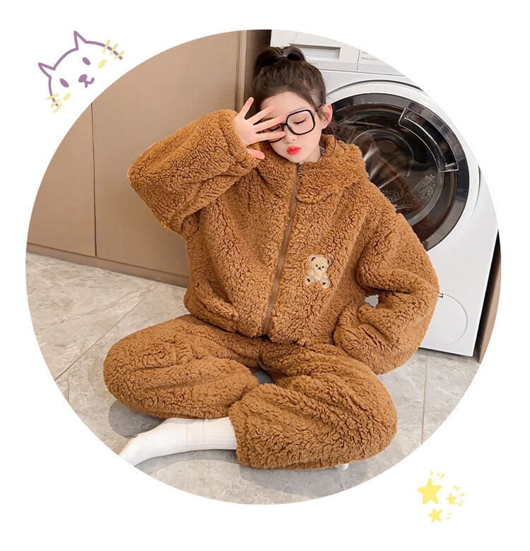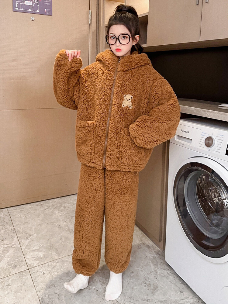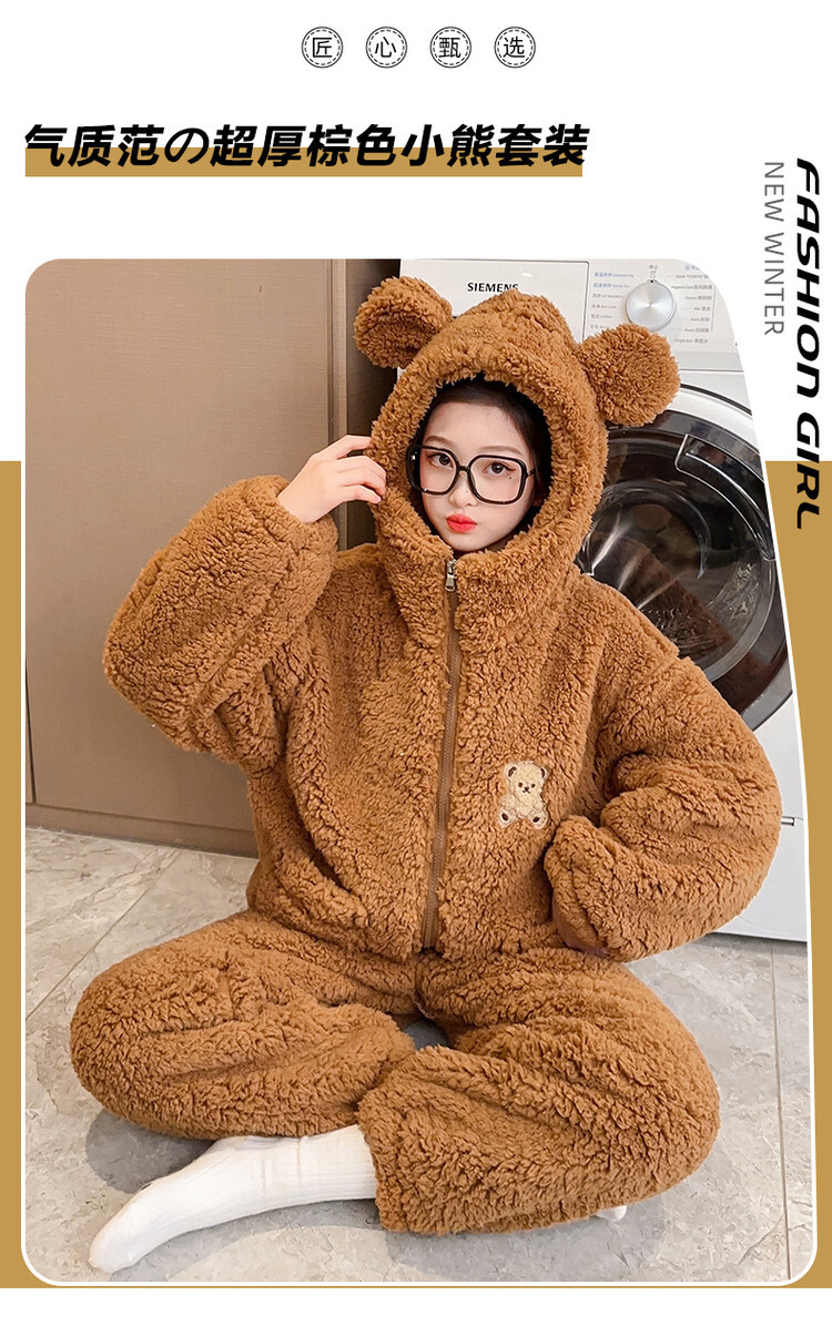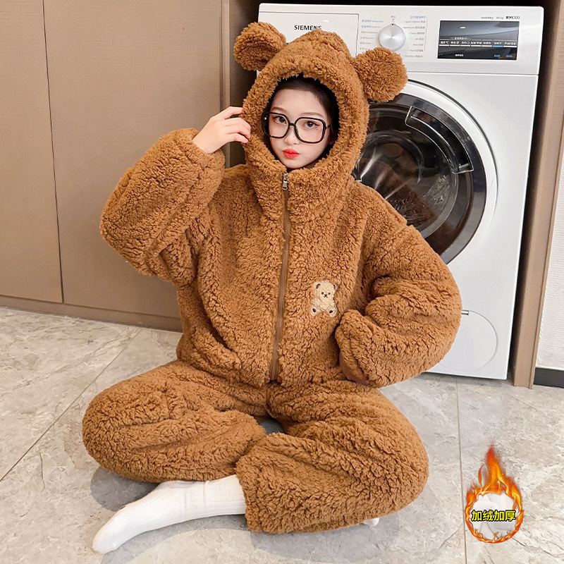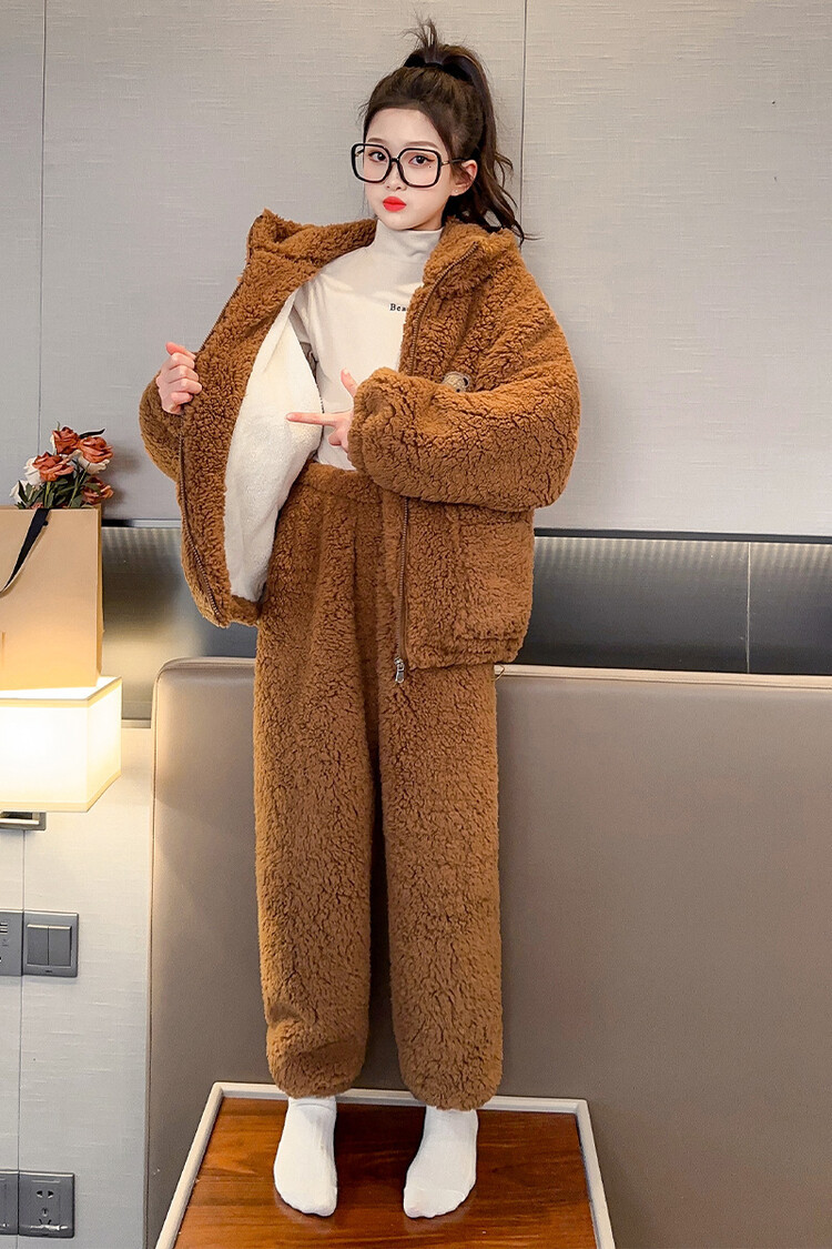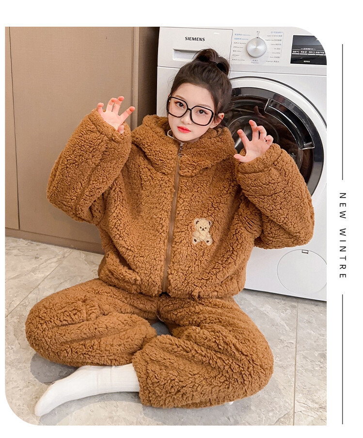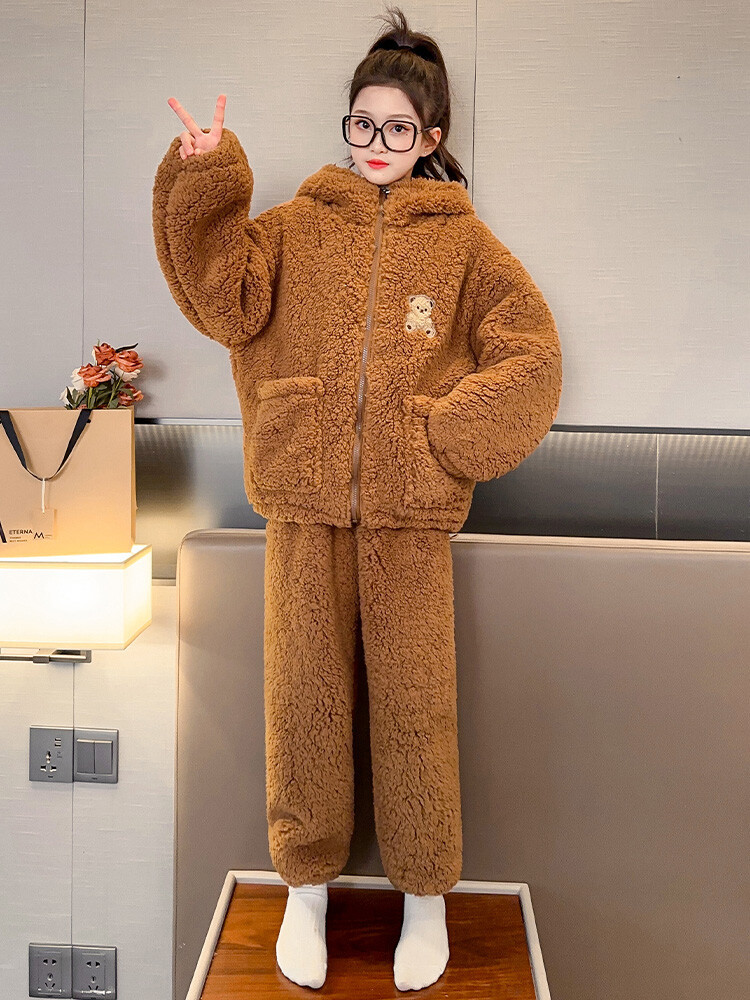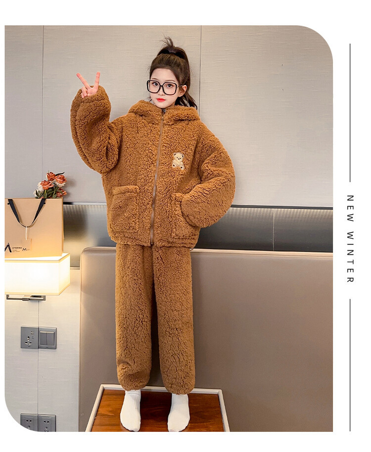 걸스 벨벳 라인드 두꺼운 후드 홈 옷 가을과 겨울 어린이 따뜻한 세트 2023 새로운 큰 어린이 잠옷스토어 가기