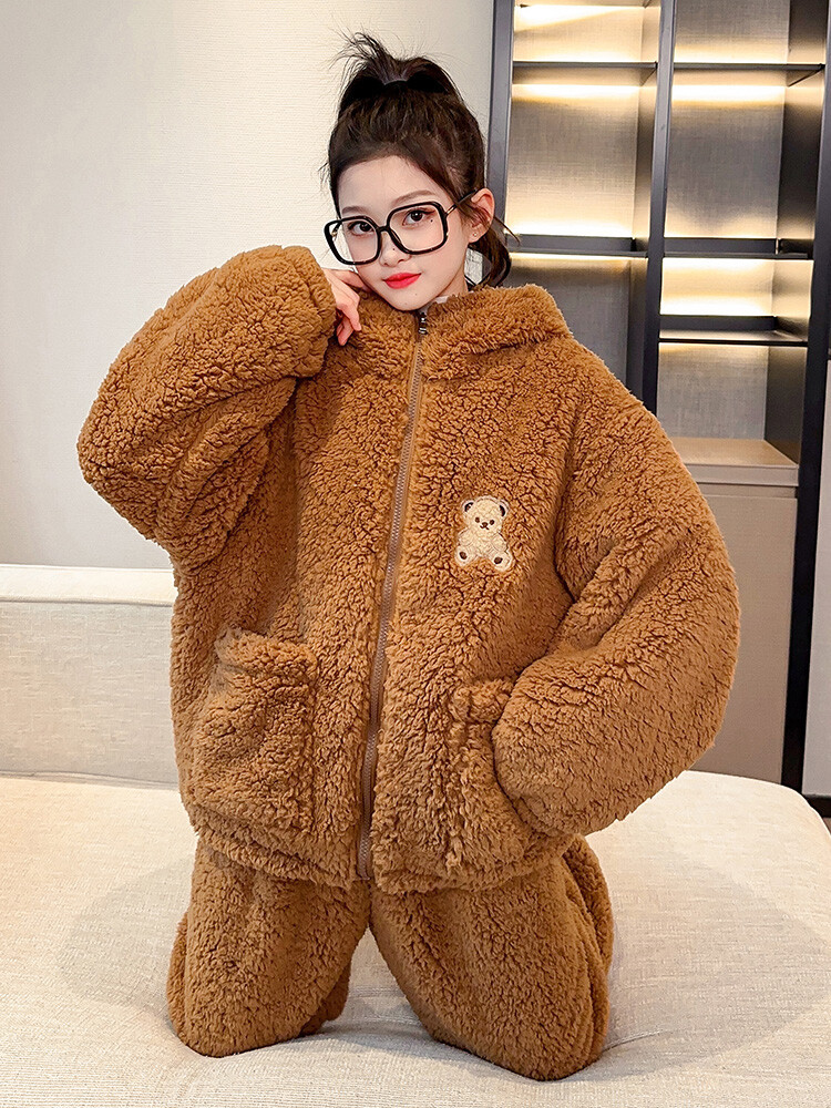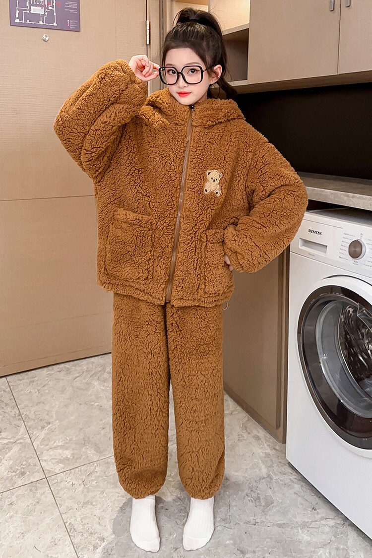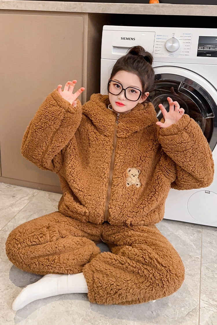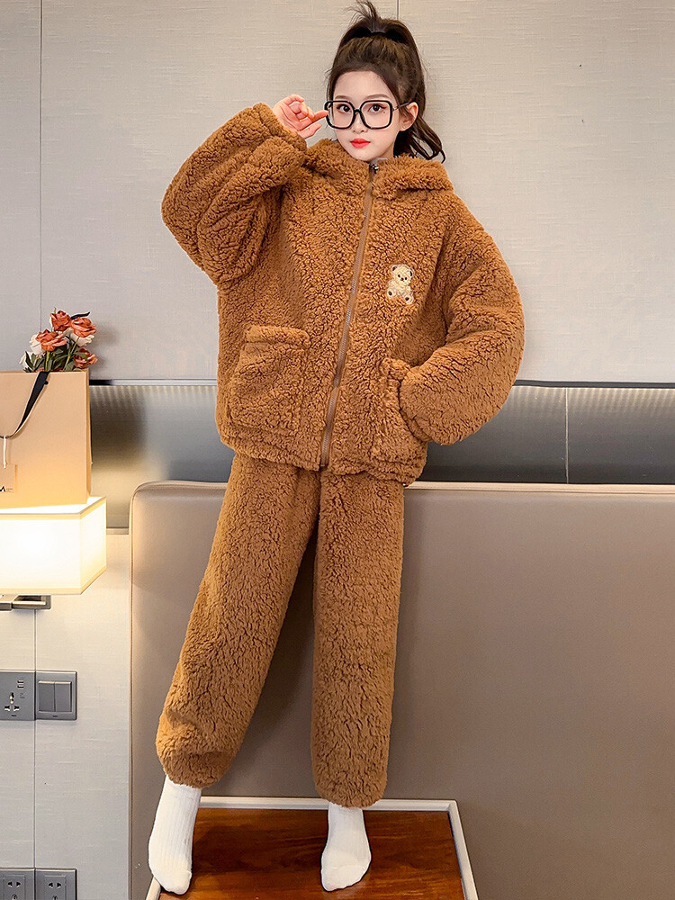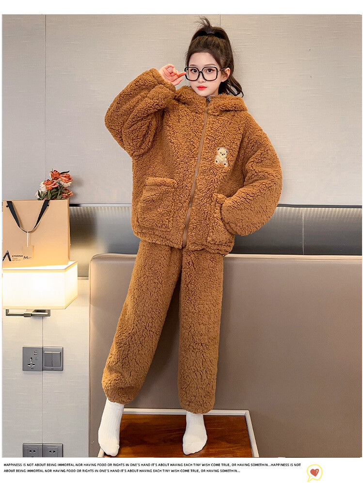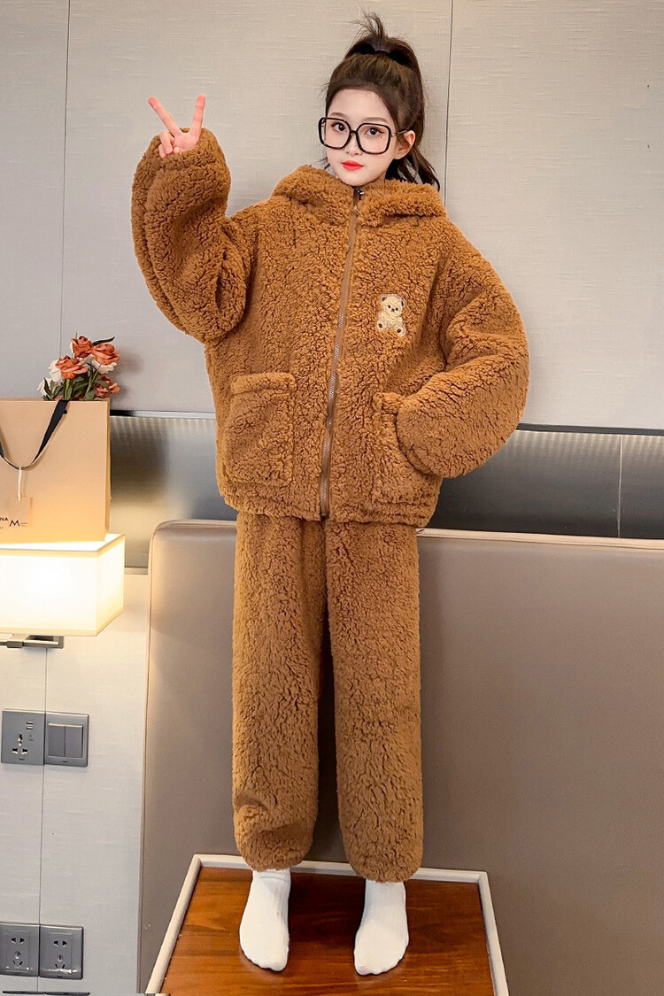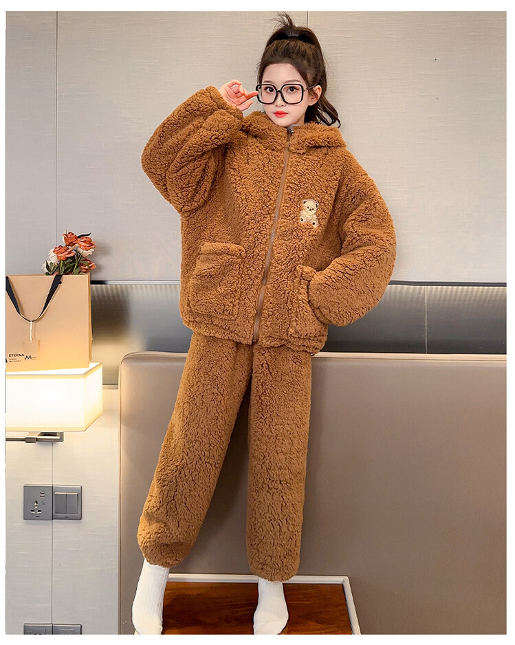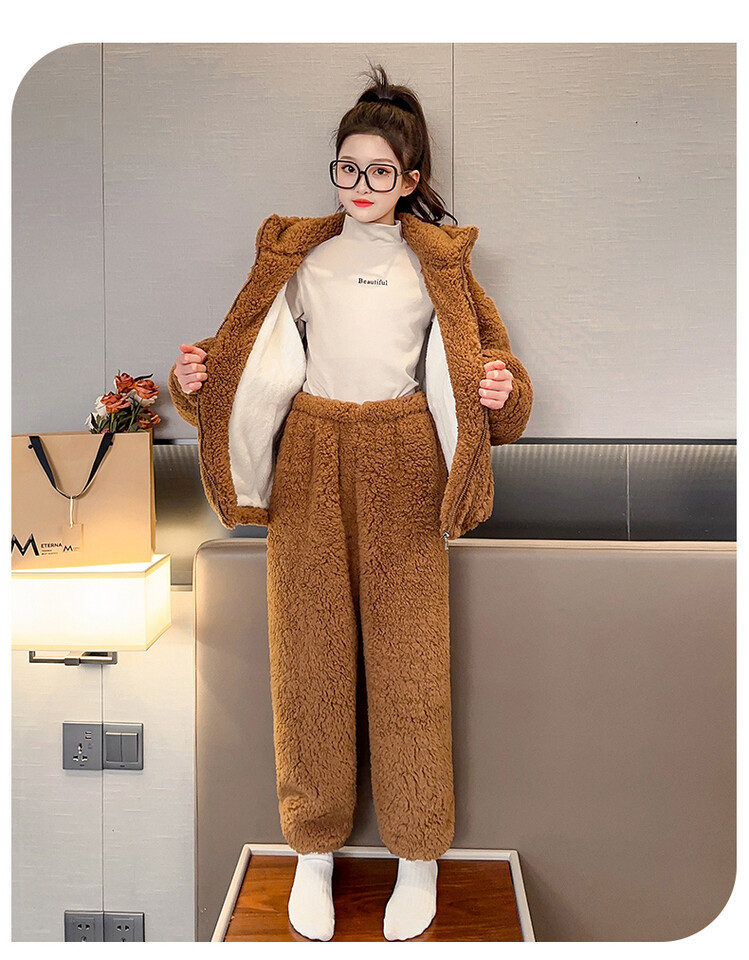 걸스 벨벳 라인드 두꺼운 후드 홈 옷 가을과 겨울 어린이 따뜻한 세트 2023 새로운 큰 어린이 잠옷스토어 가기