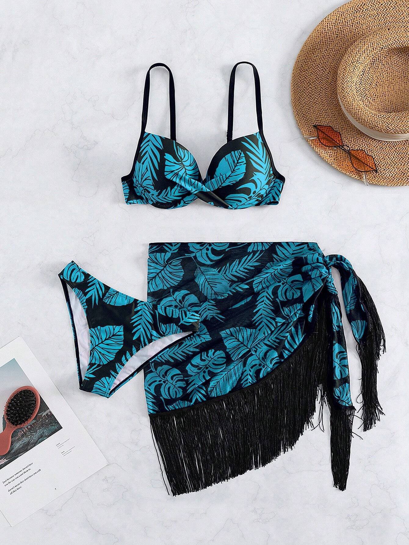 2024 유럽과 미국의 국경을 넘는 새로운 3 피스 섹시한 수영복 아마존 섹시 푸시 업 프린트 술 스커트 수영복스토어 가기