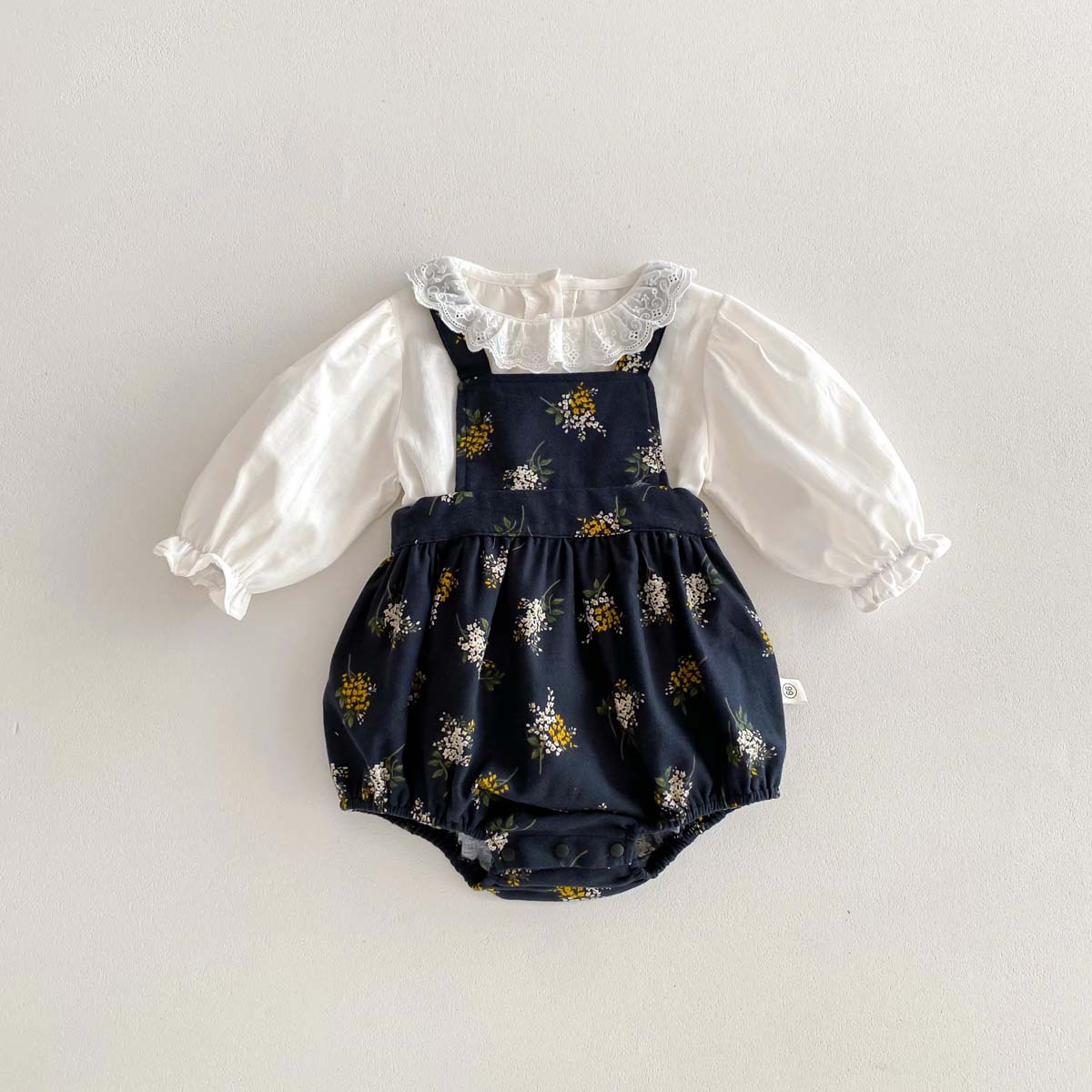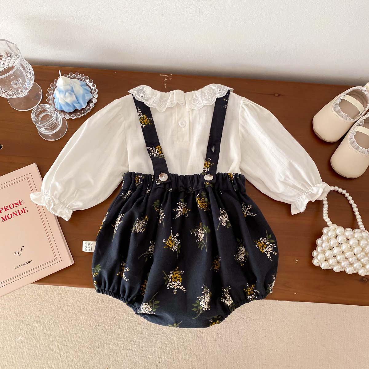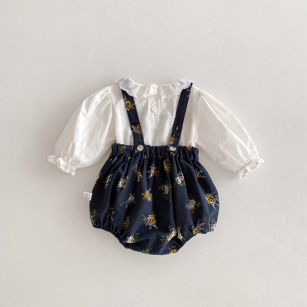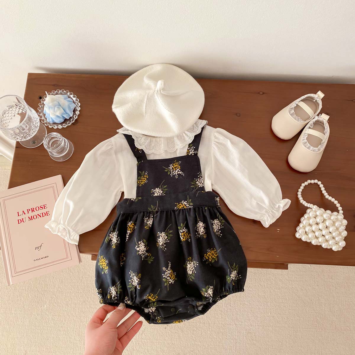 아기 봄 옷 작은 꽃 스트랩 점프 수트 여성 아기의 한국식 긴팔 두 조각 가방 뚱뚱한 옷 신생아 옷스토어 가기