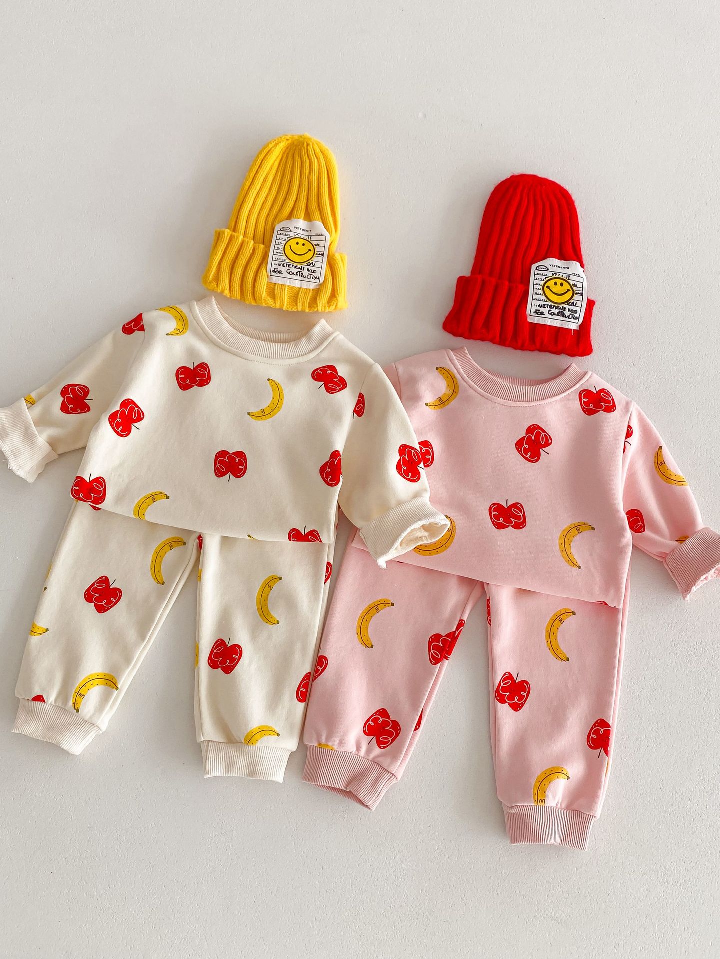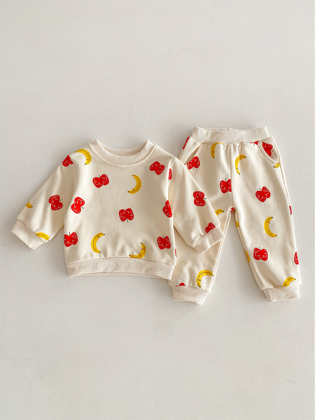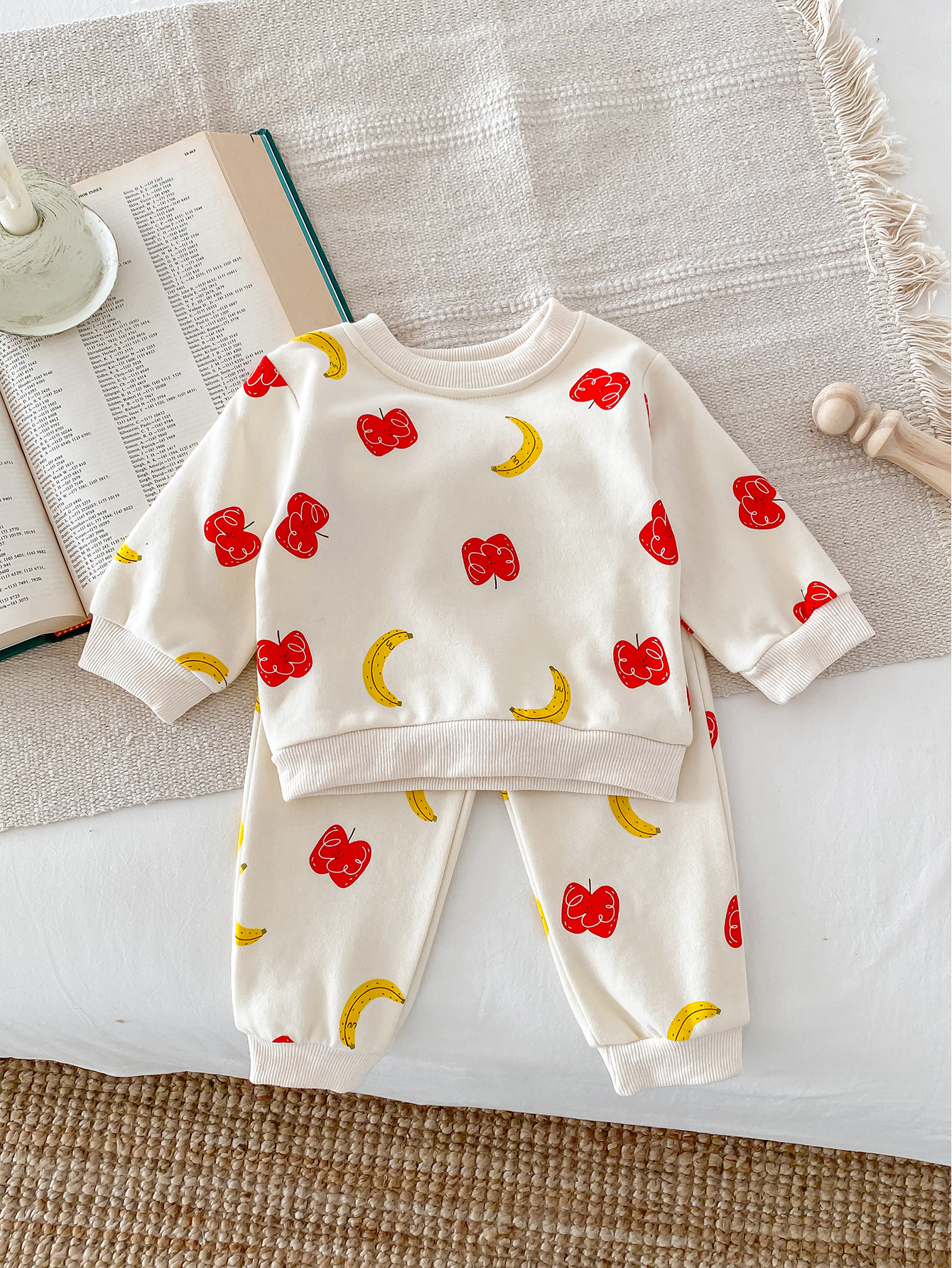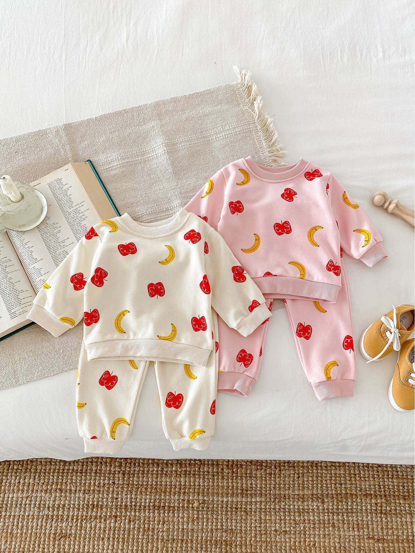 재고 한국 아동복 애플 바나나 캐주얼 세트 코튼 프린트 스웨터 바지 발목 묶인 바지 투피스 세트 봄과 가을