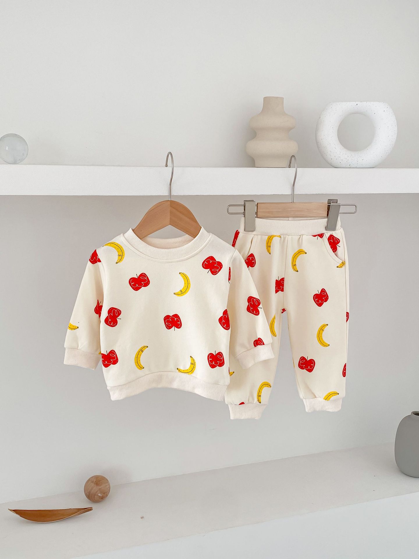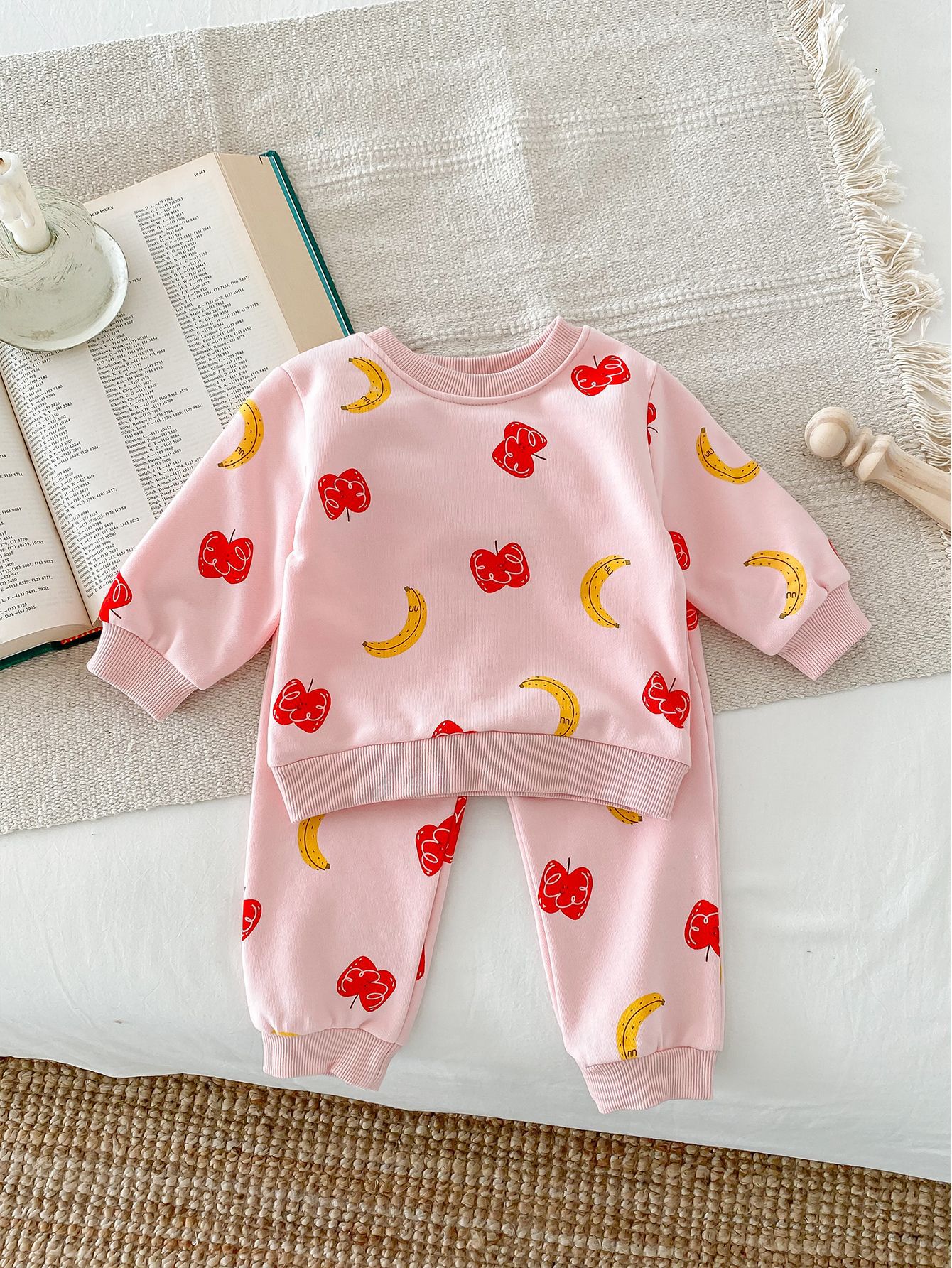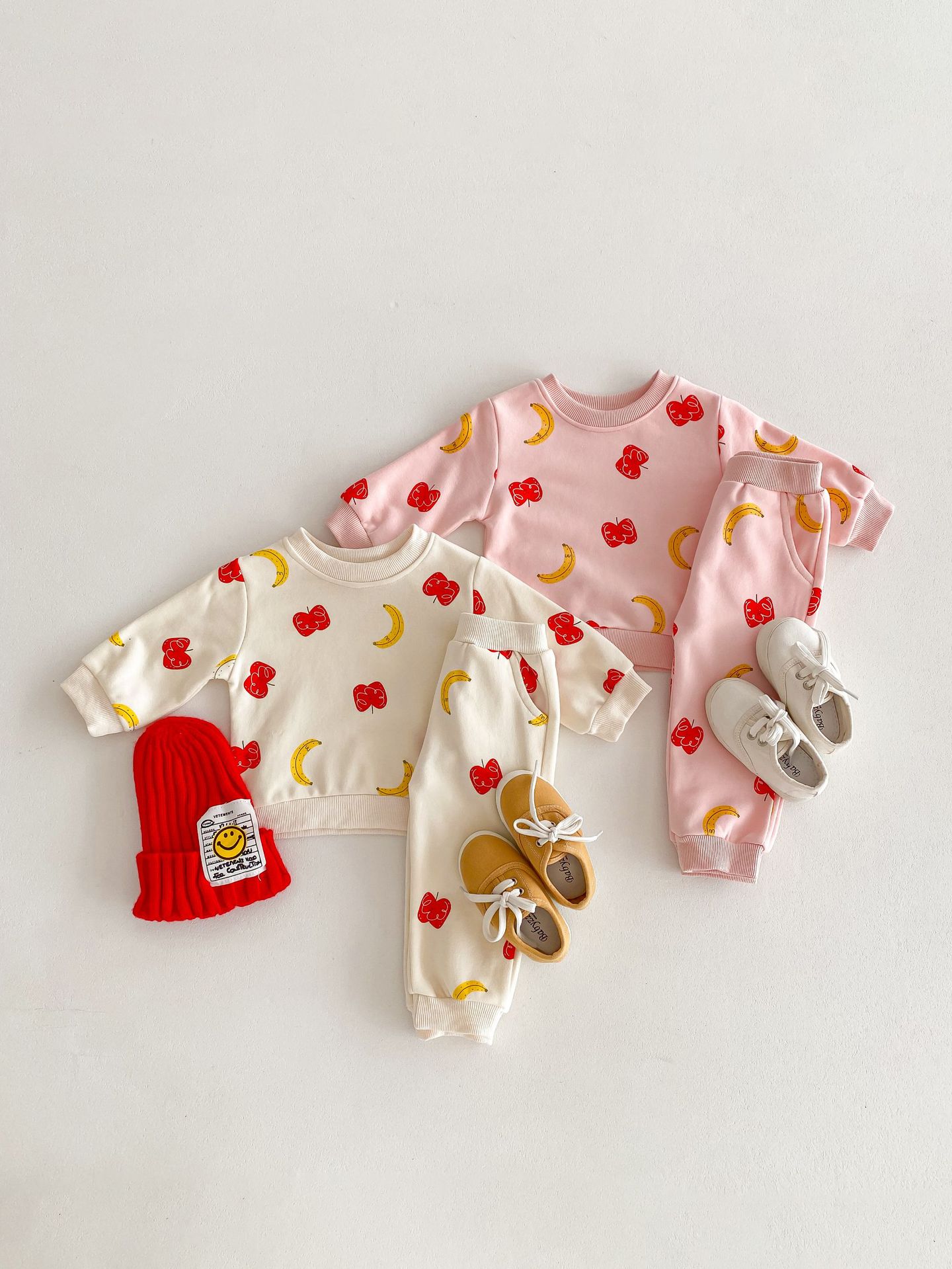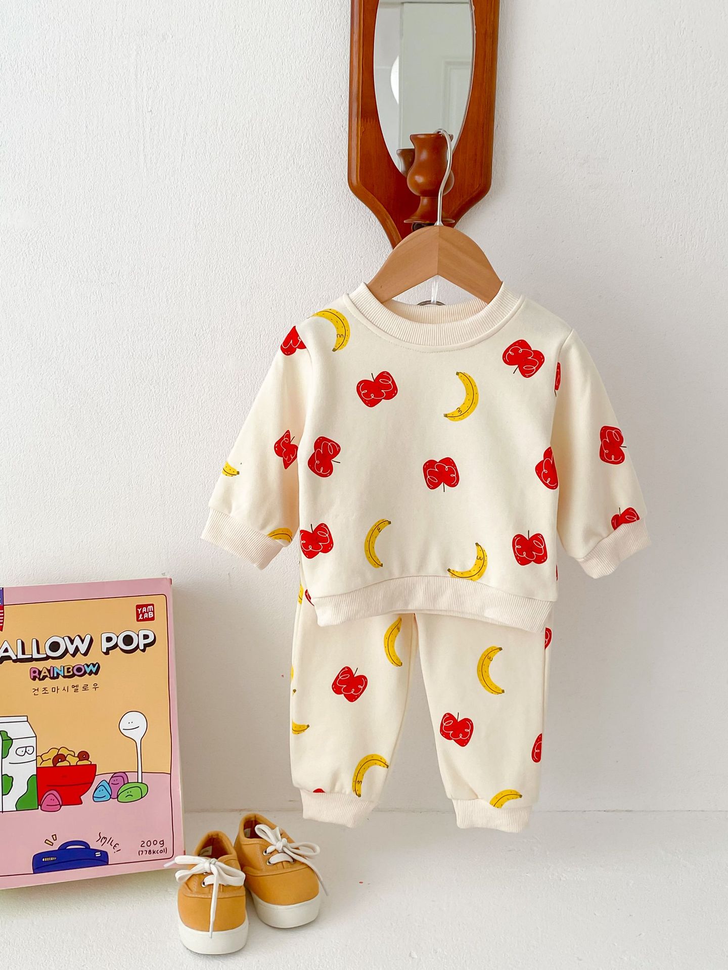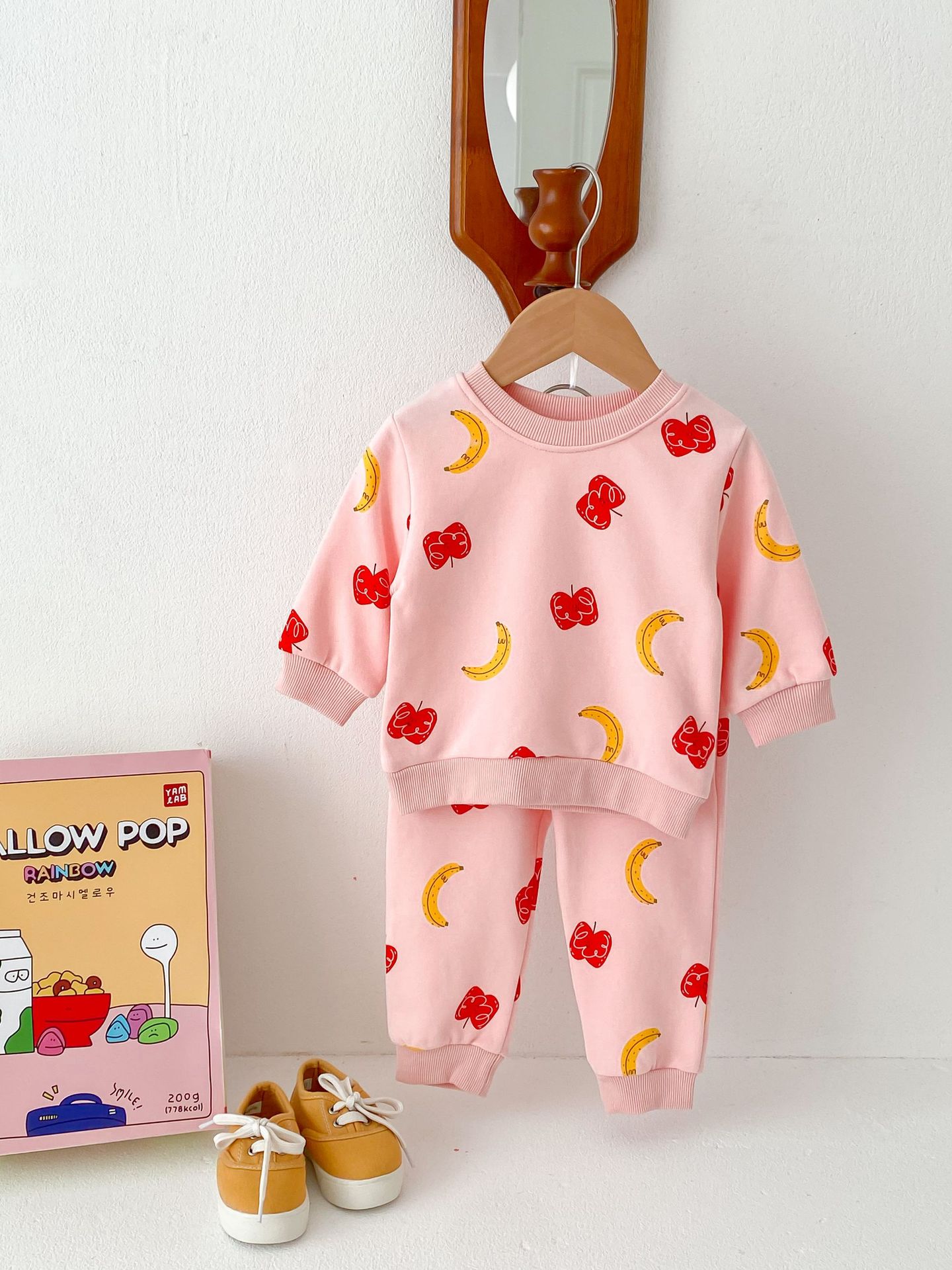 재고 한국 아동복 애플 바나나 캐주얼 세트 코튼 프린트 스웨터 바지 발목 묶인 바지 투피스 세트 봄과 가을