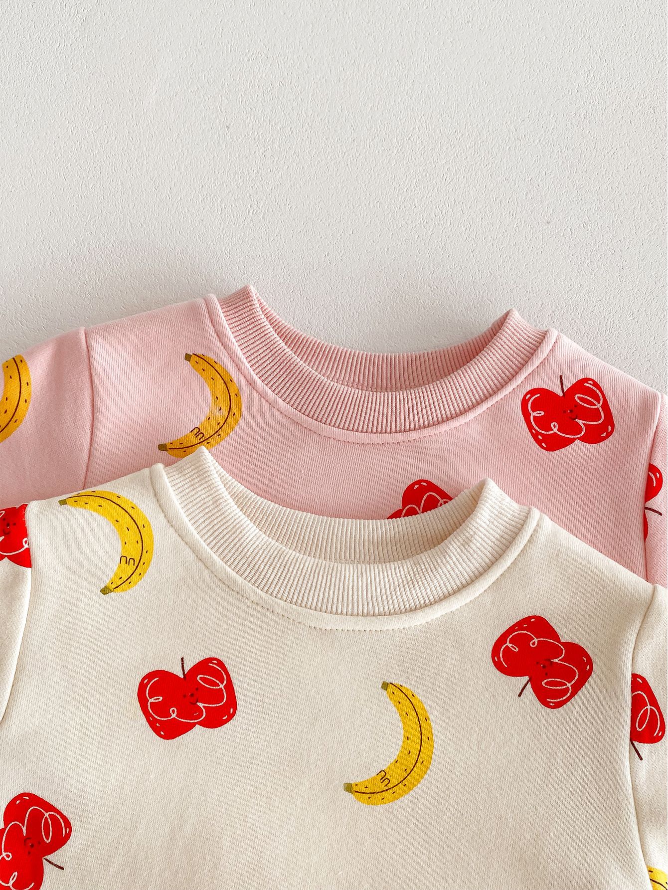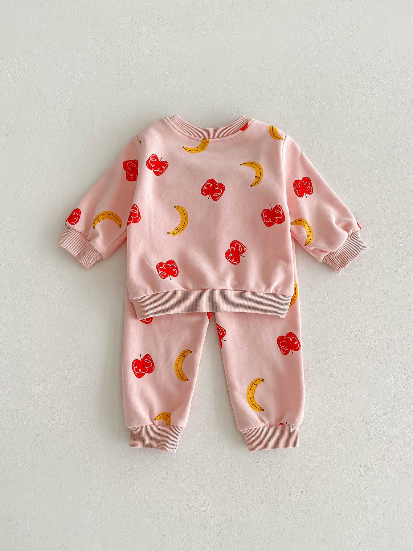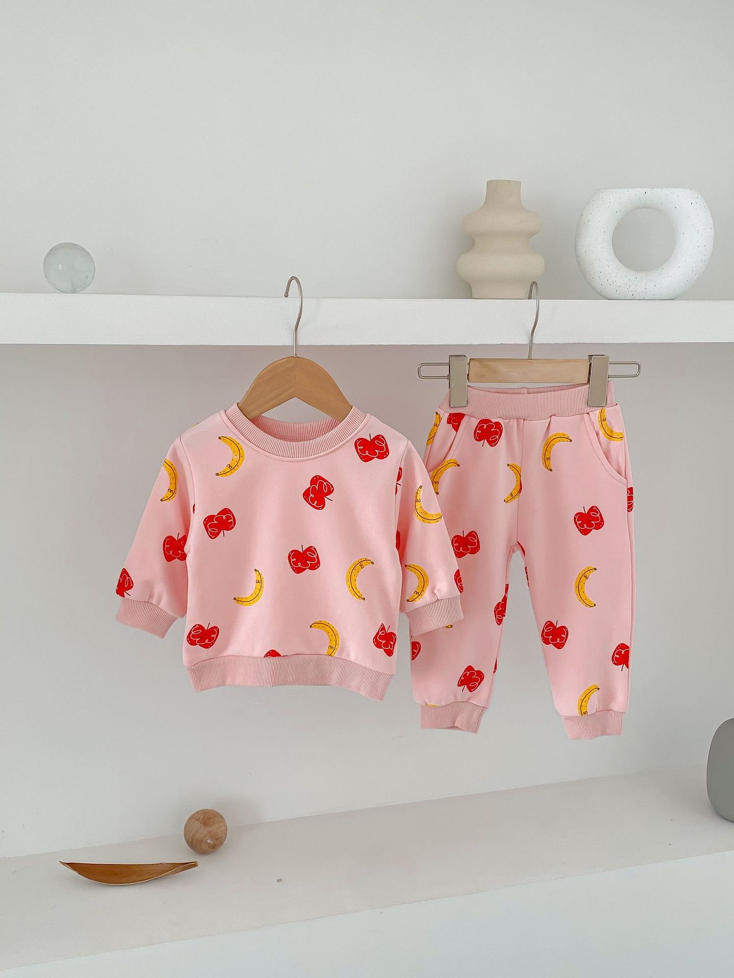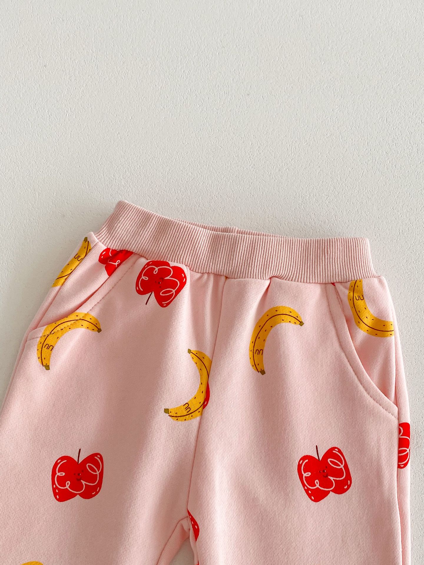 재고 한국 아동복 애플 바나나 캐주얼 세트 코튼 프린트 스웨터 바지 발목 묶인 바지 투피스 세트 봄과 가을
