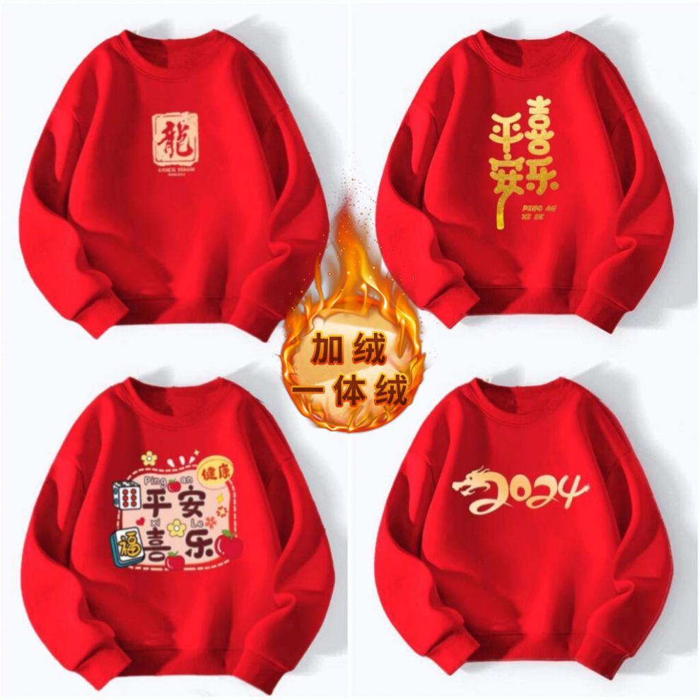 어린이 스웨터 원피스 벨벳 소년 소녀 중국 스타일 2024 새해 둥근 목 붉은 설날 활동 수업 옷 탑 T